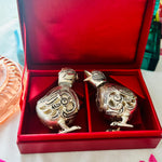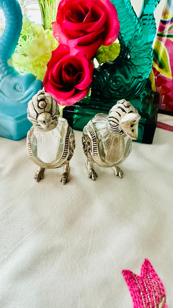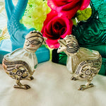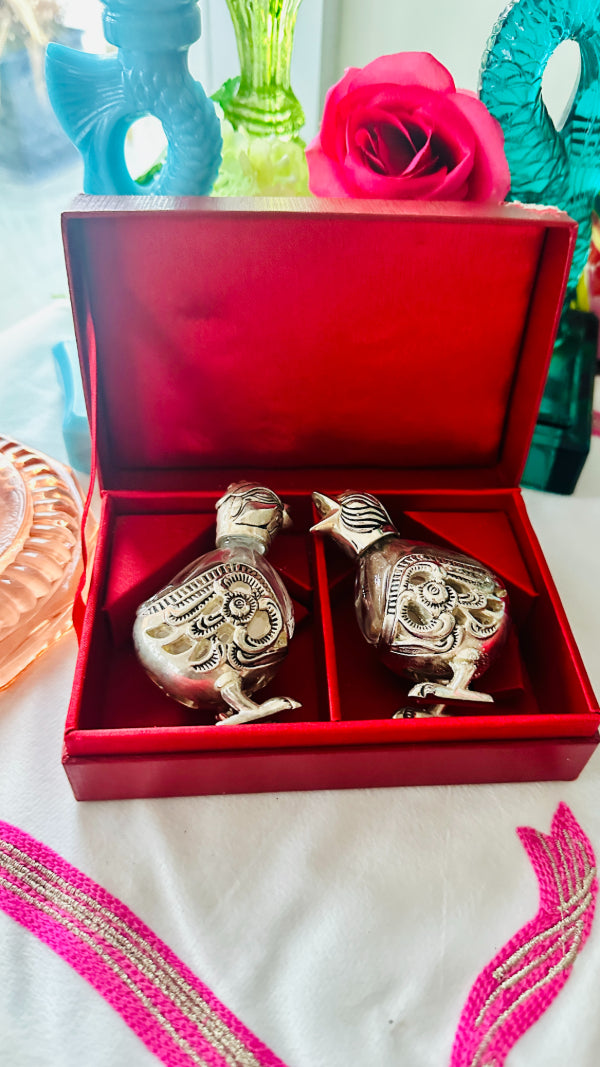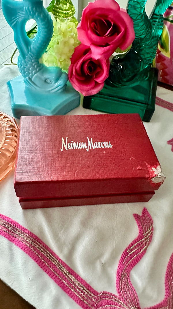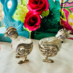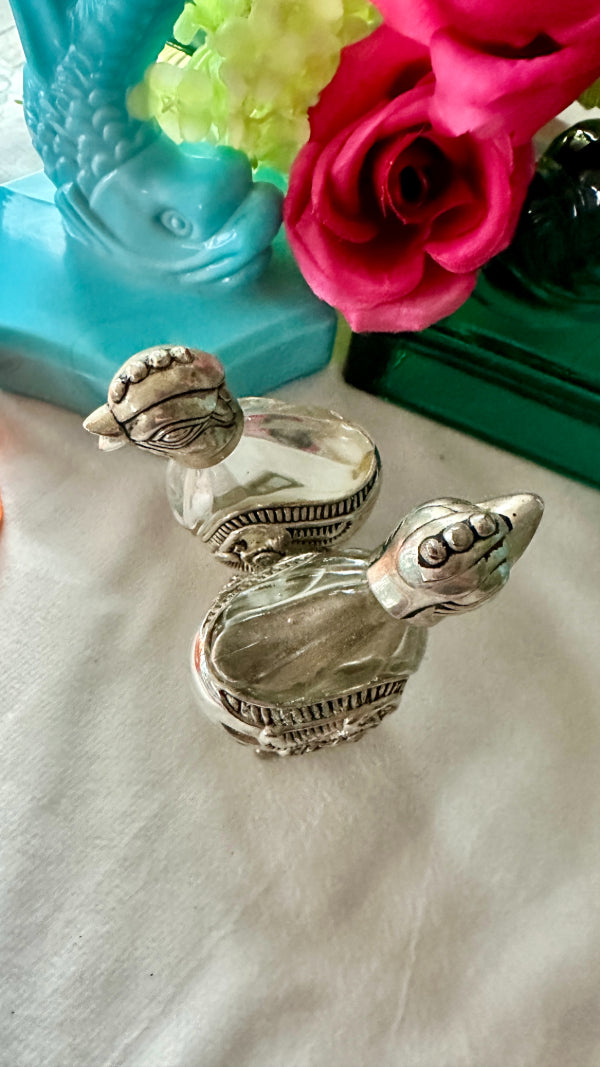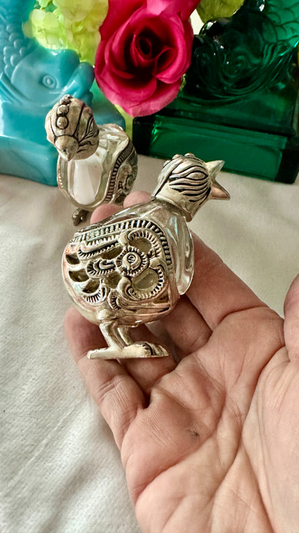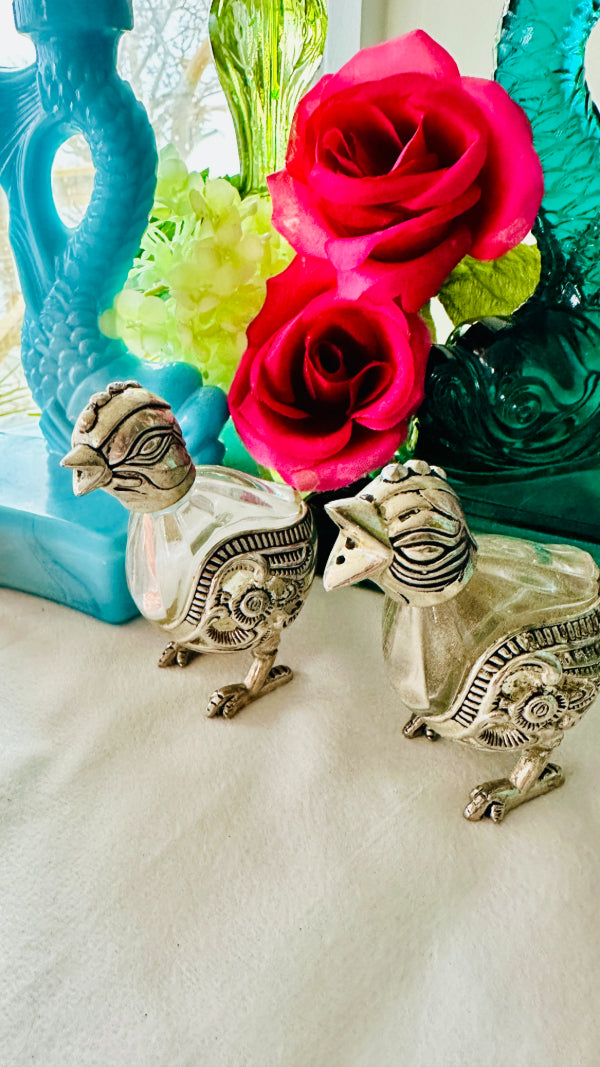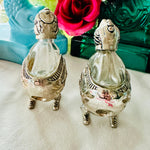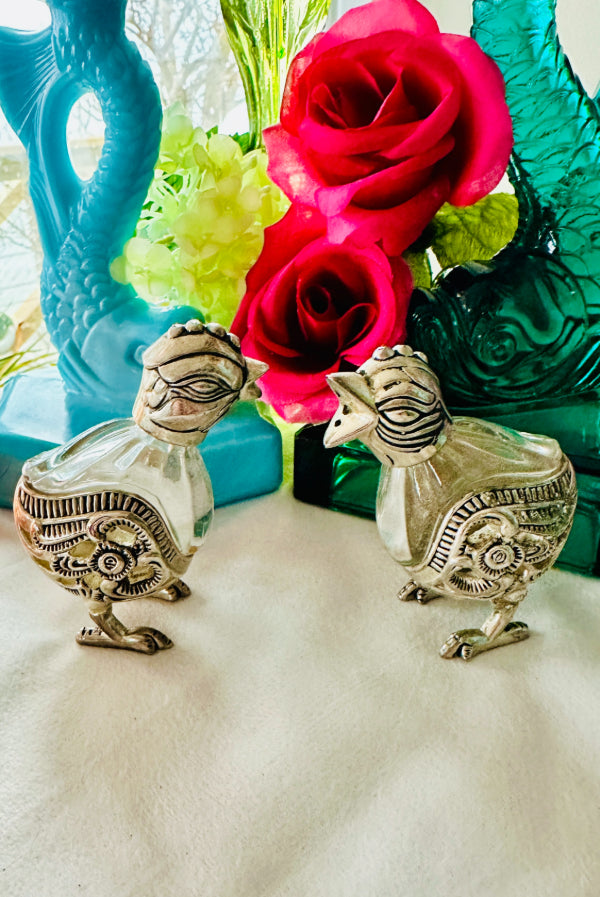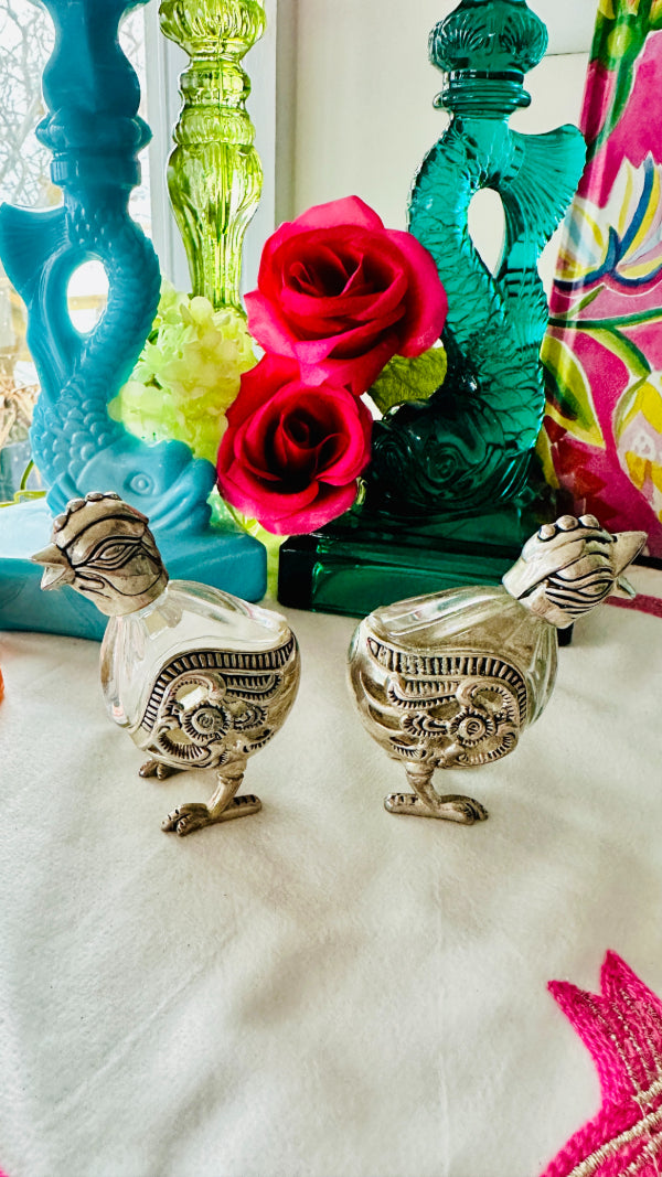Comes in their original Neiman Marcus box (part of box is worn), enhancing their collectible value and making the set especially appealing for gifting or display. Ideal for a formal table, curio cabinet, or vintage barware collection, these silver and crystal birds offer both function and timeless decorative charm.
