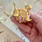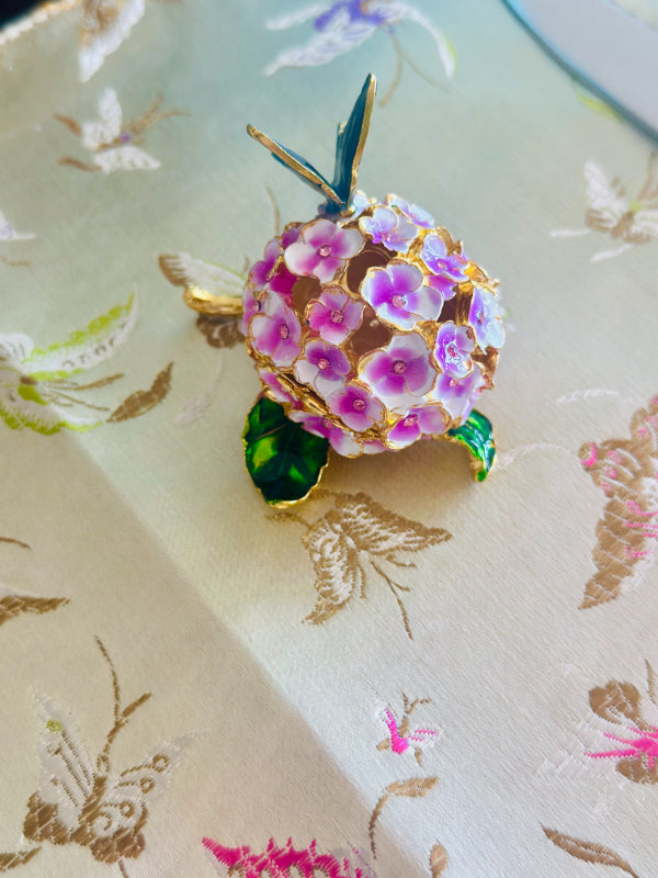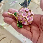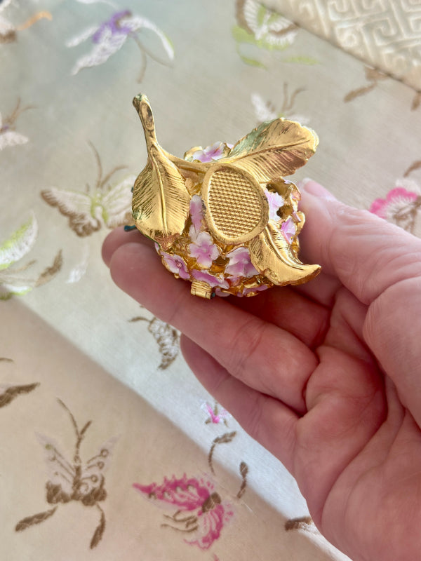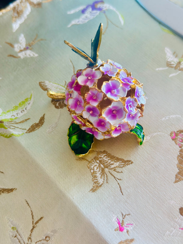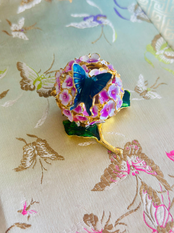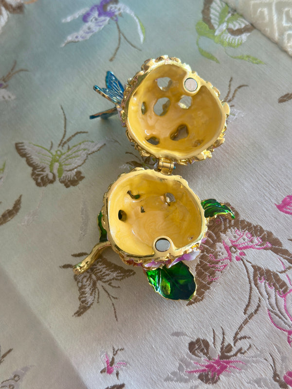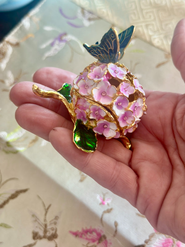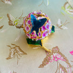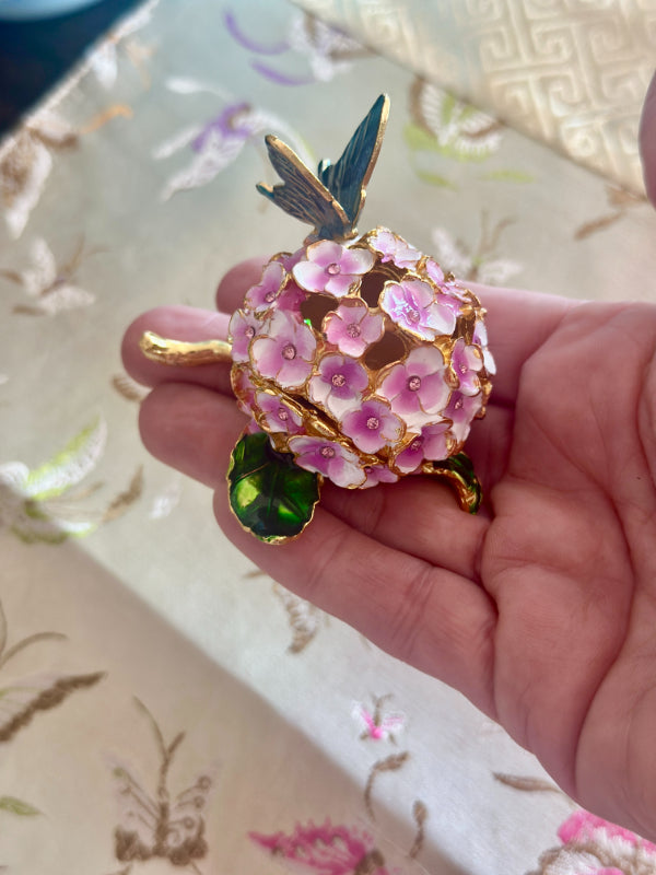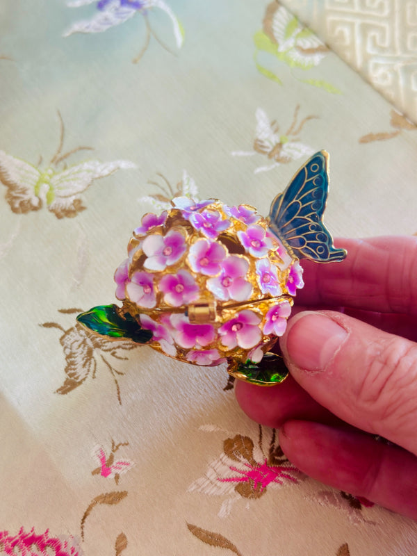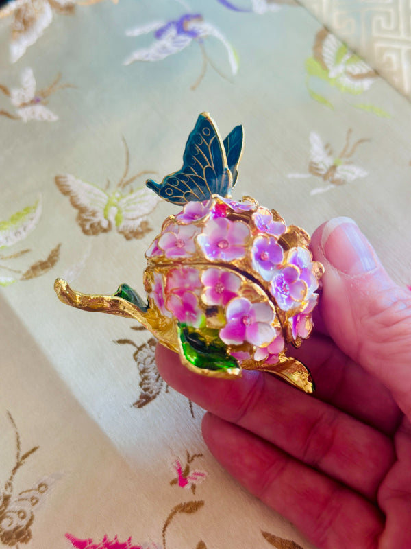 This charming vintage hinged trinket box features a delicate enamel design of blooming flowers and a graceful butterfly, capturing the timeless beauty of nature. Rich colors and intricate detailing while the hinged lid opens to reveal space for rings, keepsakes, or other tiny treasures. Whether displayed on a vanity, dresser, or shelf, this enamel trinket box adds a touch of vintage whimsy and refinement to any space. A lovely gift for collectors, butterfly lovers, or anyone who appreciates classic decorative accents.