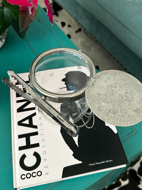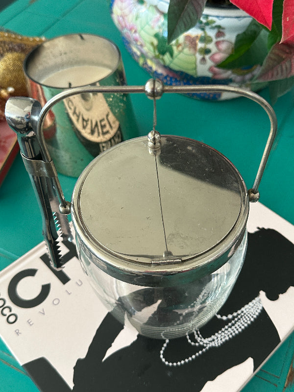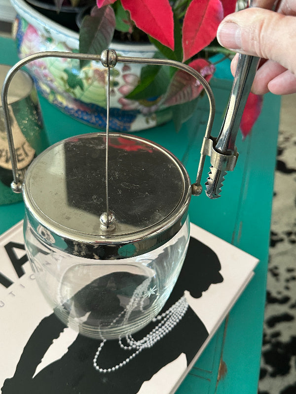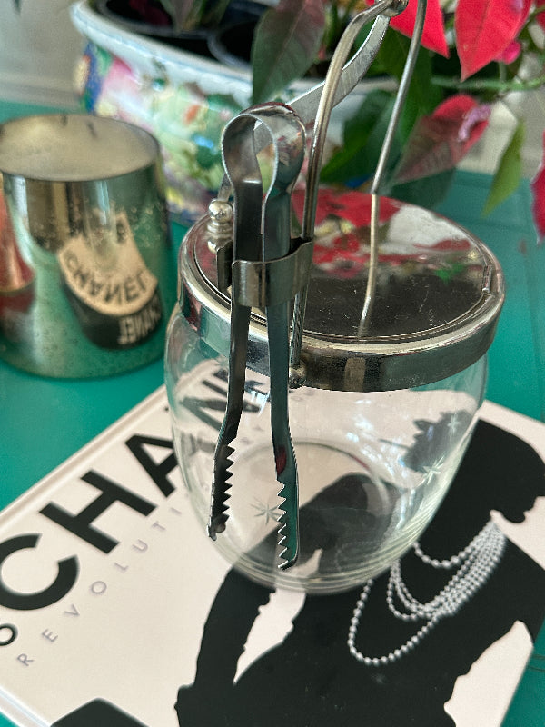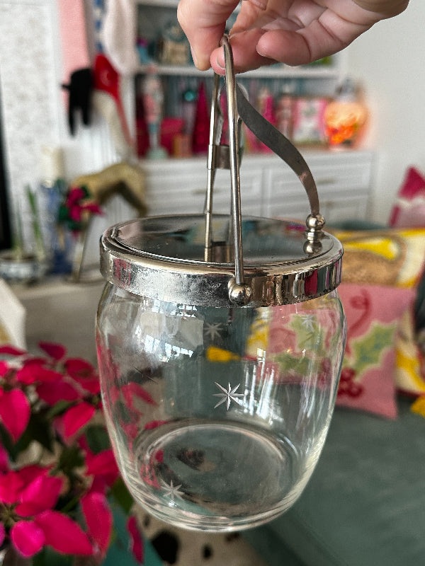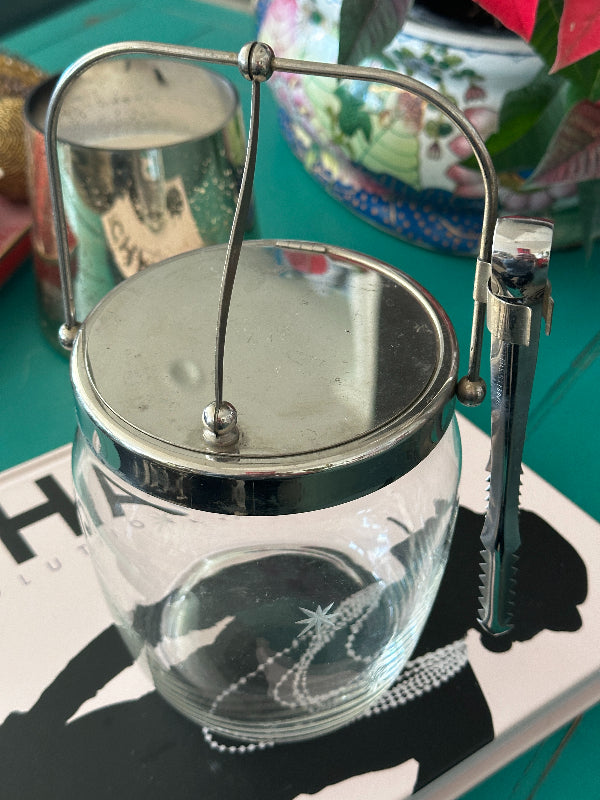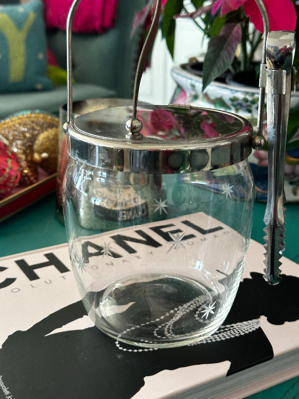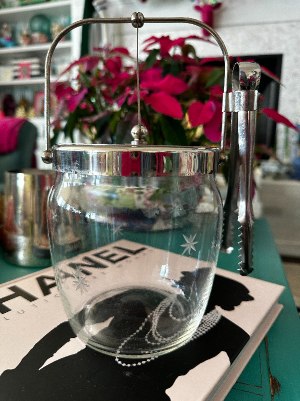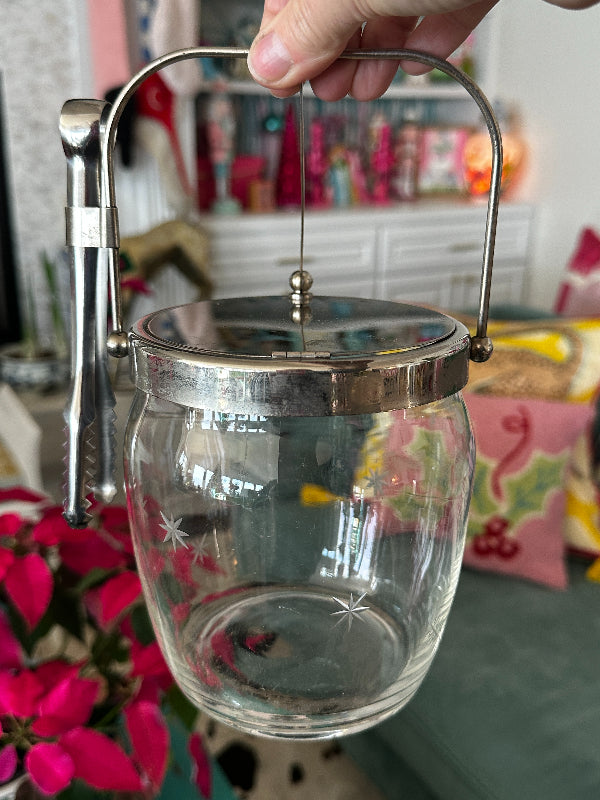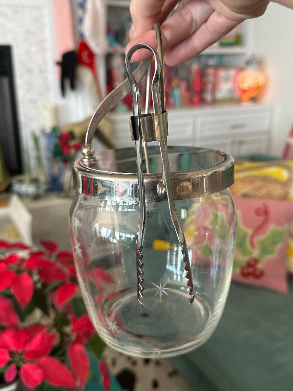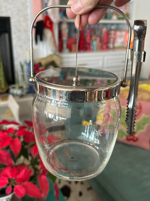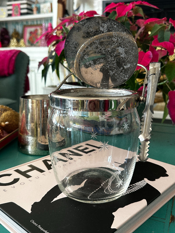 Vintage Ice Bucket, MCM,Starburst Etched Glass Pattern, Hinged Silver tone lid, Ice Tongs In Holder