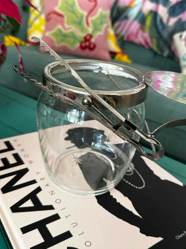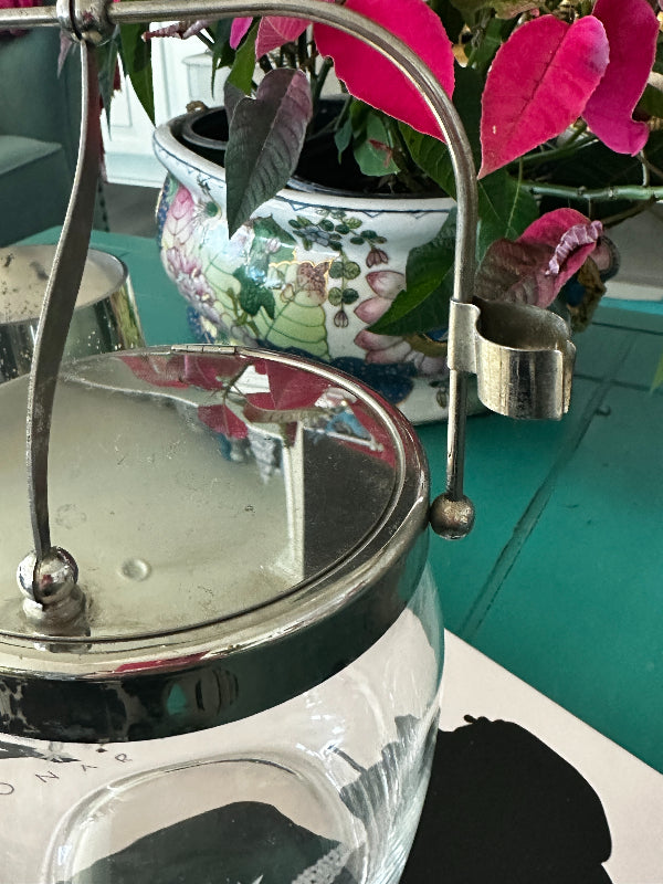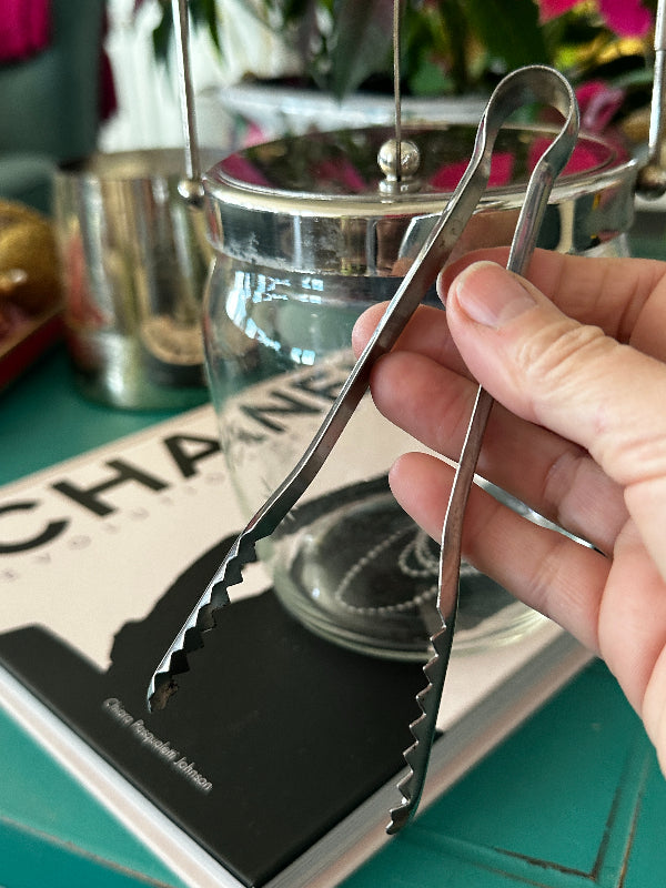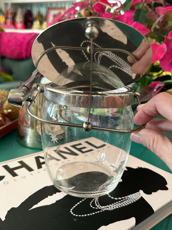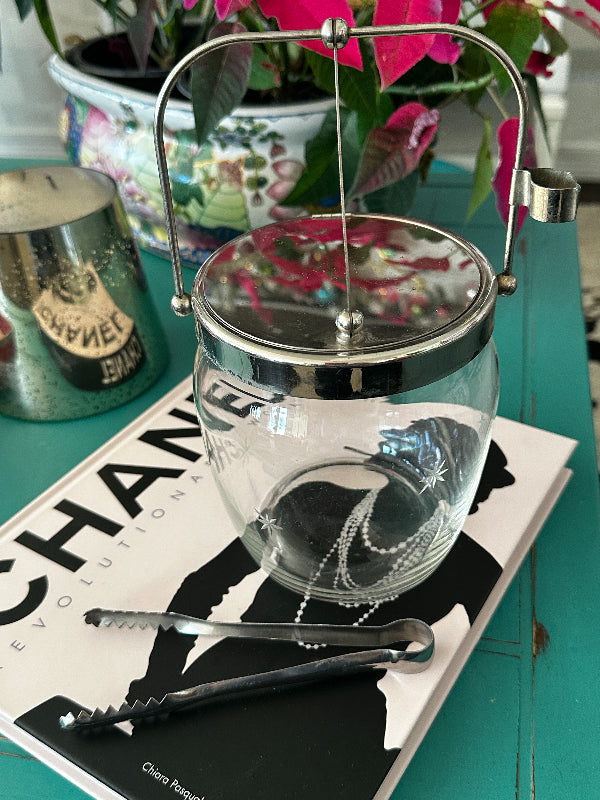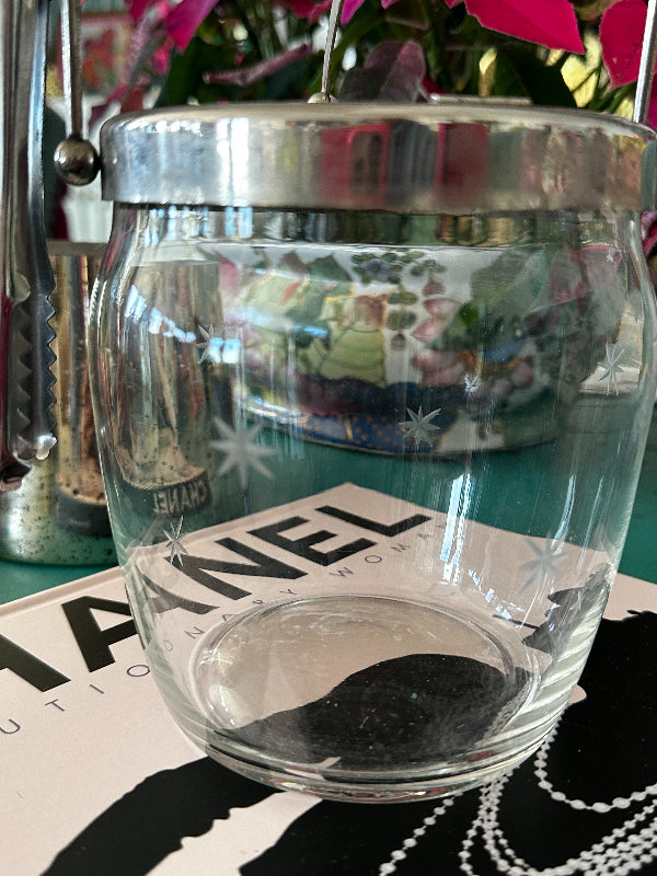 The Mid-Century Modern Vintage Ice Bucket features a stunning Starburst Etched Glass Pattern. This chic and retro piece boasts a hinged silver-tone lid for easy access and comes complete with a stylish ice tongs holder. This ice bucket is not just a functional addition but a statement of vintage style. Slight wear on the metal lid, otherwise wonderful condition. Great for a bar cart!