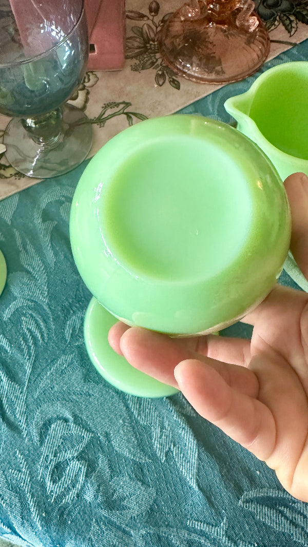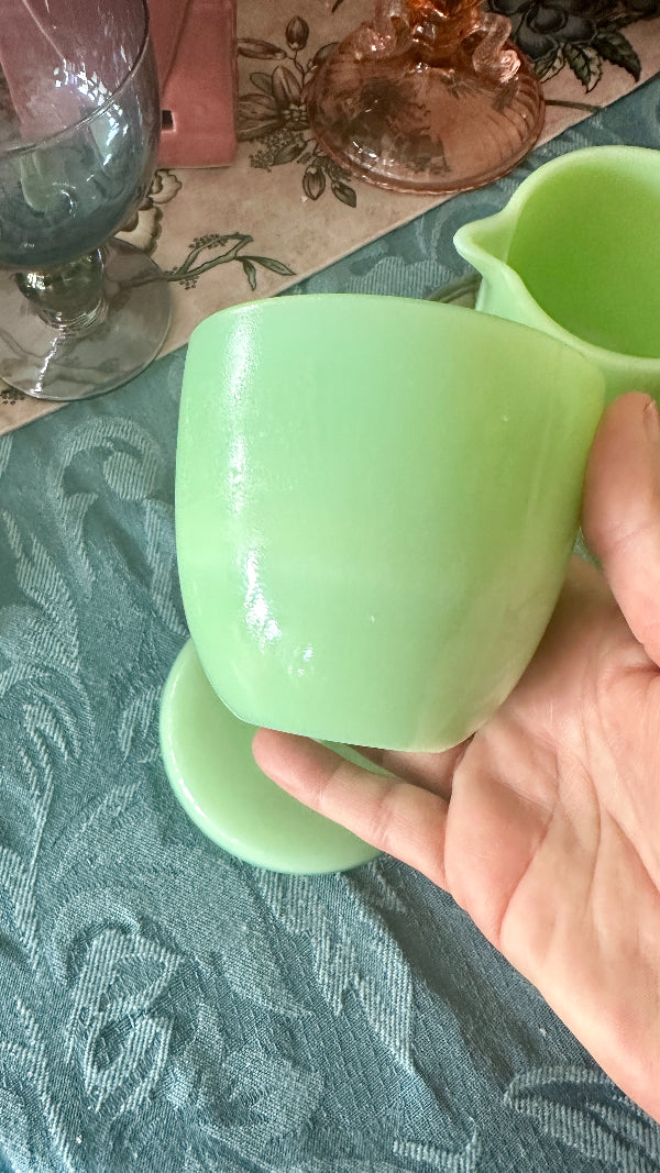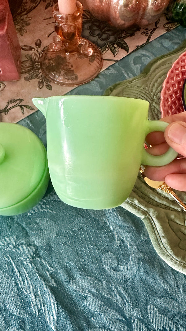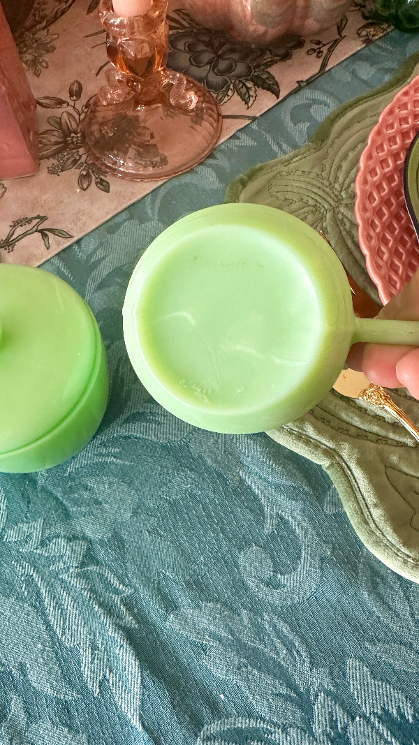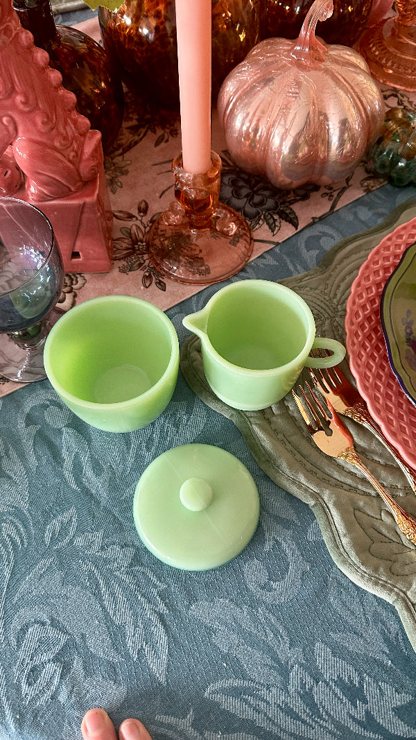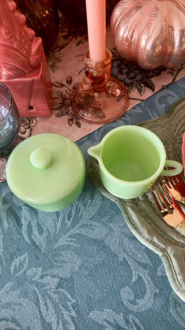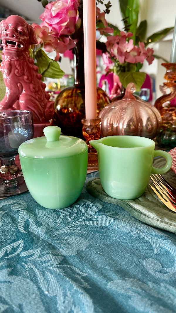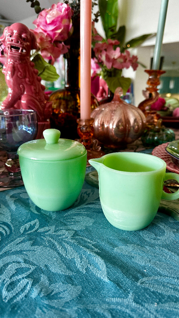 Add a touch of classic charm to your table with this Vintage Jadeite Lidded Sugar and Creamer set. In a vibrant green hue, this iconic glassware is known for its durability and timeless appeal. This Vintage Jadeite Sugar and Creamer has a lidded design keeps contents fresh, while the highly collectible Jadeite offers a vintage aesthetic that enhances any dining experience.