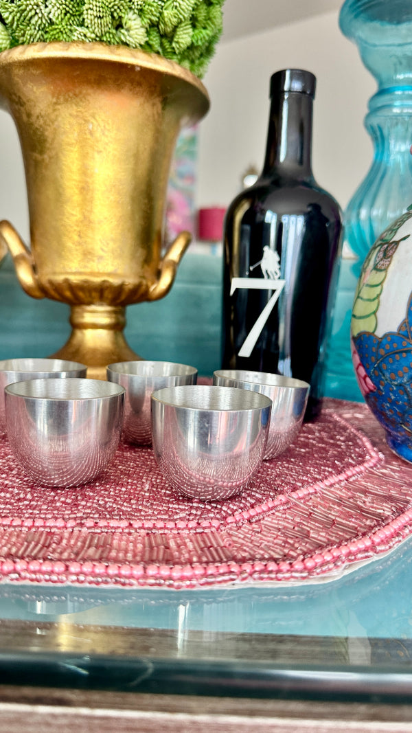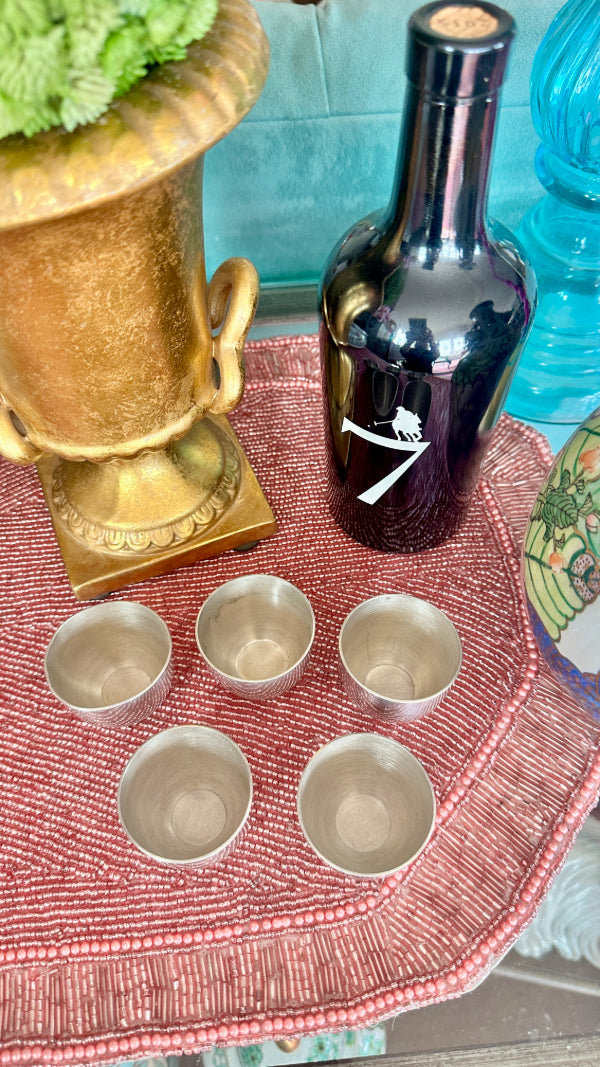This Set of Five Vintage Jefferson cups by Stieff Pewter, model P-33, offers a charming collectible in shot glass size. Crafted in durable pewter, each cup features intricate detailing and a classic design, reflecting Steiff’s renowned quality and craftsmanship.