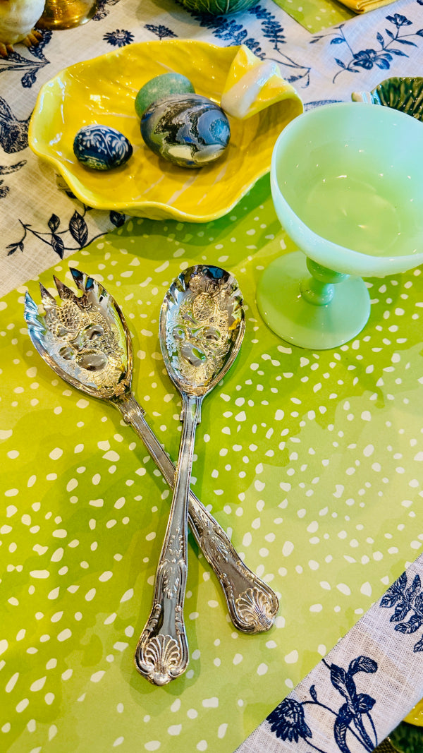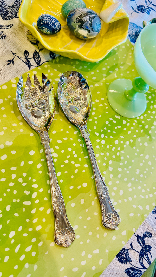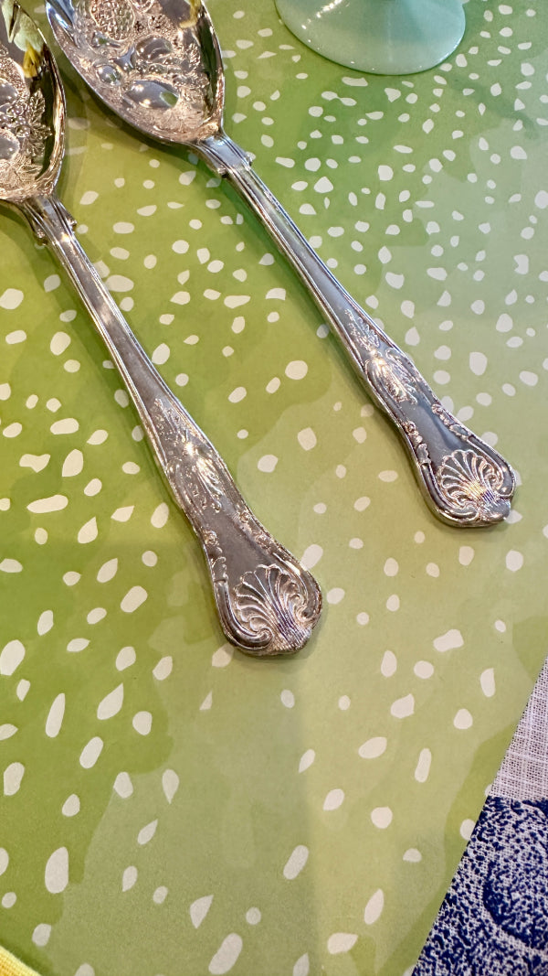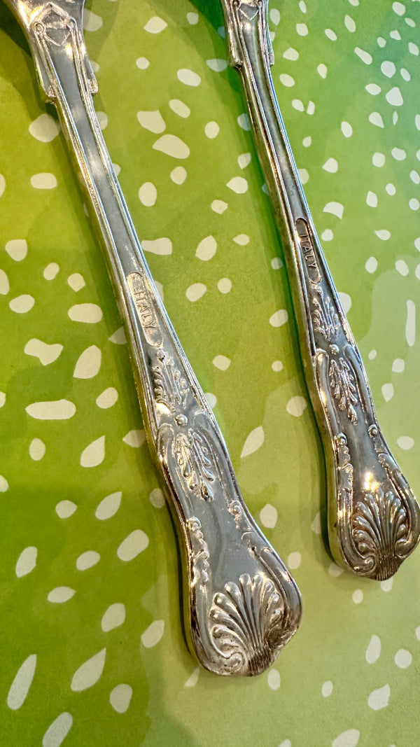 Bring timeless elegance to your table with this exquisite set of vintage silverplate serving spoons, crafted in Italy in the classic Kings pattern. Featuring beautifully embossed fruit designs on the bowls and ornate scrollwork handles, these spoons are both functional and decorative. Perfect for entertaining or display, they add a touch of Old World charm to any dining experience. A lovely addition for collectors or anyone who appreciates fine vintage tableware.