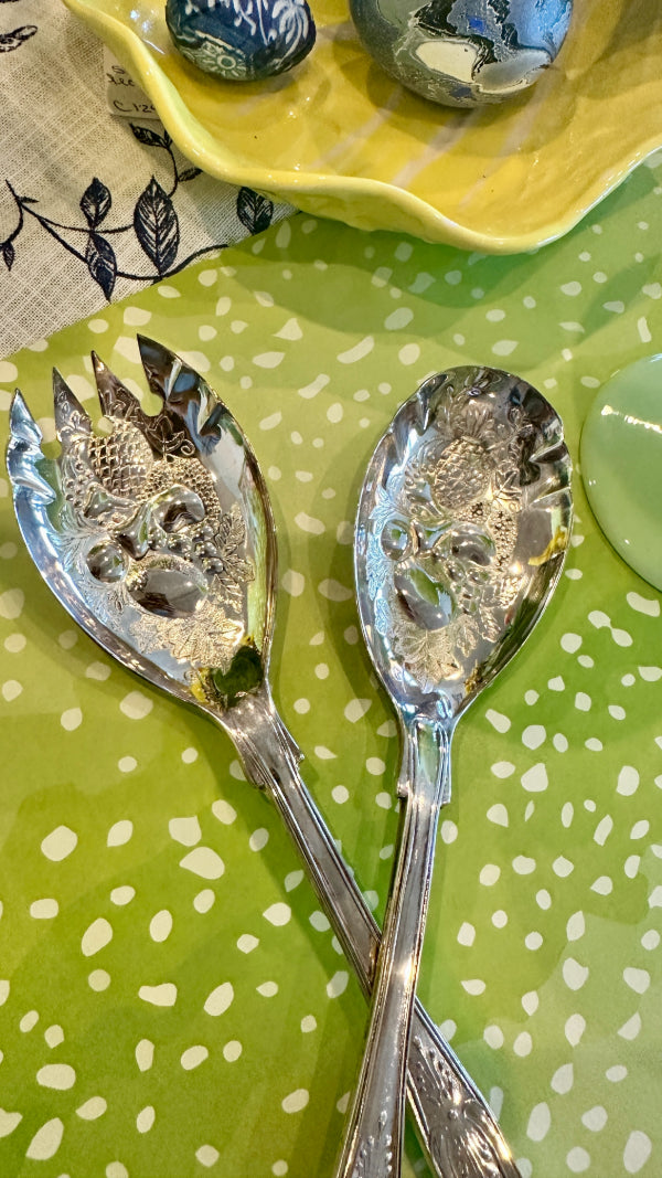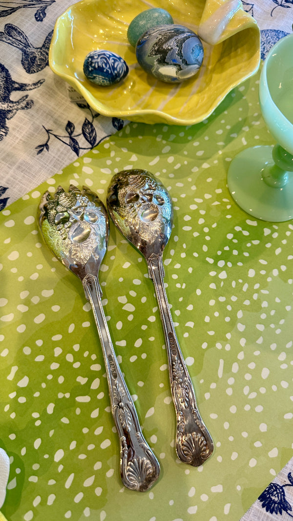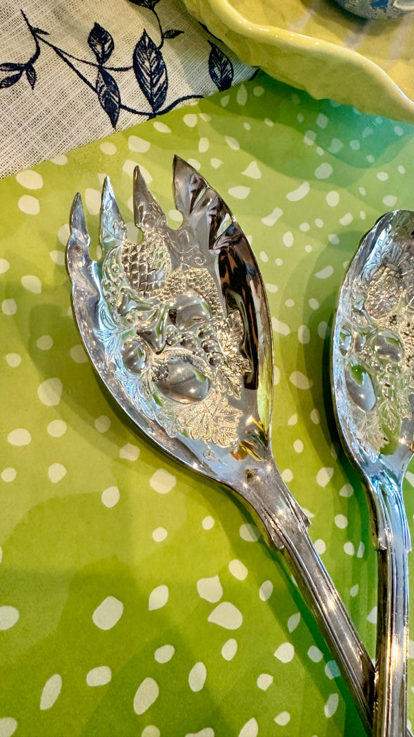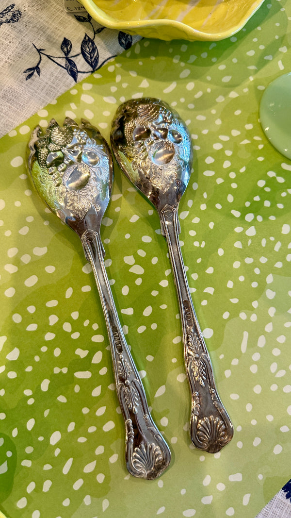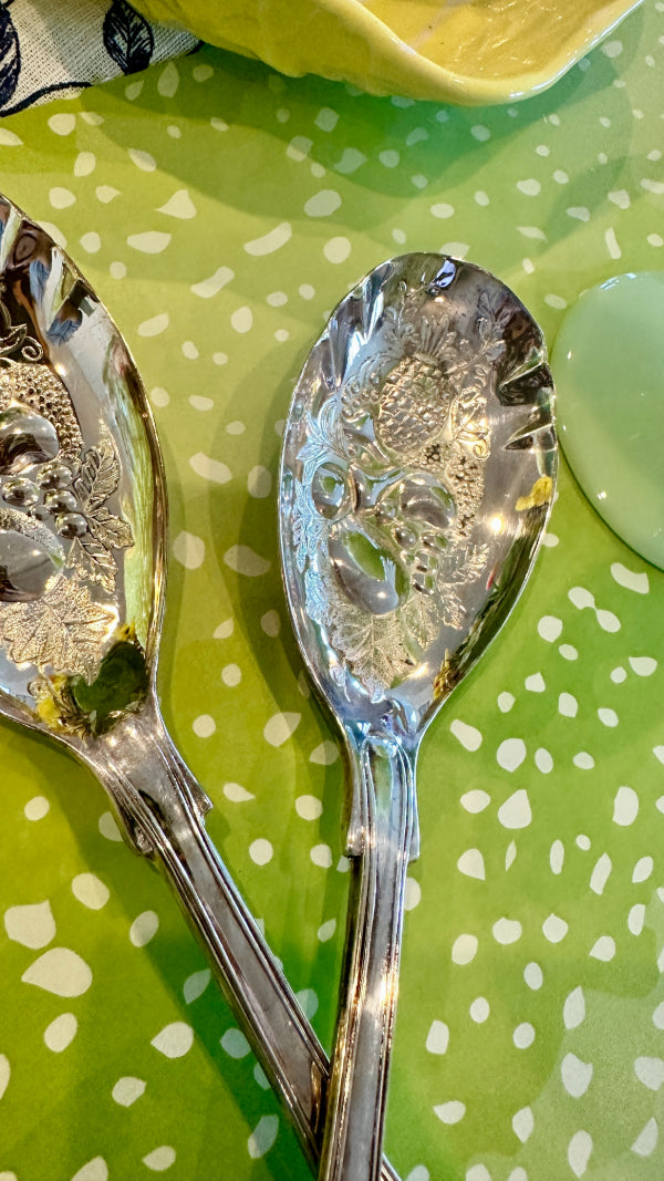 Vintage Kings Pattern Silverplate Serving Spoons, Italy, Embossed Fruit Design