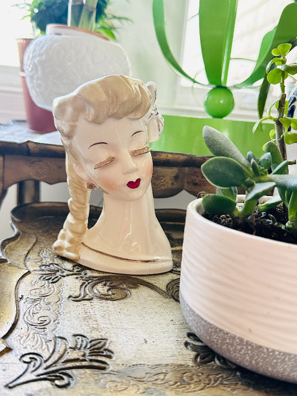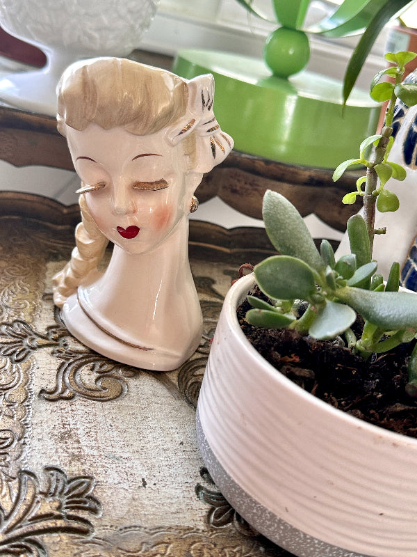 This pretty lady has a blonde braid down her left side. She has bright red lips and slightly blushed cheeks. Her eyelashes are blonde and she looks down in a demure way. Add your favorite succulent and place her on a window sill. These are still highly collectible and hard to find. She is i wonderful condition for her age.