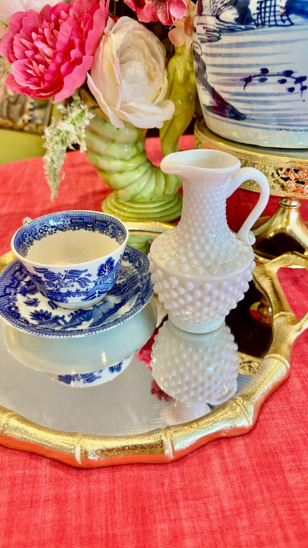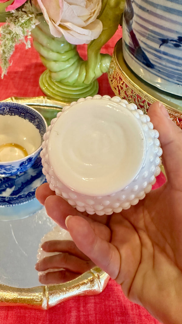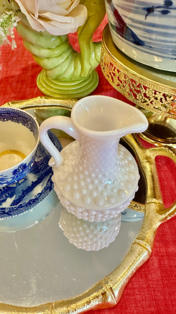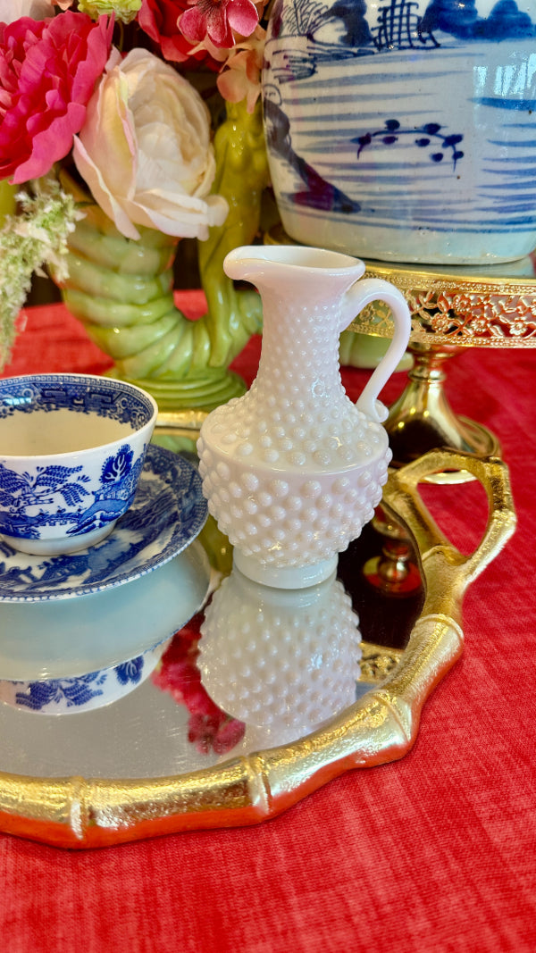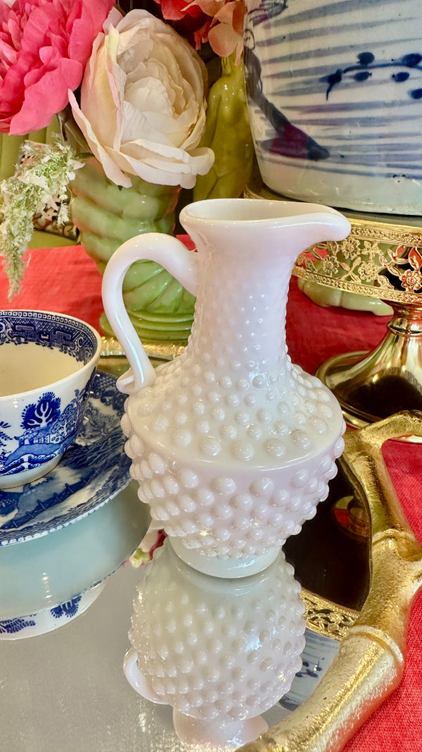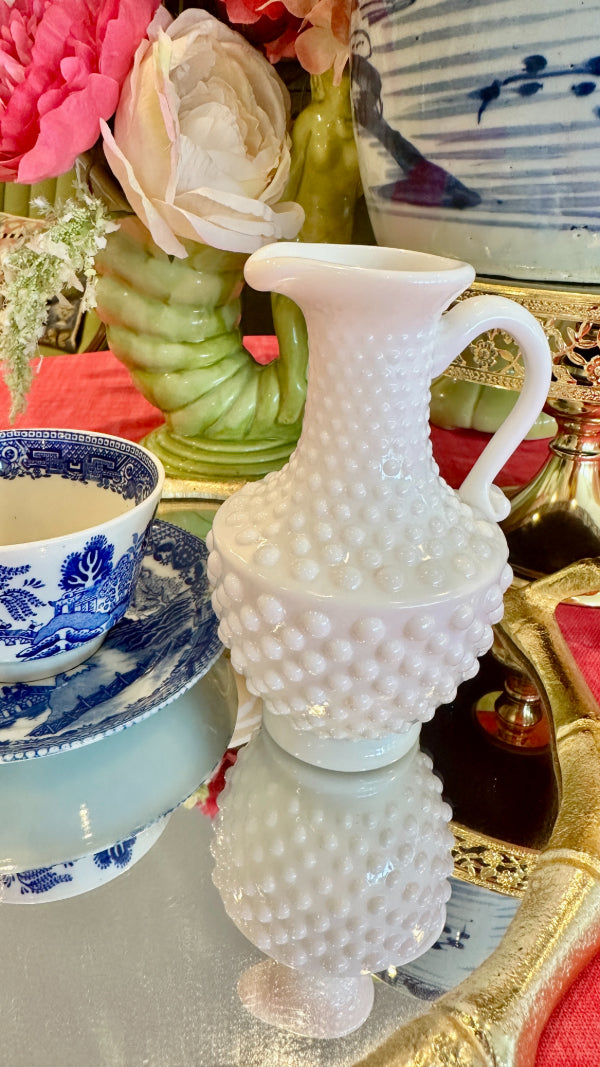 Add a touch of vintage charm to your kitchen or dining space with this classic milk glass hobnail pitcher. Featuring the iconic raised hobnail texture and a gracefully curved handle, this pitcher is as functional as it is beautiful. Perfect for serving beverages, holding fresh flowers, or standing alone as a decorative accent, it’s a timeless piece for collectors and lovers of farmhouse, cottagecore, or retro-inspired décor.