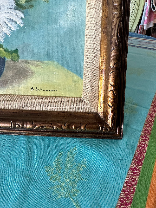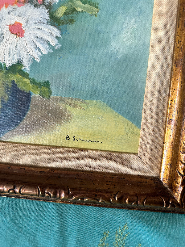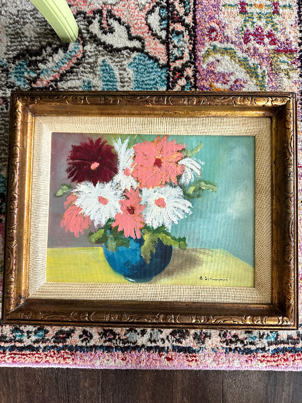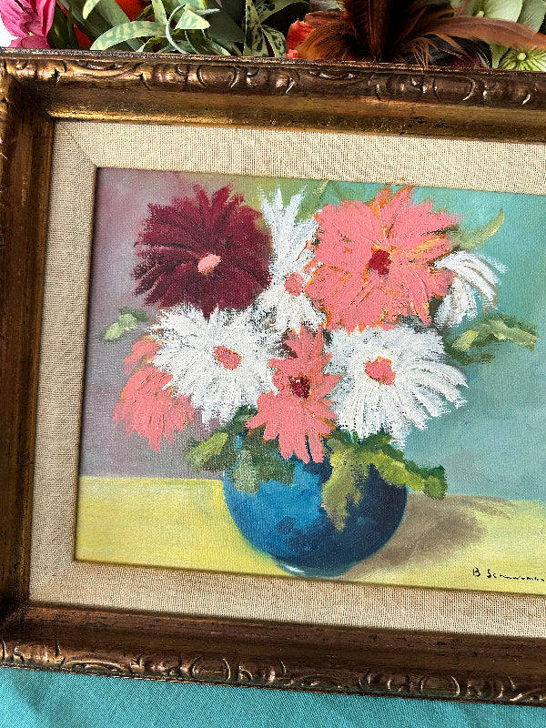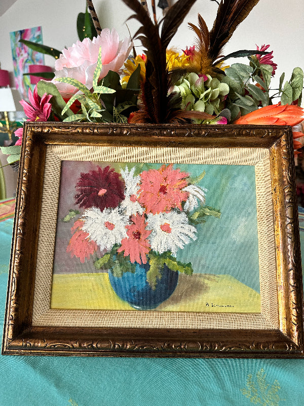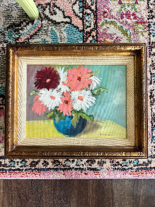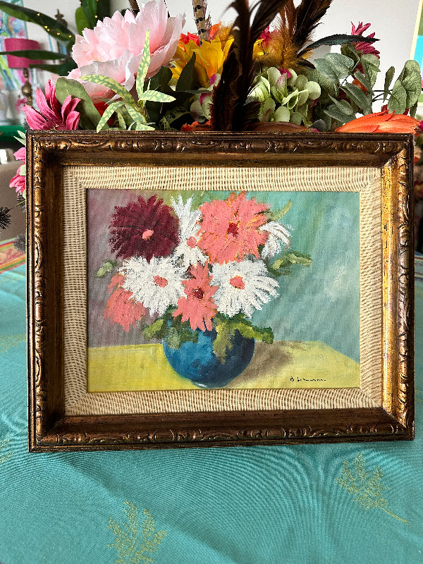 This amazing oil painting will add a pop of color to your space. Beautiful painted flowers in shades of pink, white and deep maroon are perfectly arranged ina blue vase. The frame is a detailed gilt with a cream fabric inset. The colors of the background really make this piece extra special for color lovers. Signed by the artist and ready to hang. Great vintage condition.