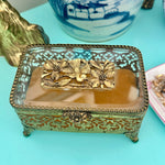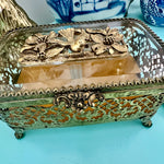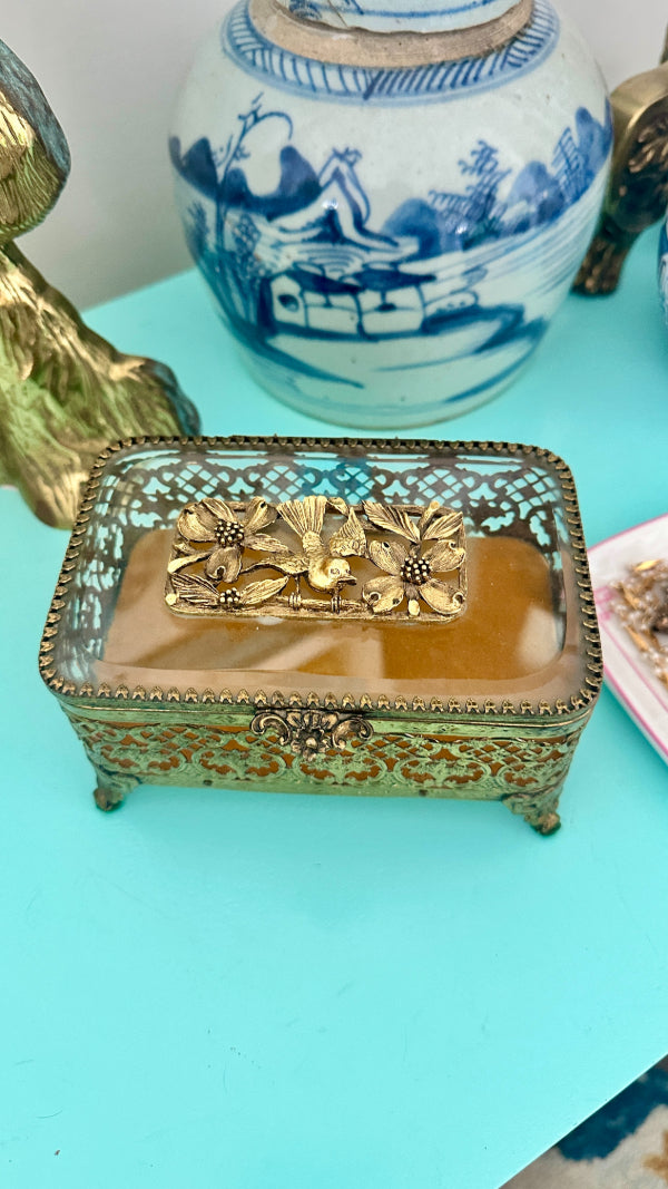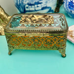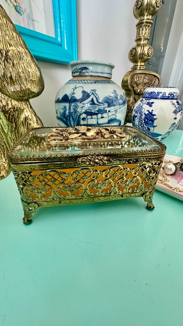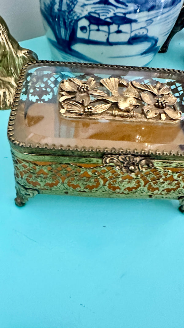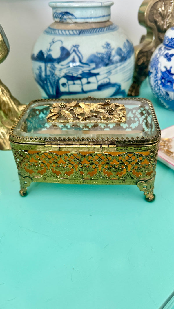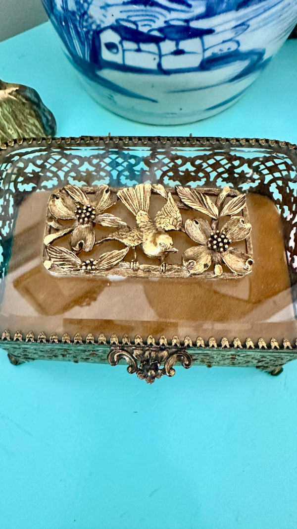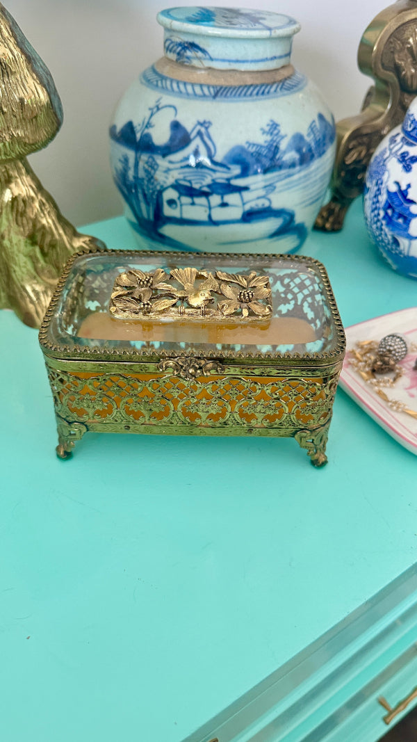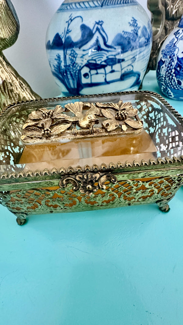 Vintage Ormolu Casket, Jewelry Box, Glass and Brass, Footed, Bird and Floral Motif, Matson Hollywood Regency
