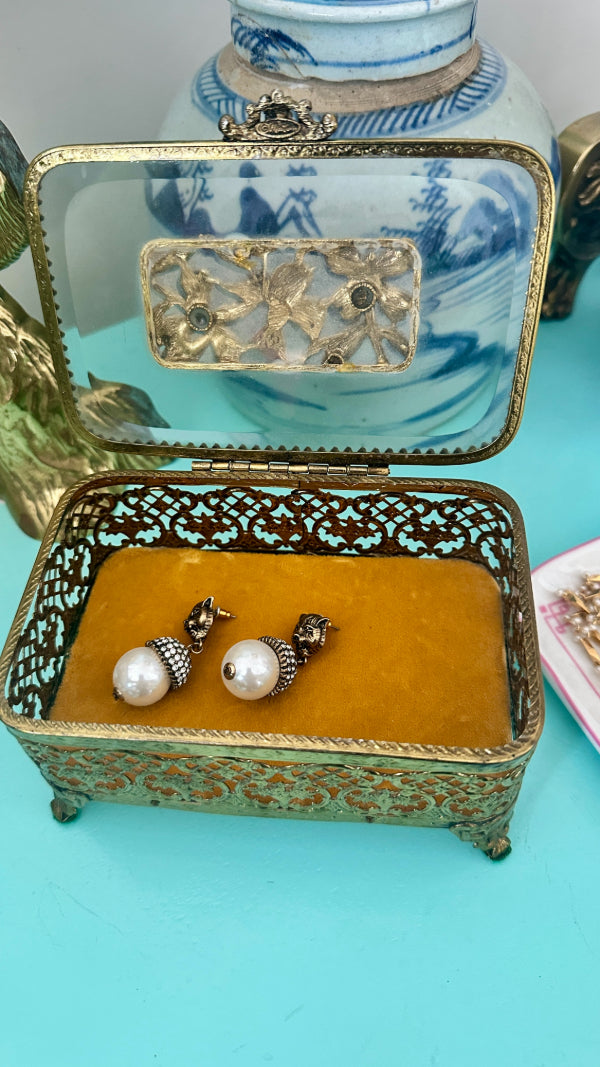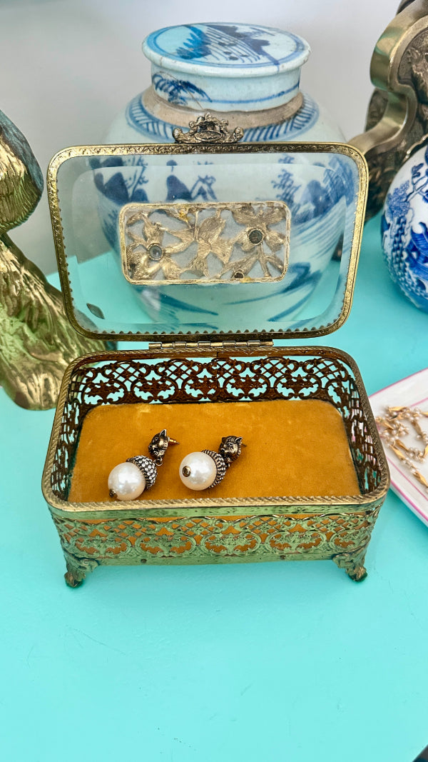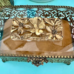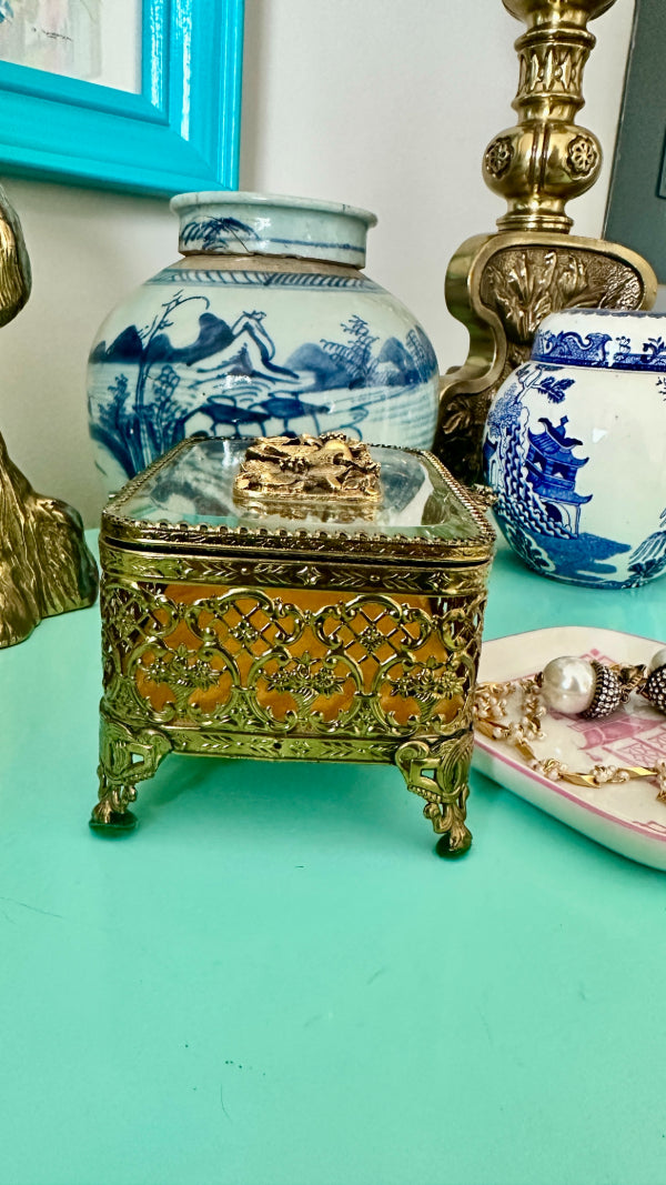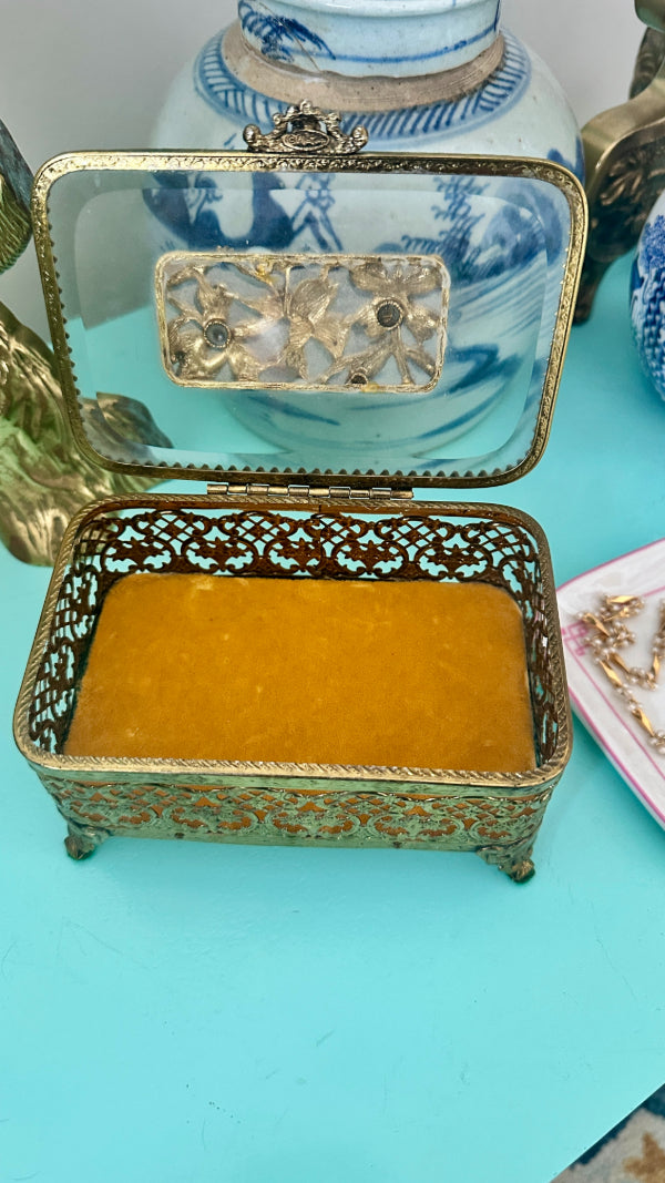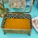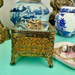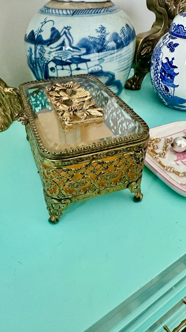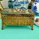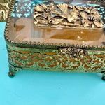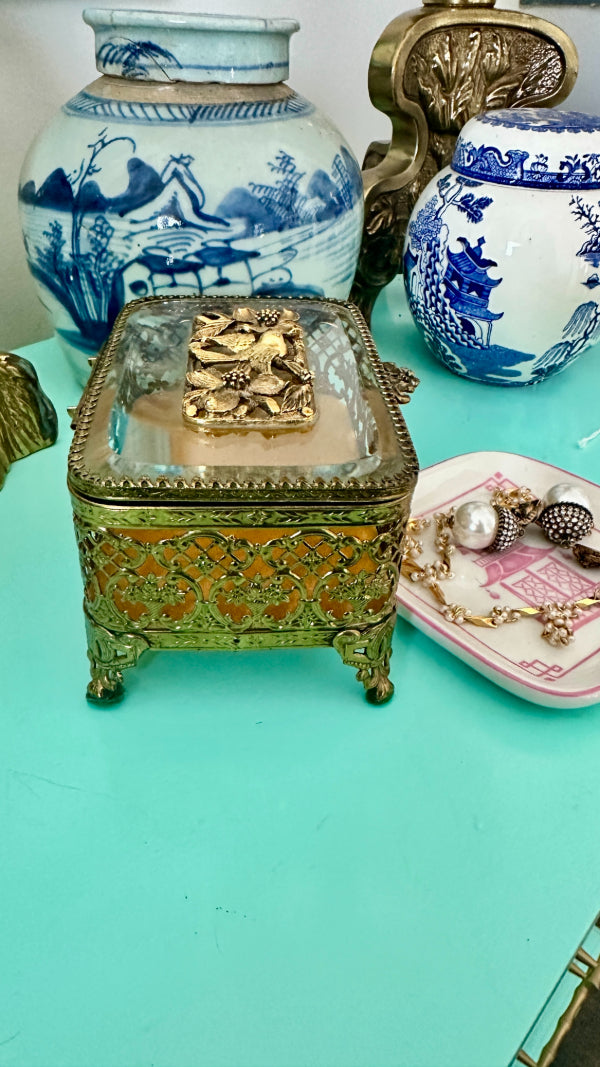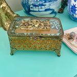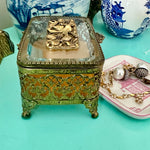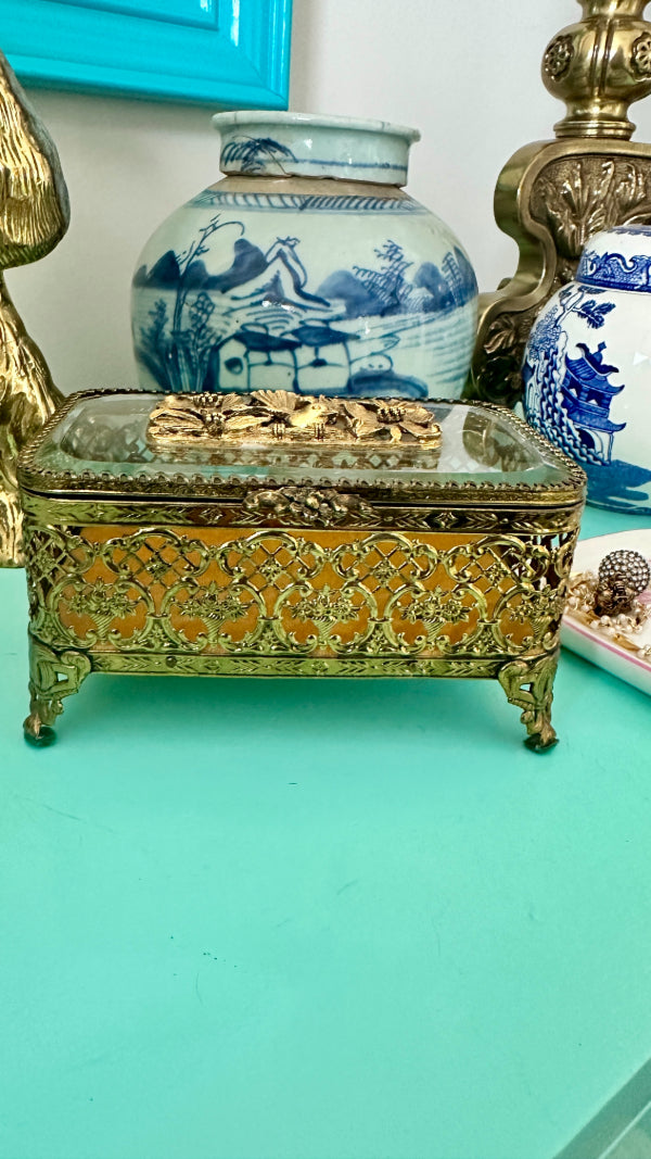 Vintage Ormolu Casket, Jewelry Box, Glass and Brass, Footed, Bird and Floral Motif, Matson Hollywood Regency