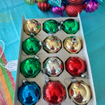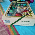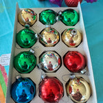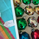 Transform your festive decor with a burst of color, featuring a delightful assortment of green, red, silver, and blue vintage ornaments. This collection of beautifully preserved ornaments, are each nestled in their original box. Great to add to your Christmas tree or to display in a beautiful Revere bowl.