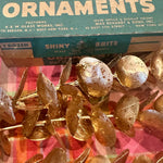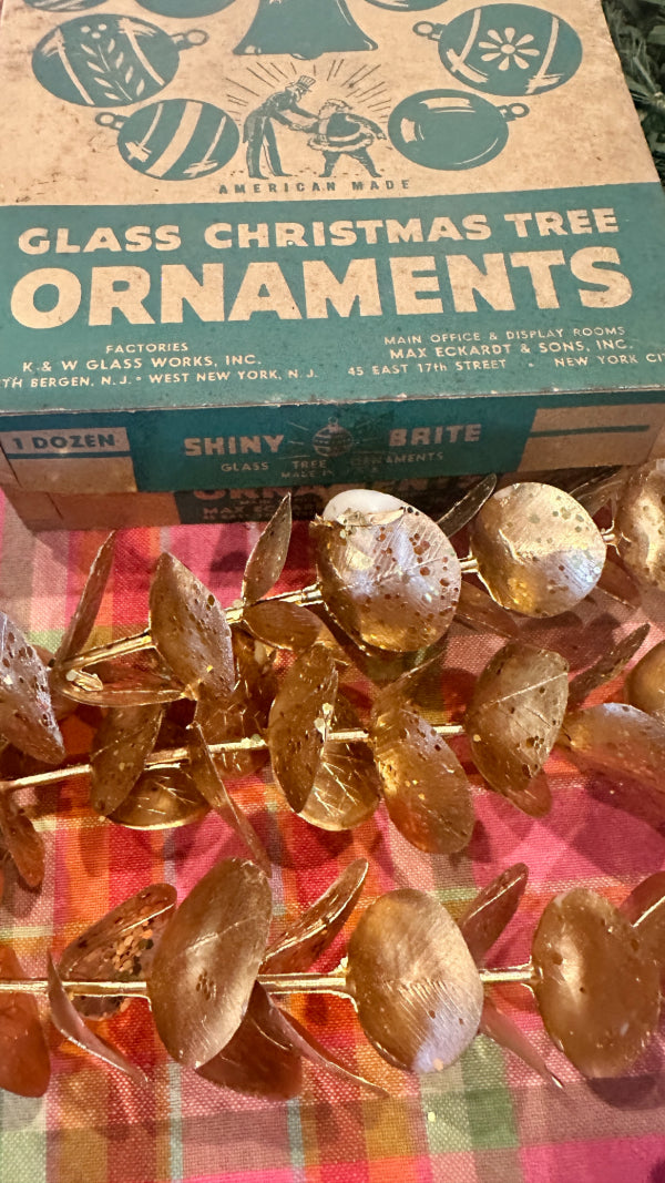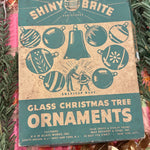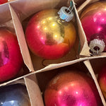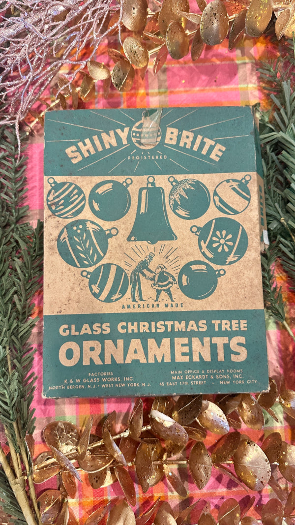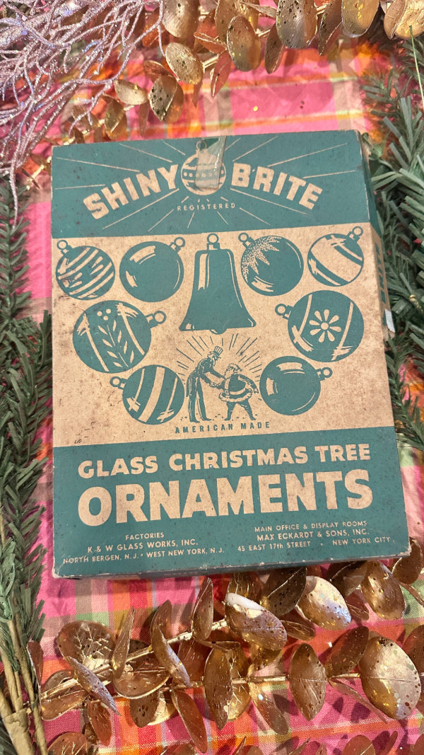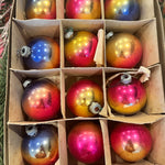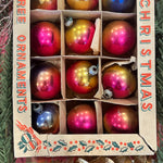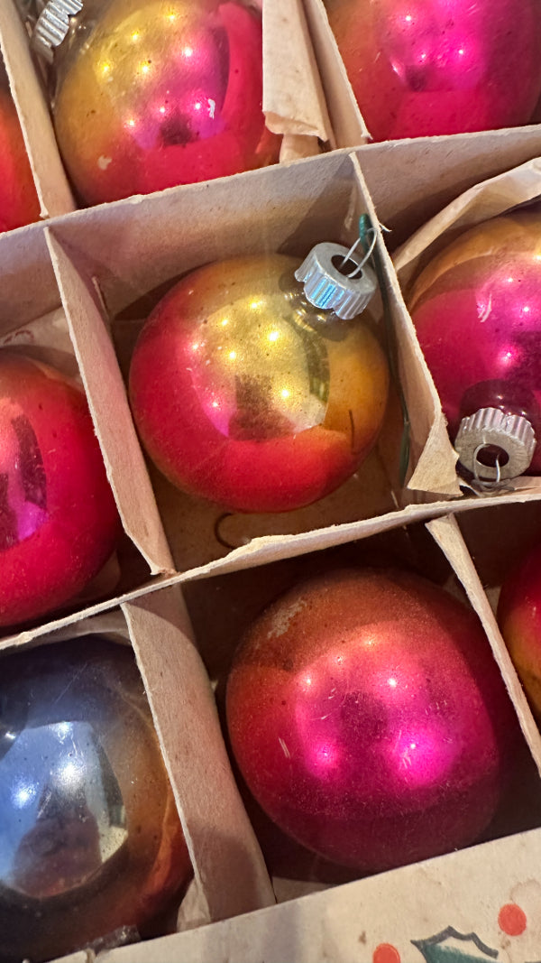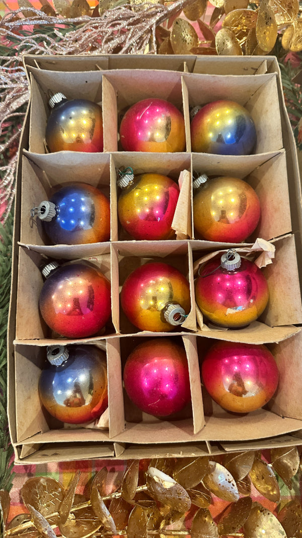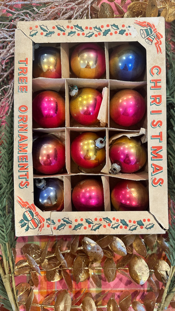 Bring retro holiday magic to your tree with this Vintage Shiny Brite Ombre Ornament Set. This boxed set of 12 glass ornaments features vibrant ombré hues with that signature mid-century shimmer collectors love. Each ornament captures the nostalgic sparkle of classic Shiny Brite craftsmanship—perfect for vintage Christmas décor, retro-themed displays, or gifting to a collector. The original box adds an extra touch of authenticity and charm, making this set a timeless treasure for the holidays. These ornaments have been well loved and are imperfect as you would expect from their age.