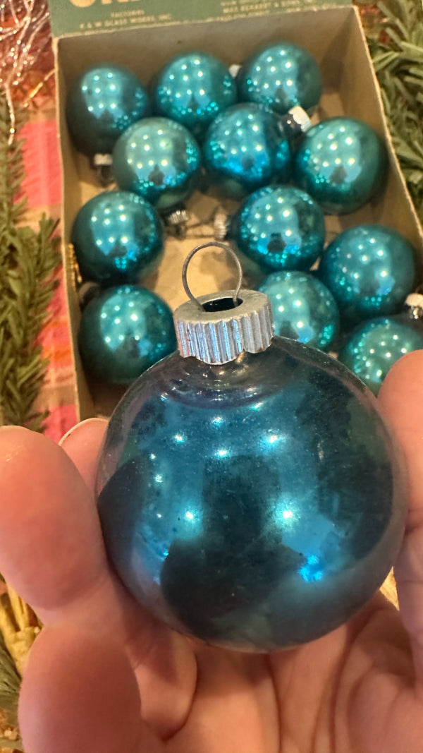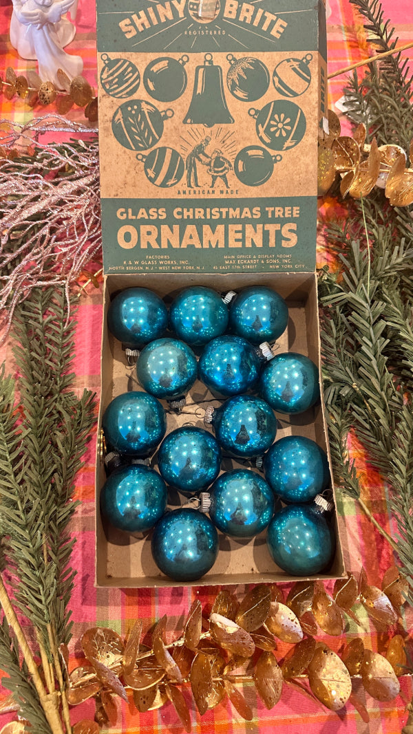 Bring classic holiday charm to your décor with this Set of 14 Vintage Shiny Brite Ornaments in Turquoise Blue. These beautiful glass ornaments feature the iconic Shiny Brite shine and rich turquoise color that defined mid-century Christmas style. Perfectly sized for tree trimming or holiday displays, each ornament reflects the craftsmanship and nostalgic magic collectors adore. Add a touch of retro elegance to your festive season with these timeless treasures—complete with their signature vintage sparkle. These ornaments have been well loved and are imperfect as you would expect from their age.