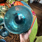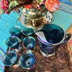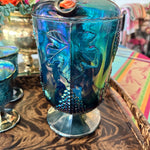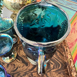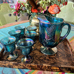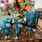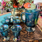 Add a pop of color to your table or bar cart with this opalescent blue Carnival glass pitcher. Heavy weight with a grapevine pattern. Pedestal bottom with a substantial handle. Set of glasses are sold separately but make a great set. Gift them to the bride and groom or your vintage loving friend. Great vintage condition no chips or cracks.