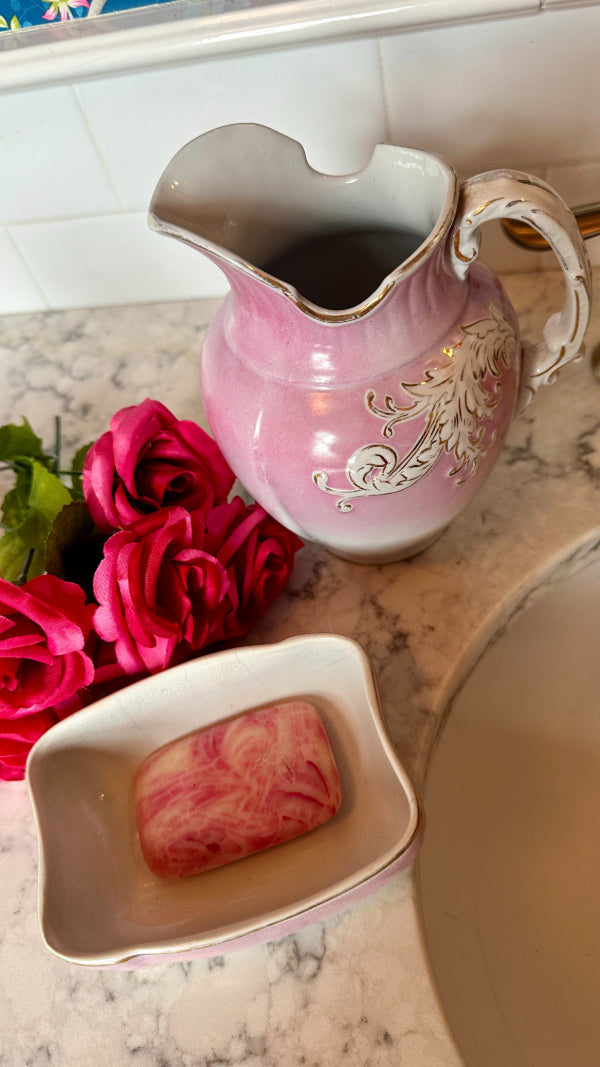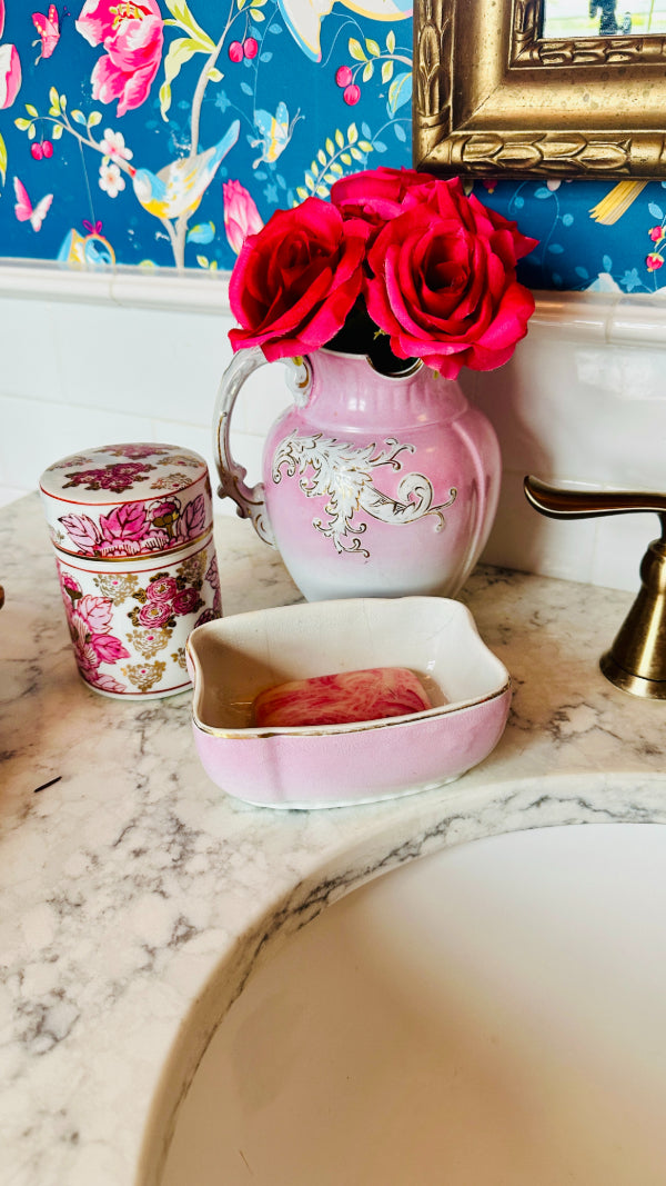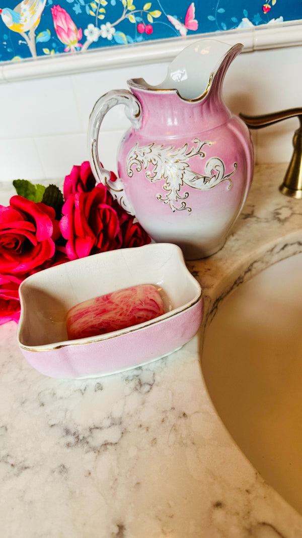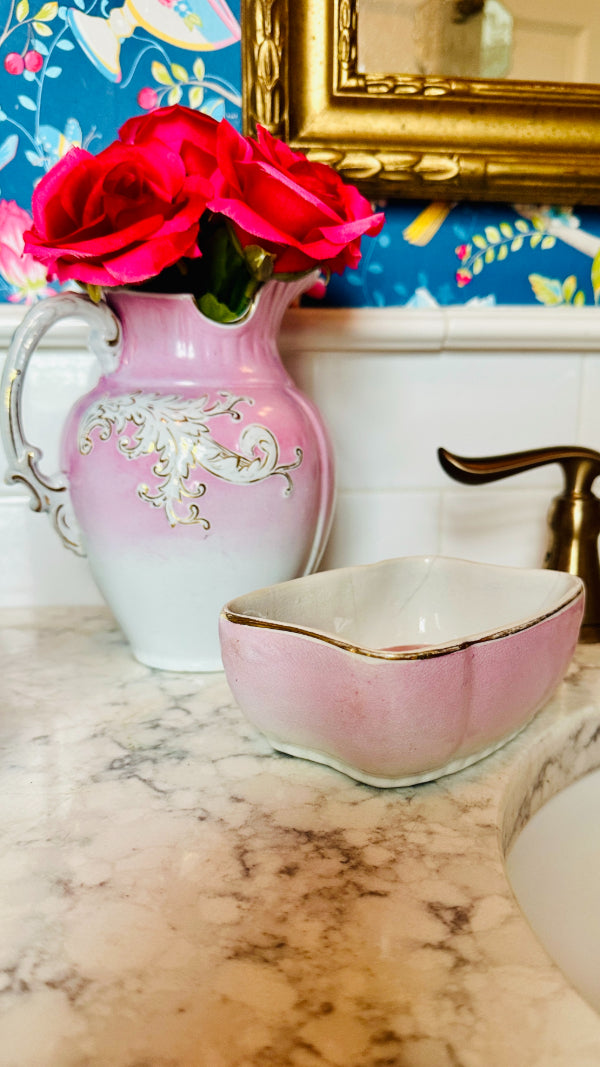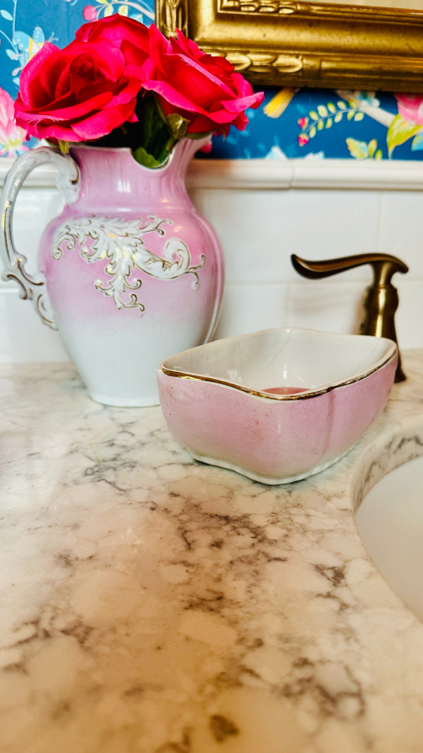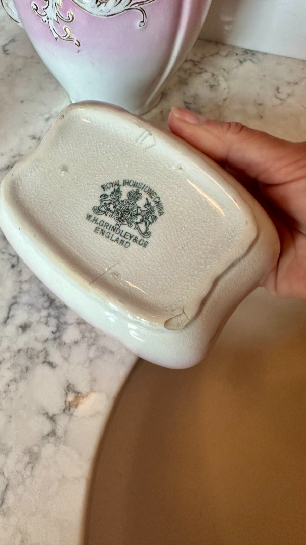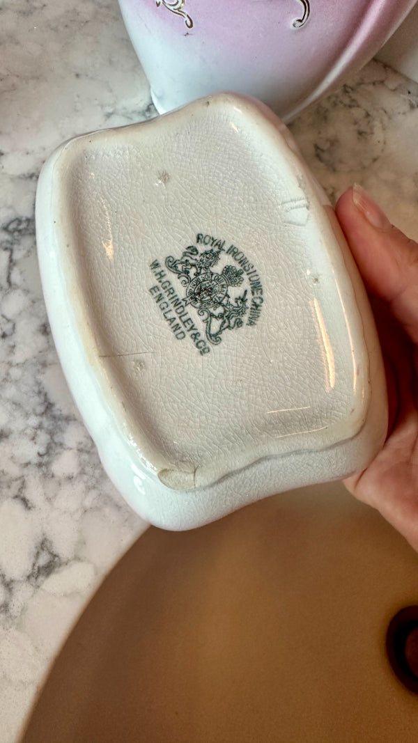 This Vintage Pitcher & Soap Dish from Royal Ironstone by W.H. Grindley & Co., England showcases classic craftsmanship and timeless elegance. Made from durable ironstone, the pitcher and soap dish feature a pink and white fade coloring with gold and white detail. the set is perfect for adding vintage charm to any bathroom or kitchen. Ideal for collectors or those seeking unique, functional décor pieces with a rich history. Some wear on the soap dish with a small crack.