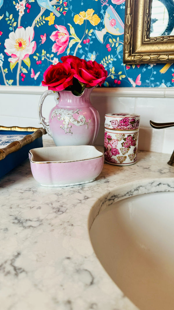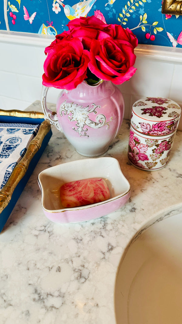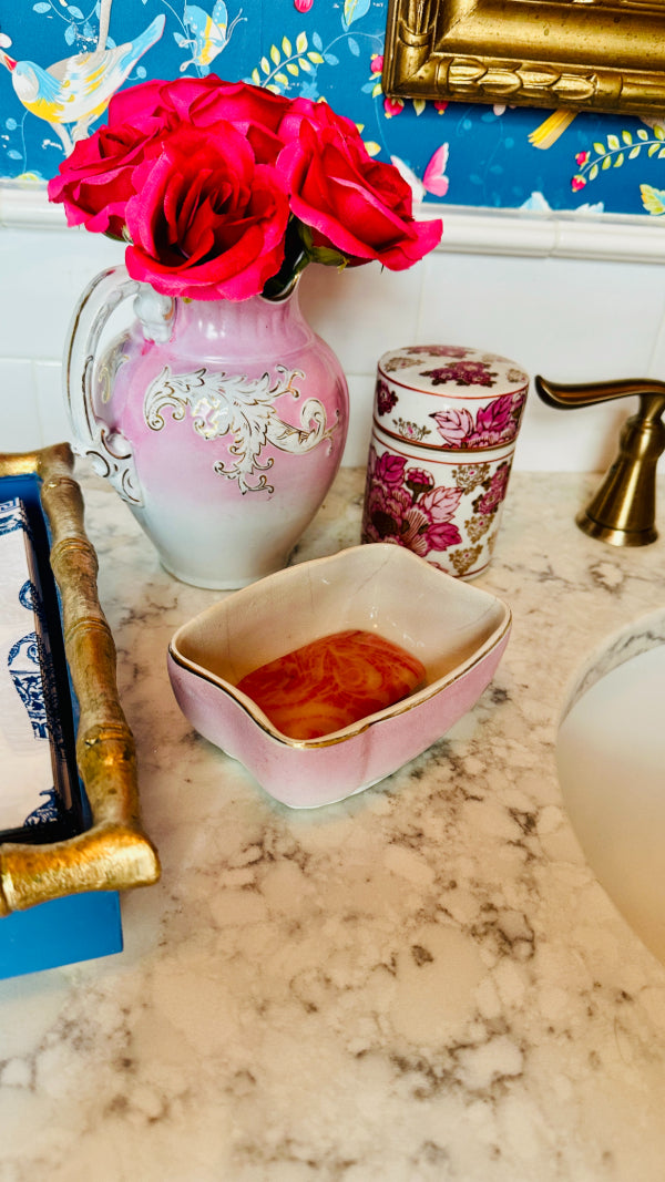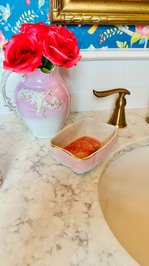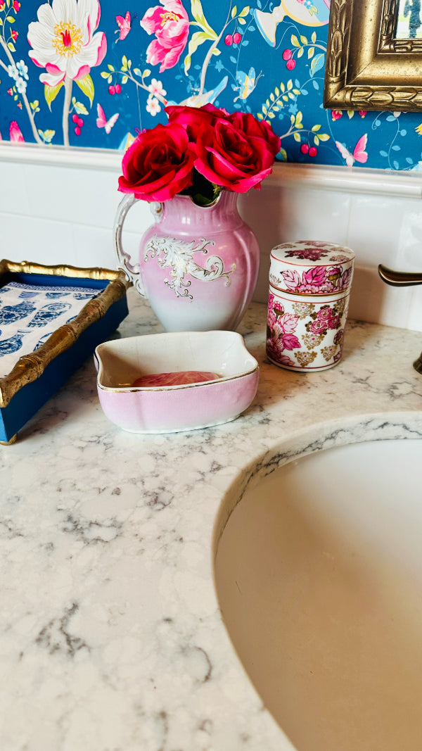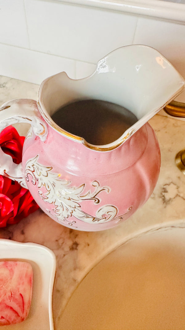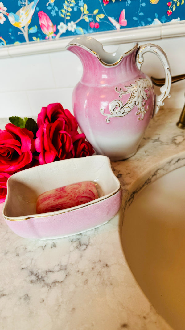 This Vintage Pitcher & Soap Dish from Royal Ironstone by W.H. Grindley & Co., England showcases classic craftsmanship and timeless elegance. Made from durable ironstone, the pitcher and soap dish feature a pink and white fade coloring with gold and white detail. the set is perfect for adding vintage charm to any bathroom or kitchen. Ideal for collectors or those seeking unique, functional décor pieces with a rich history. Some wear on the soap dish with a small crack.