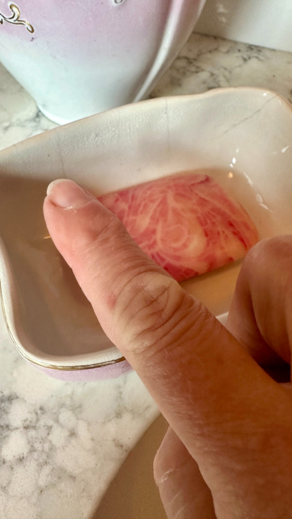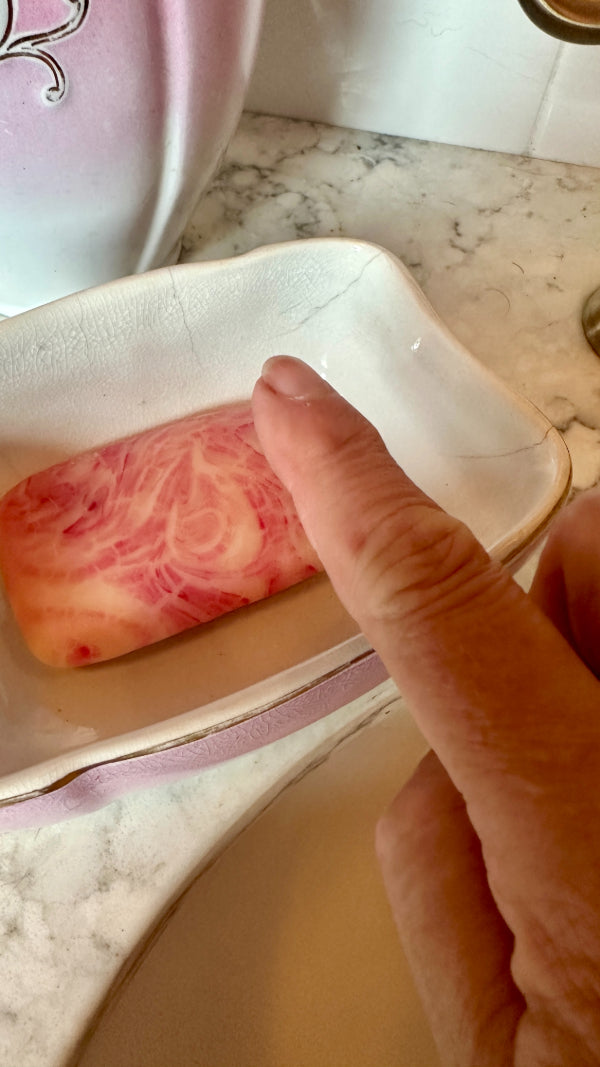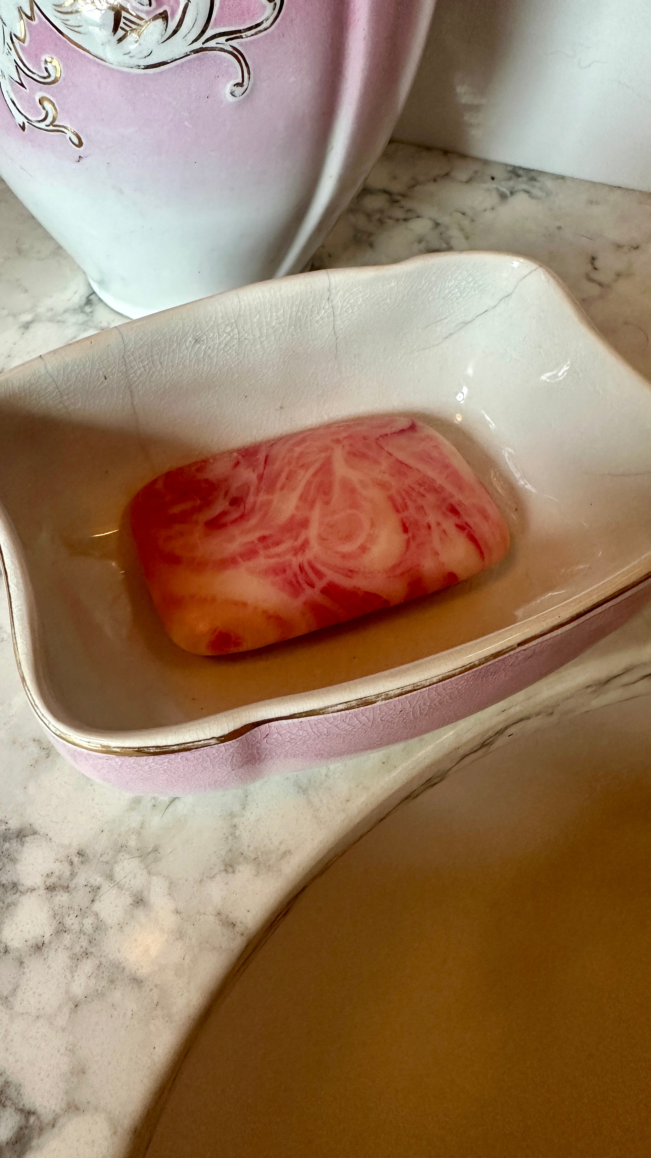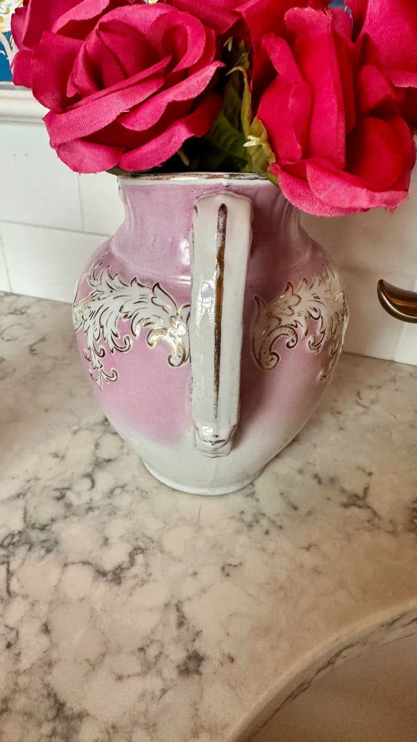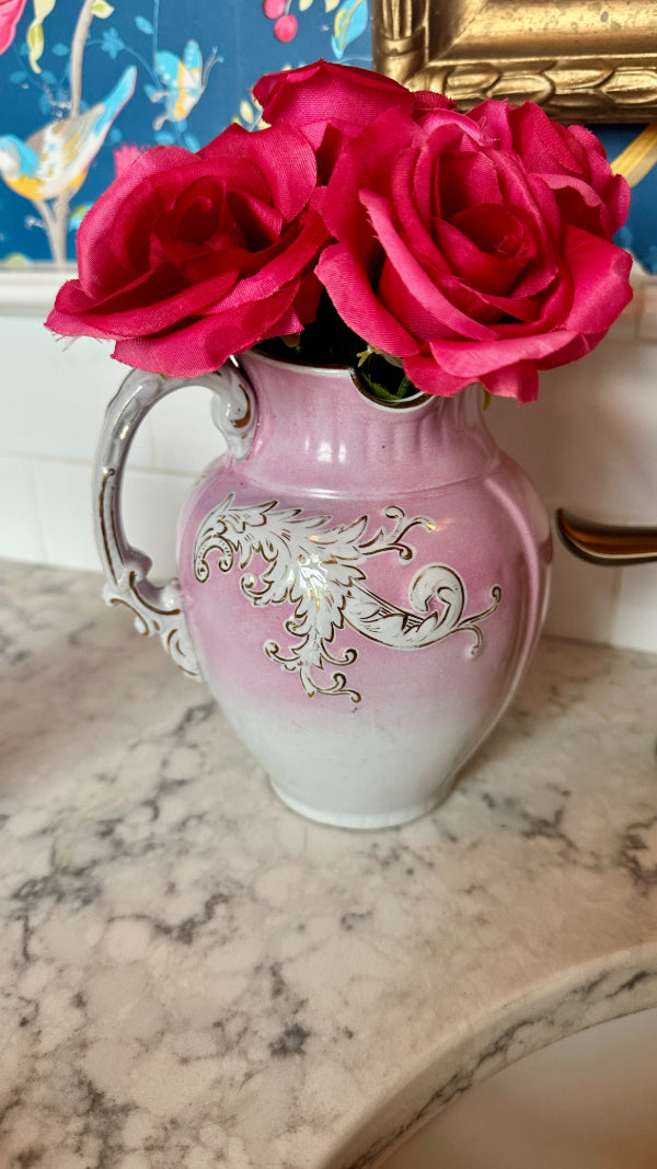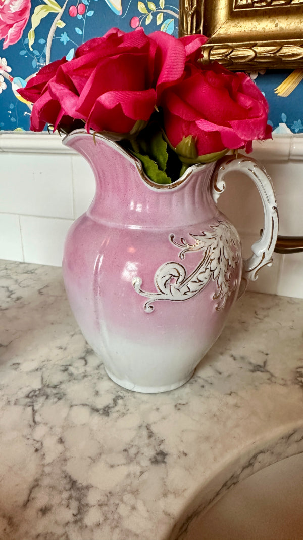 This Vintage Pitcher & Soap Dish from Royal Ironstone by W.H. Grindley & Co., England showcases classic craftsmanship and timeless elegance. Made from durable ironstone, the pitcher and soap dish feature a pink and white fade coloring with gold and white detail. the set is perfect for adding vintage charm to any bathroom or kitchen. Ideal for collectors or those seeking unique, functional décor pieces with a rich history. Some wear on the soap dish with a small crack.