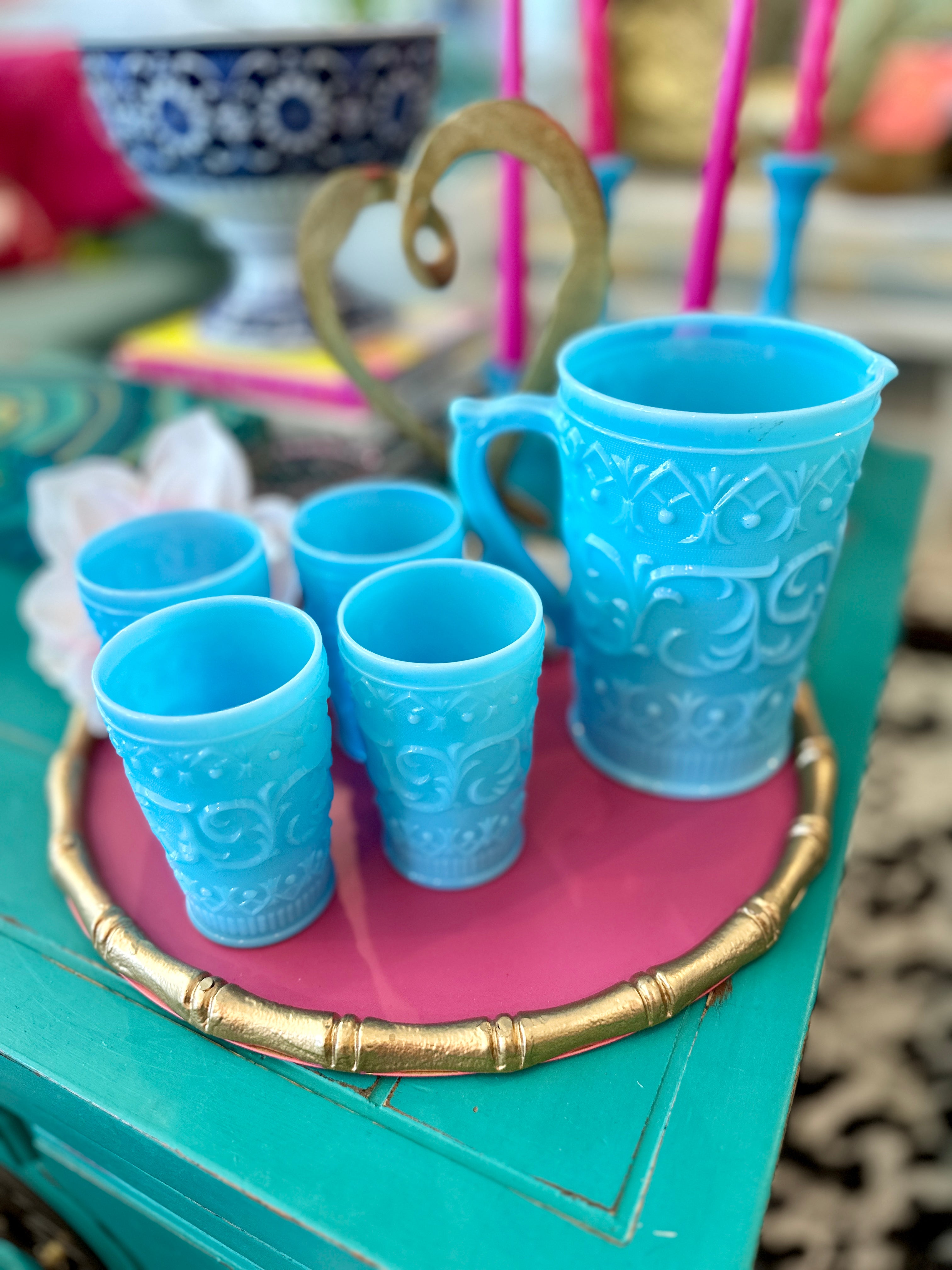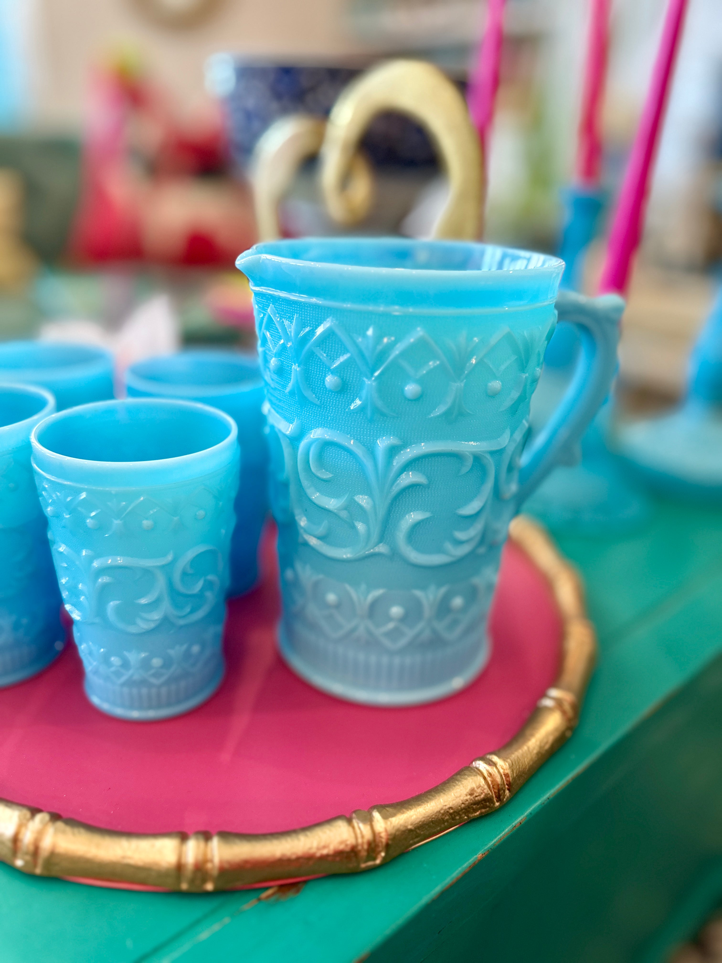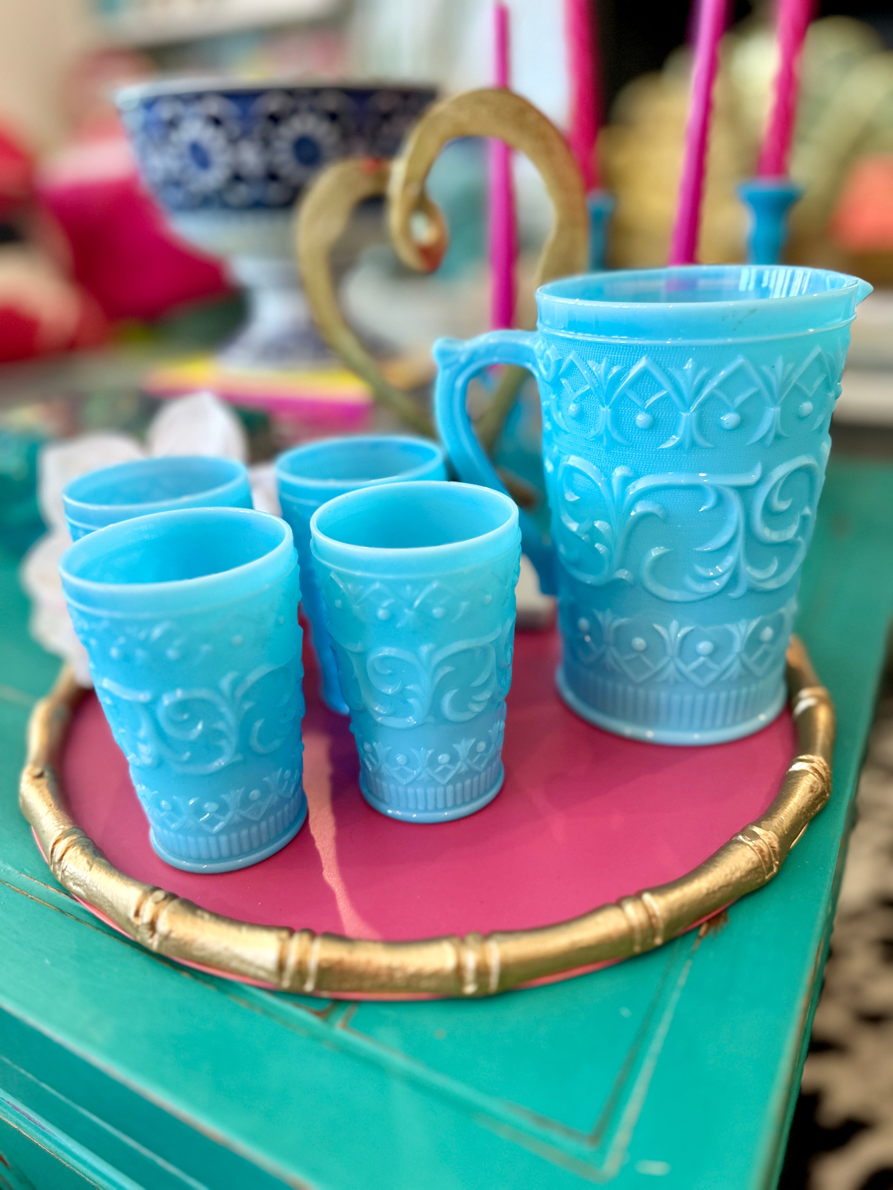Charming vintage pitcher and glasses set. Crafted from blue milk glass opaline, each piece features a delightful swirl and dot design, adding a touch of whimsy to any table setting. This 5-piece set includes a pitcher and four matching glasses, perfect for serving your favorite beverages with vintage flair. Whether for everyday use or special occasions, this set promises to elevate your entertaining style. pristine vintage condition!!