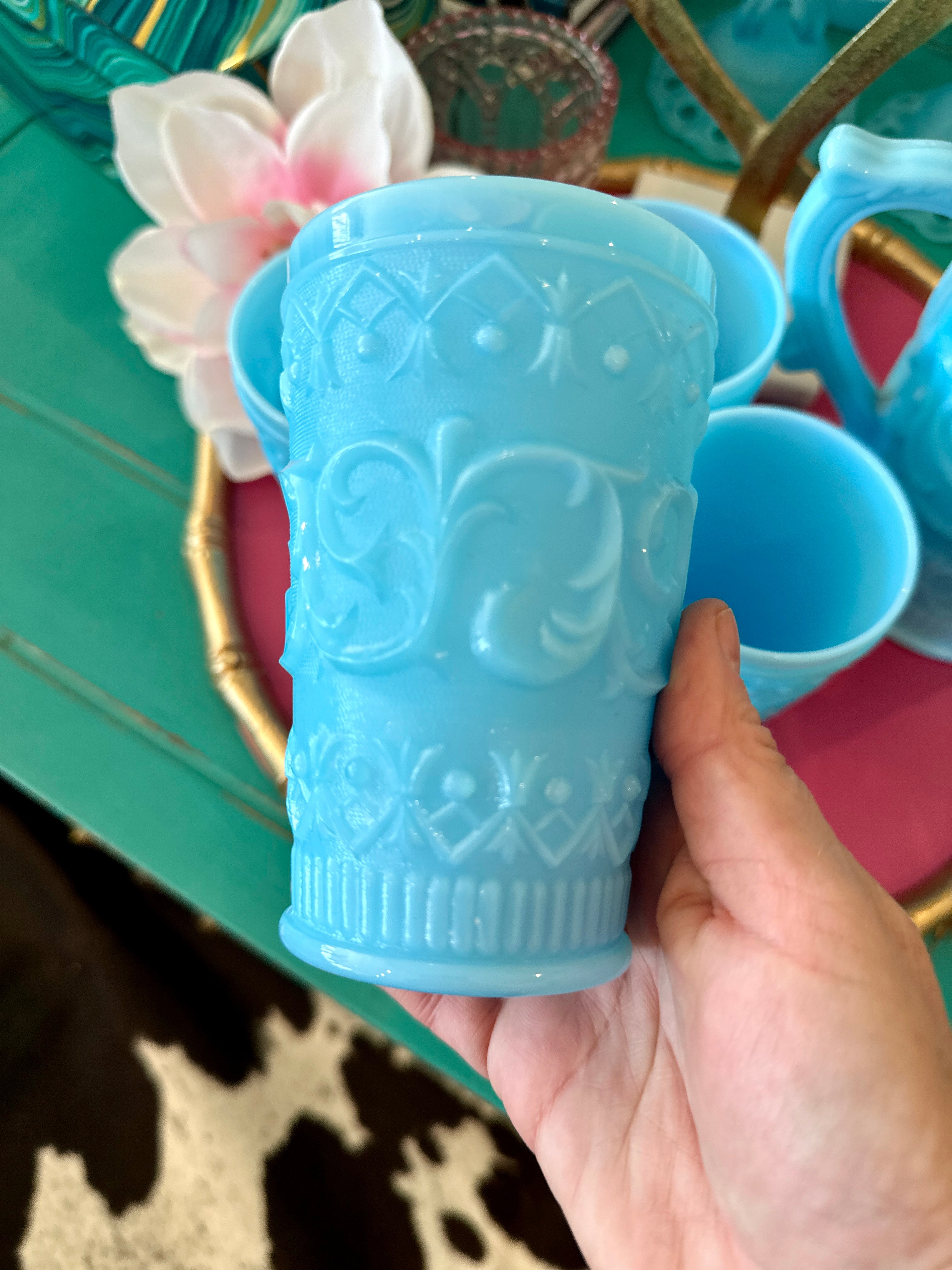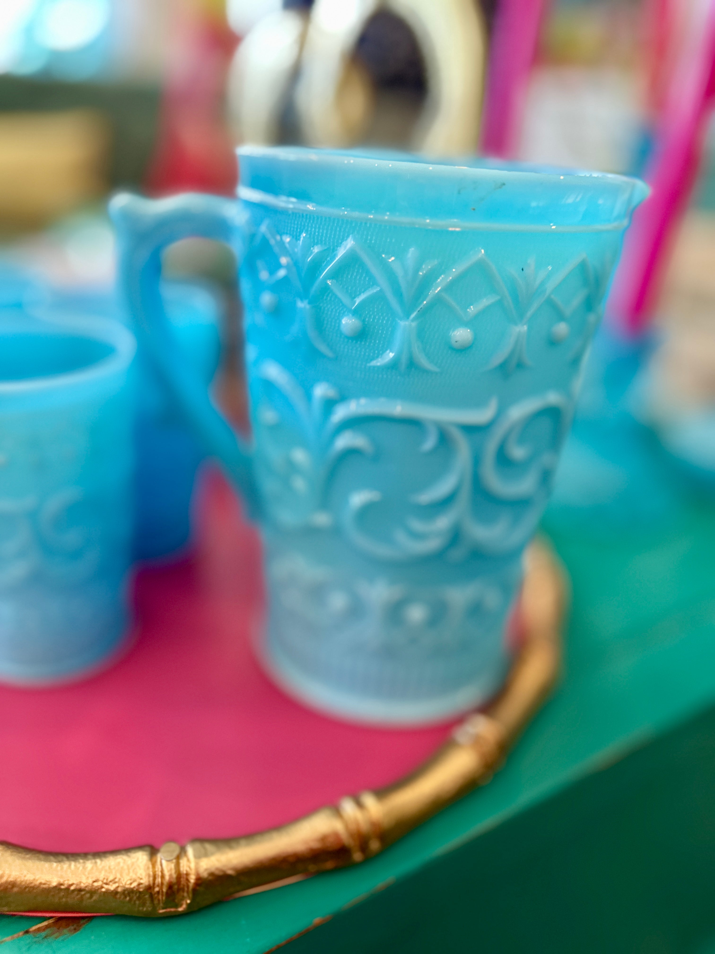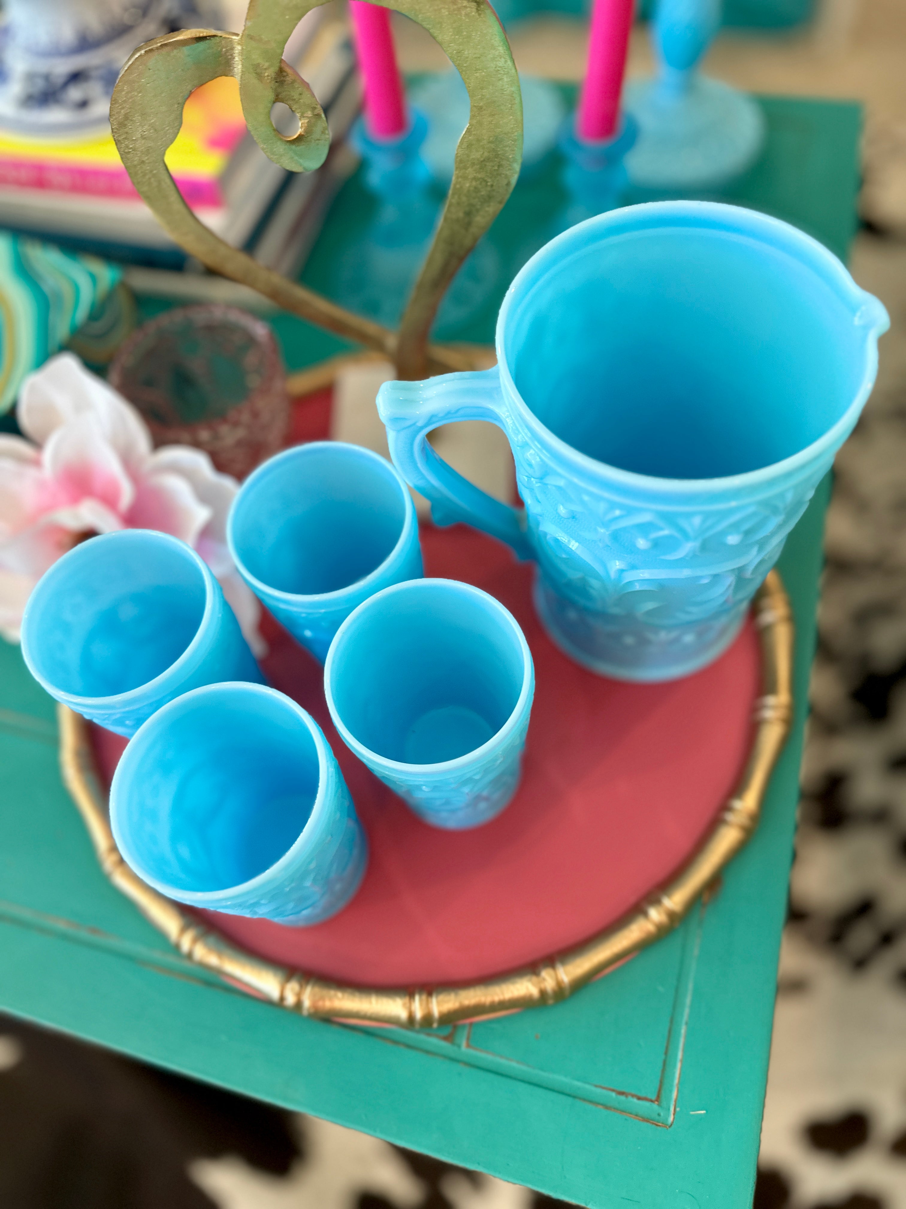Charming vintage pitcher and glasses set. Crafted from blue milk glass opaline, each piece features a delightful swirl and dot design, adding a touch of whimsy to any table setting. This 5-piece set includes a pitcher and four matching glasses, perfect for serving your favorite beverages with vintage flair. Whether for everyday use or special occasions, this set promises to elevate your entertaining style. pristine vintage condition!!