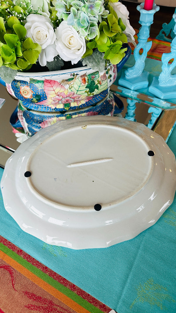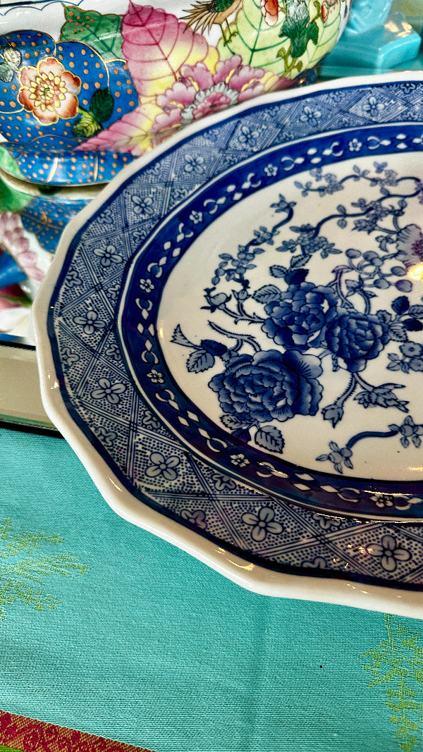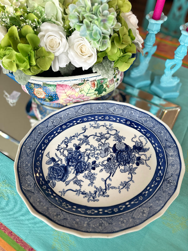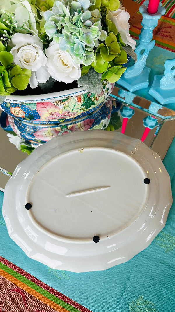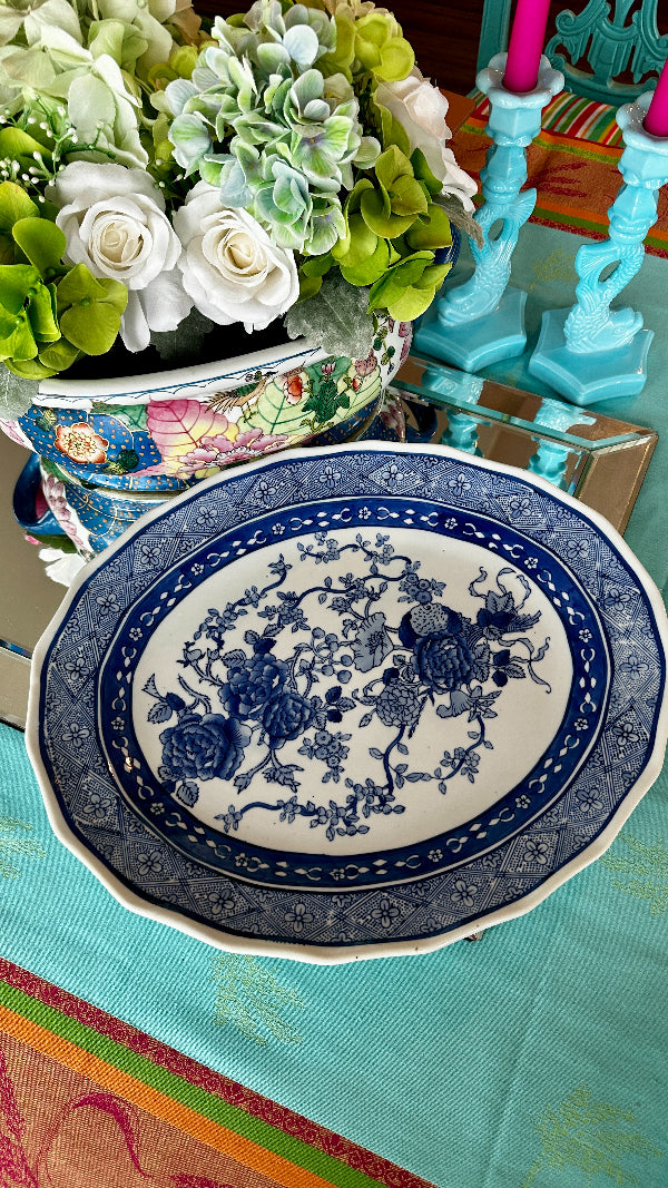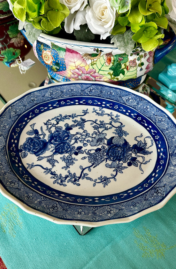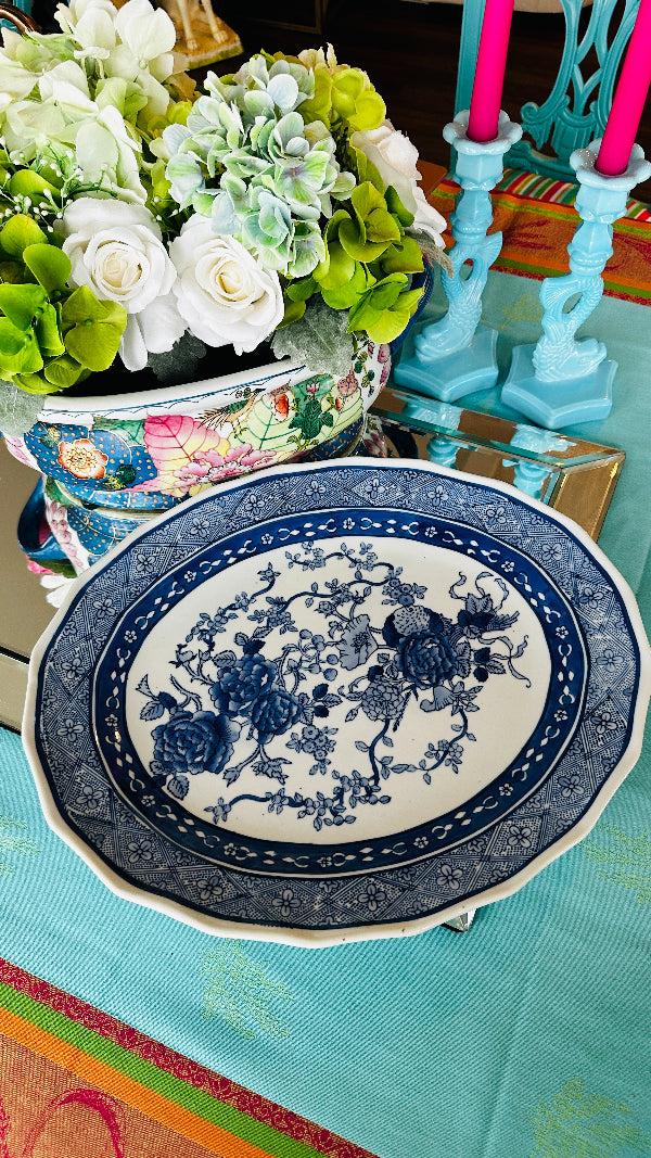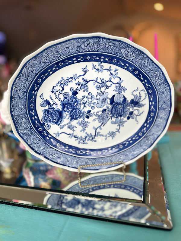 Vintage Oval Platter, with a delicate blue and white floral pattern and scalloped edge. Crafted with timeless elegance, this exquisite piece adds a touch of sophistication to any table setting. Whether used for serving meals or displayed as a decorative accent, this vintage platter promises to impress with its charming design and classic appeal.
