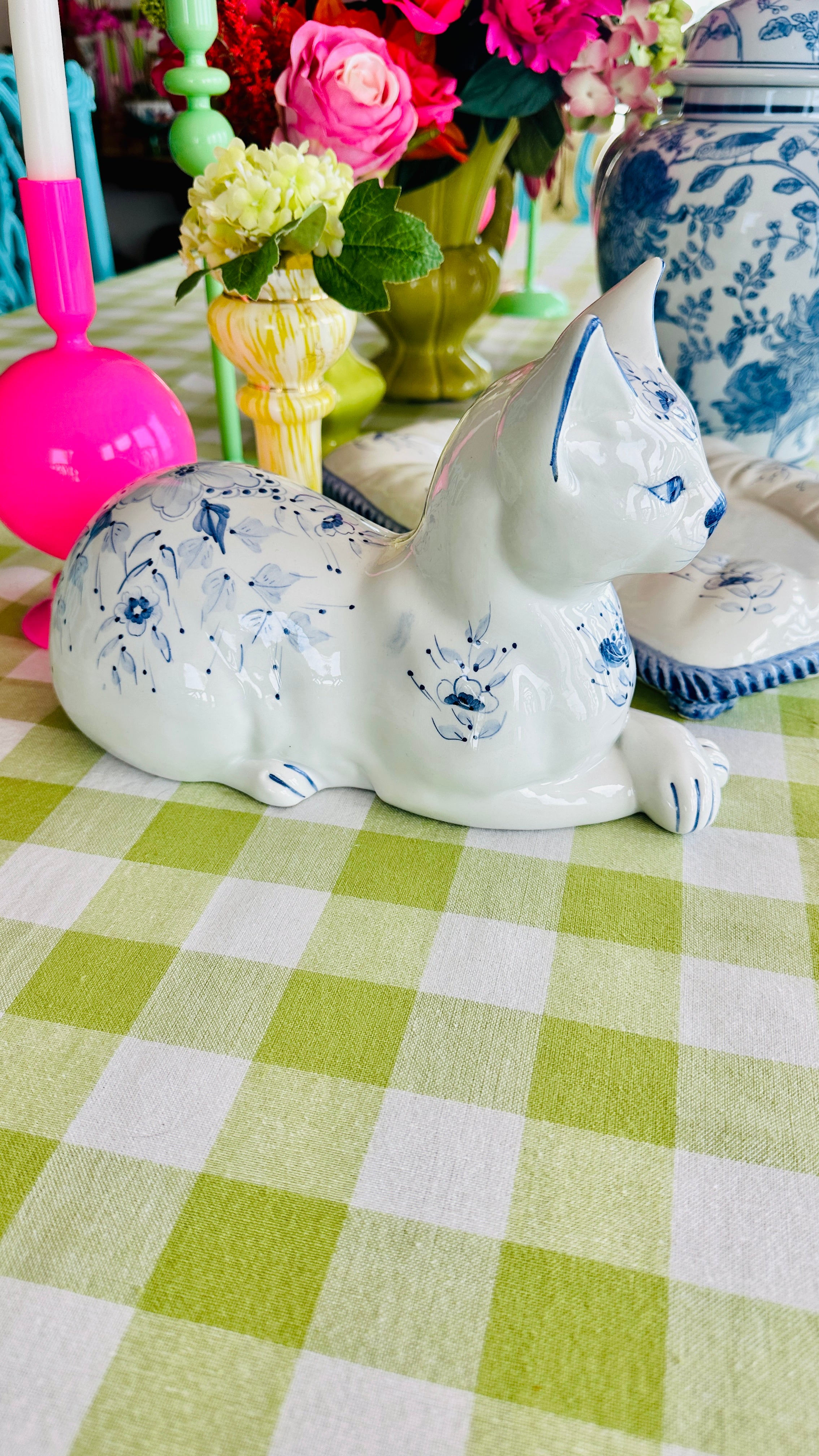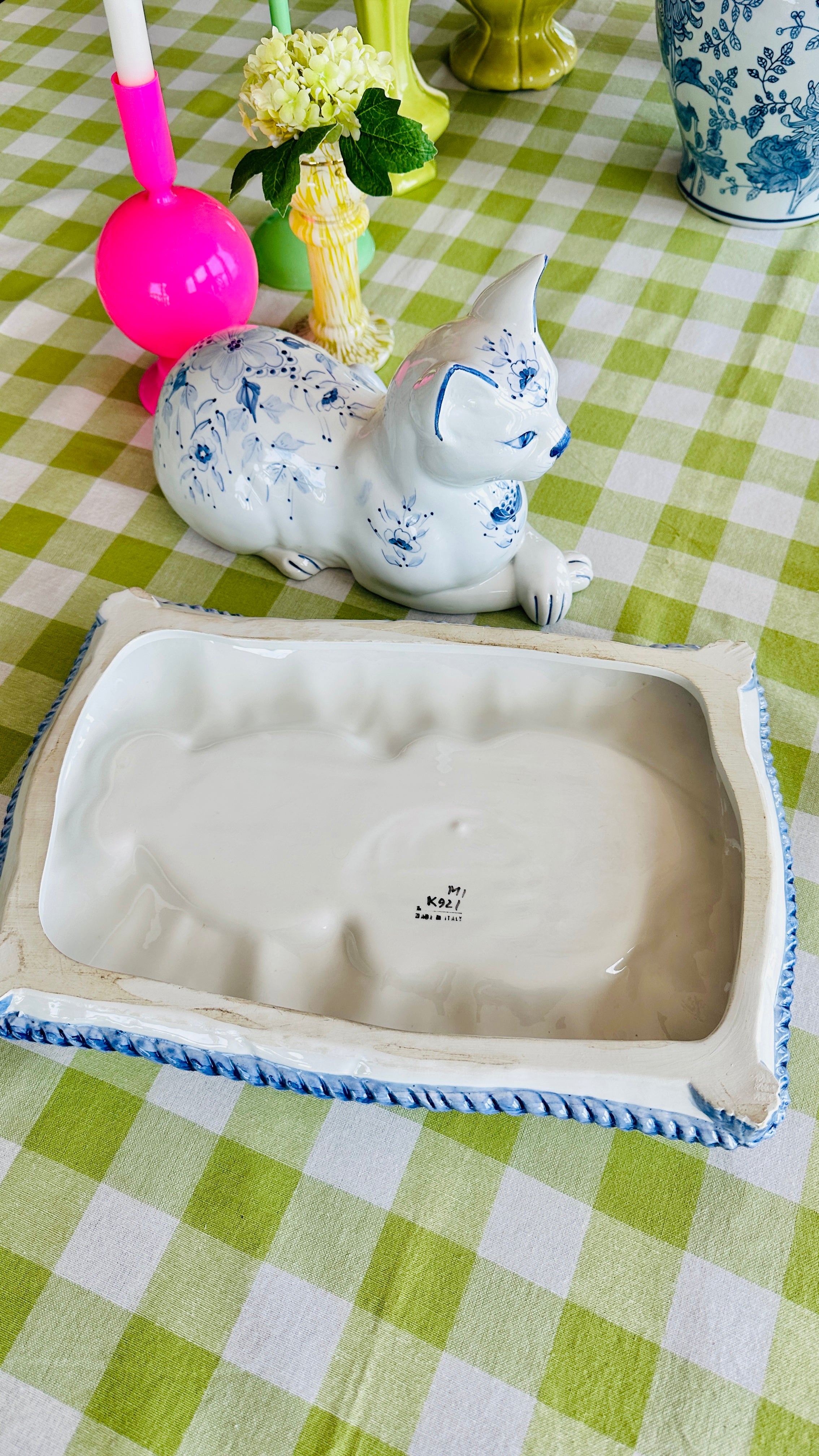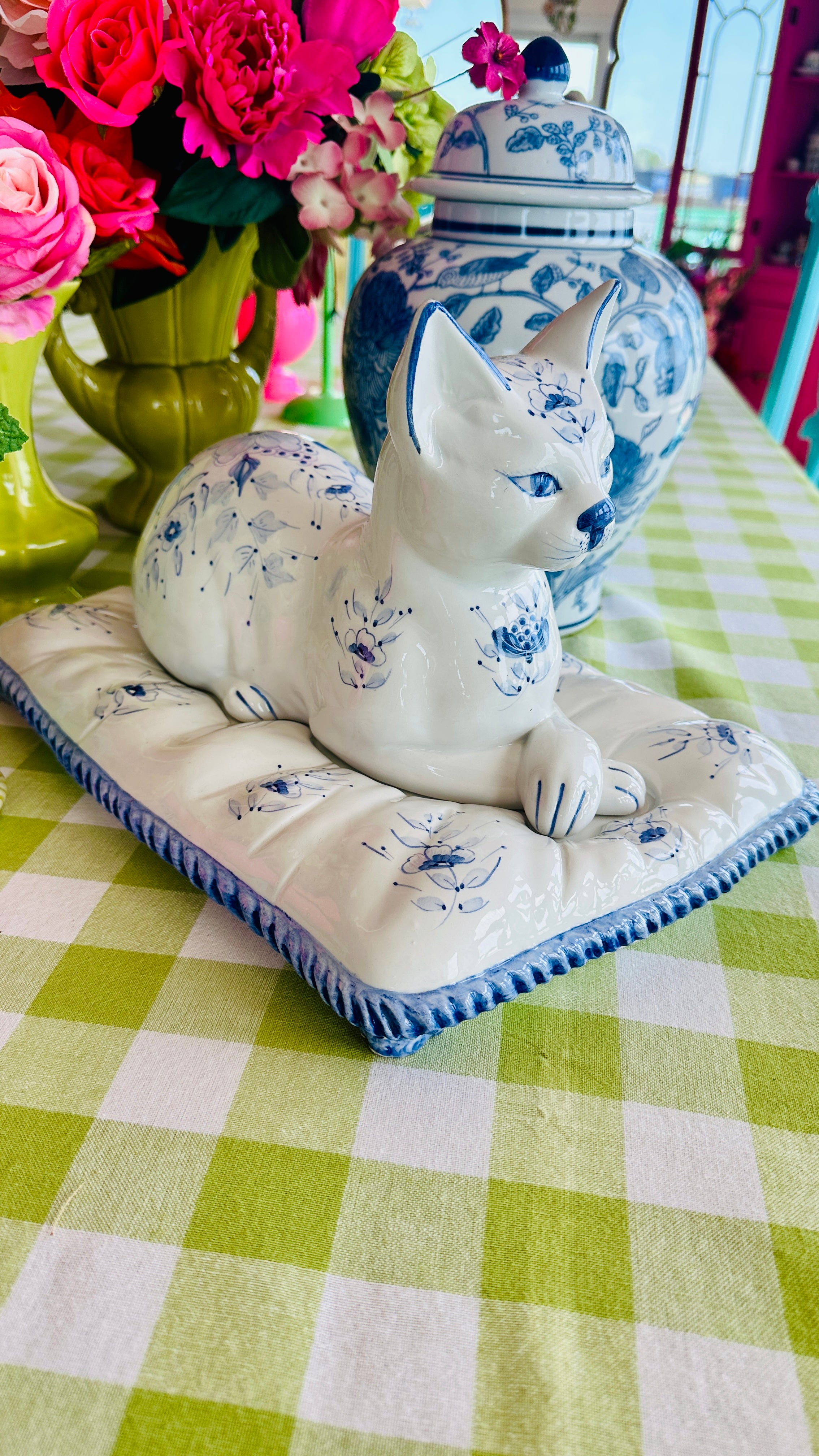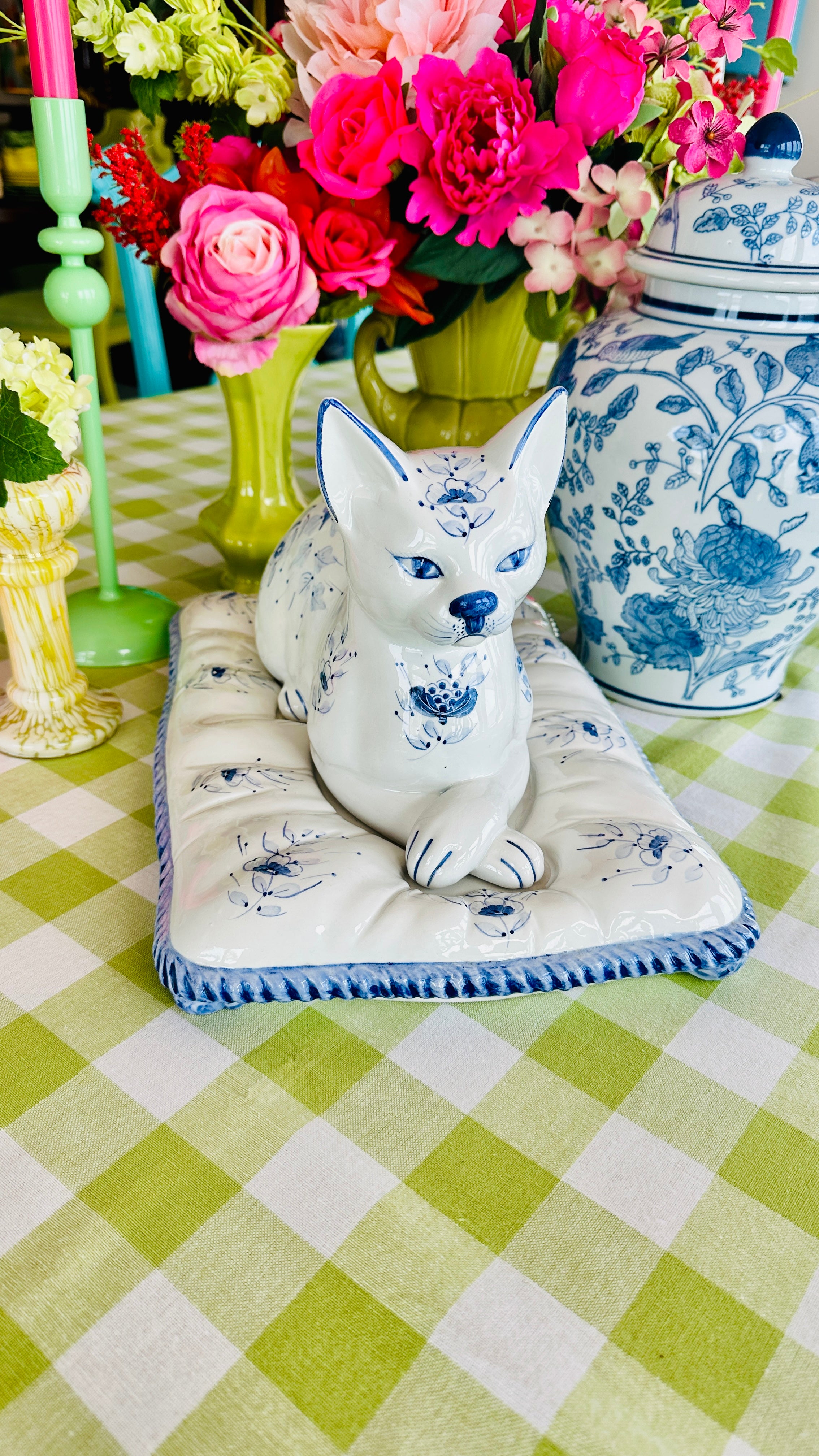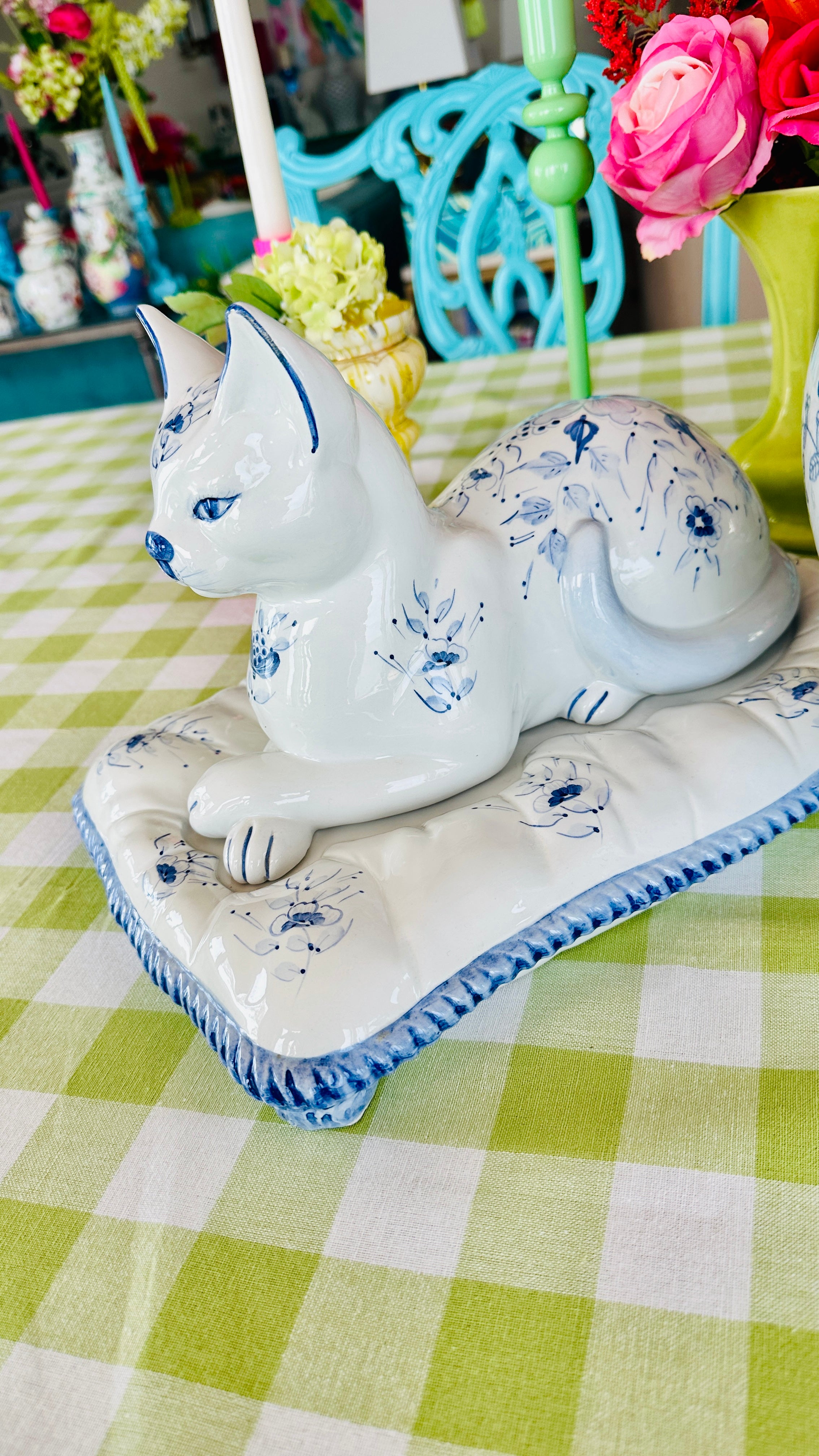 This Vintage Porcelain Cat on Pillow Figurine from Italy features a charming blue and white design. Crafted with attention to detail, this set of two pieces adds a touch of vintage elegance to any room. Made with fine porcelain, This figurine is a must-have for any cat lover or collector.
