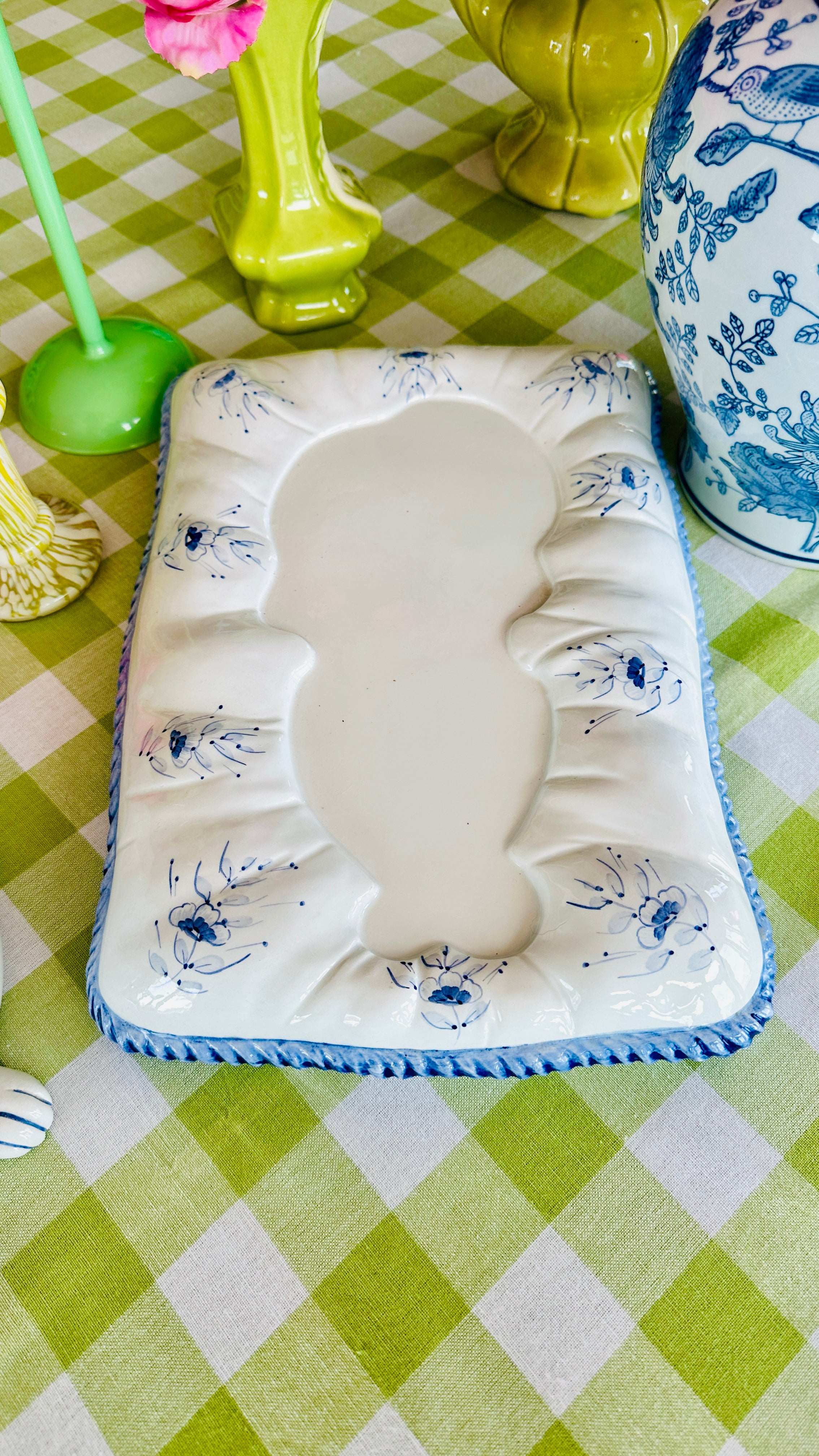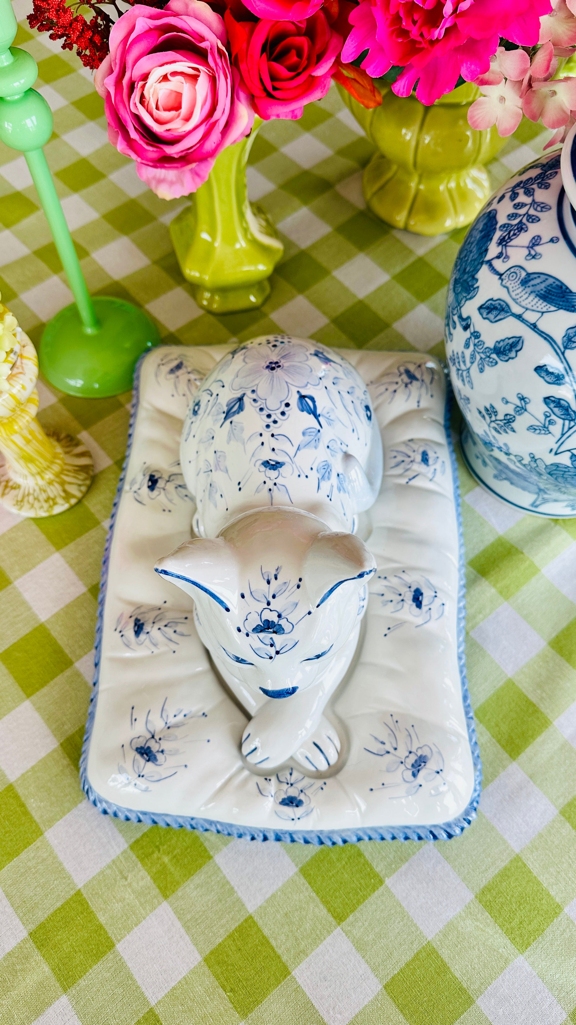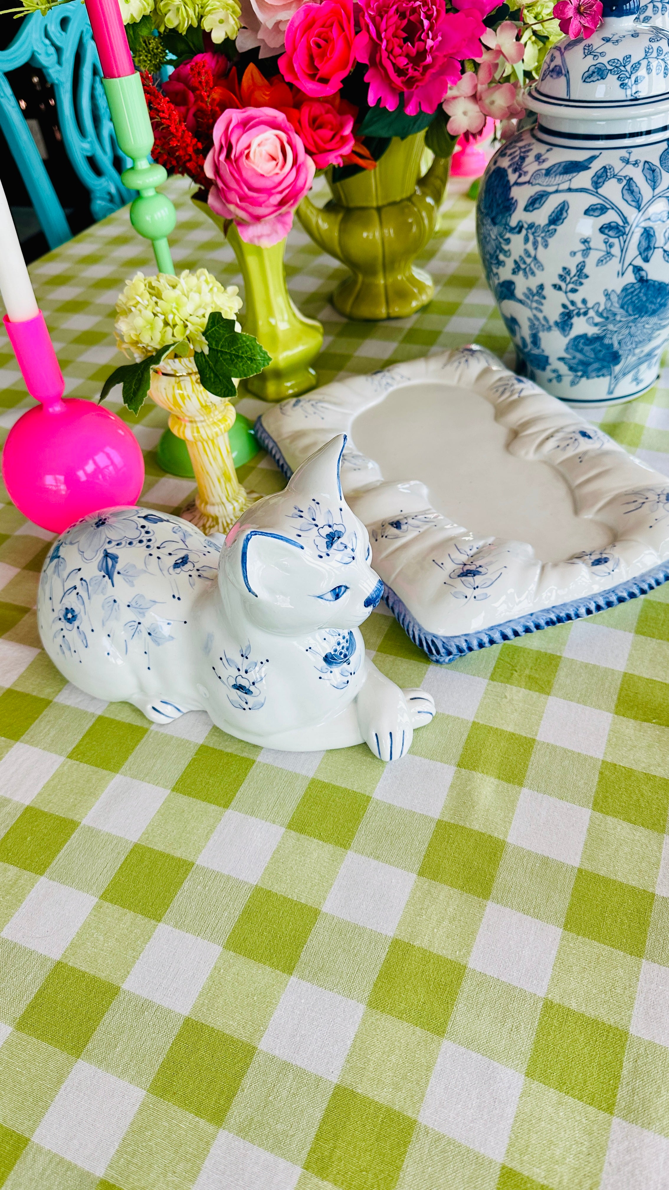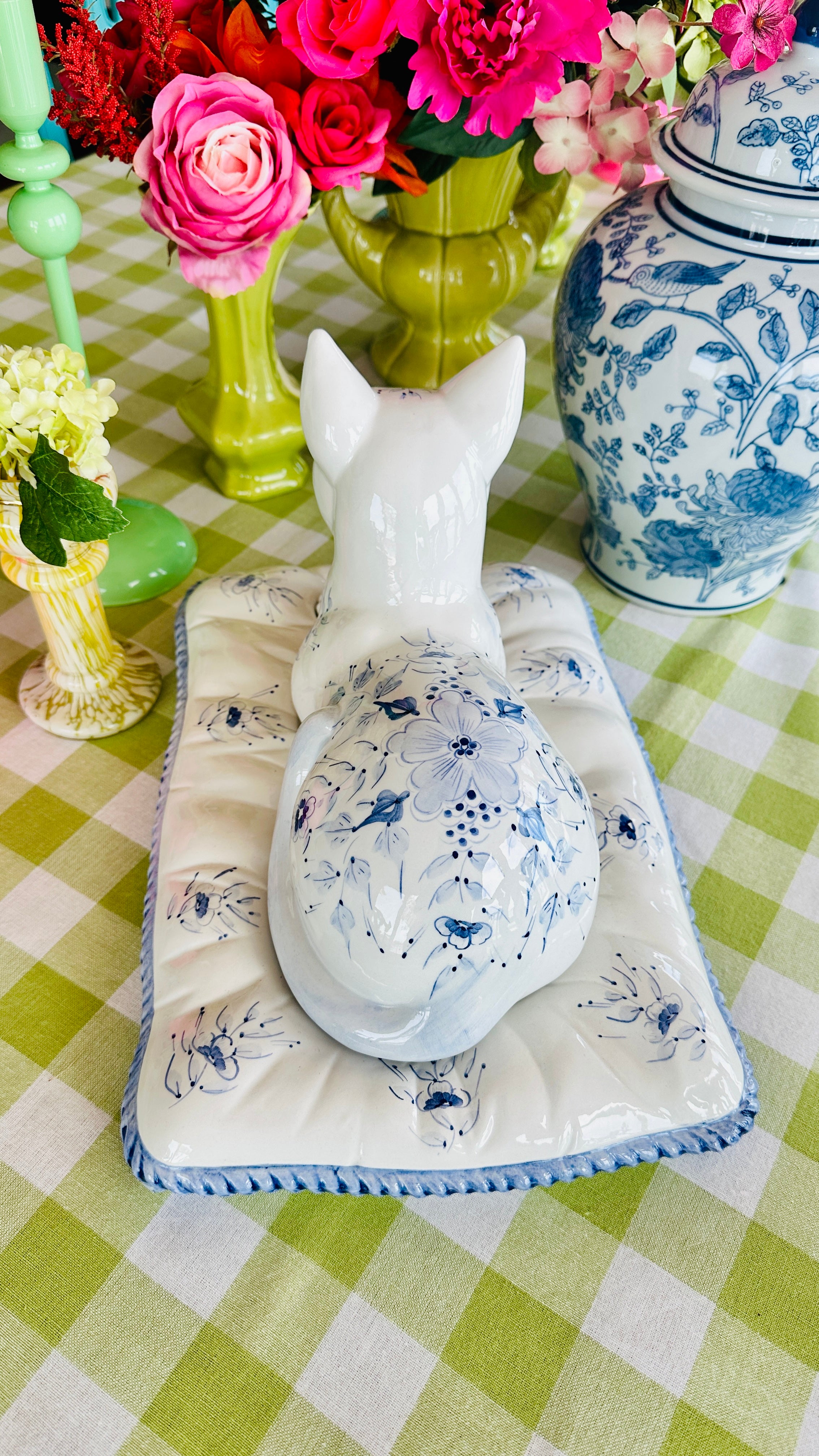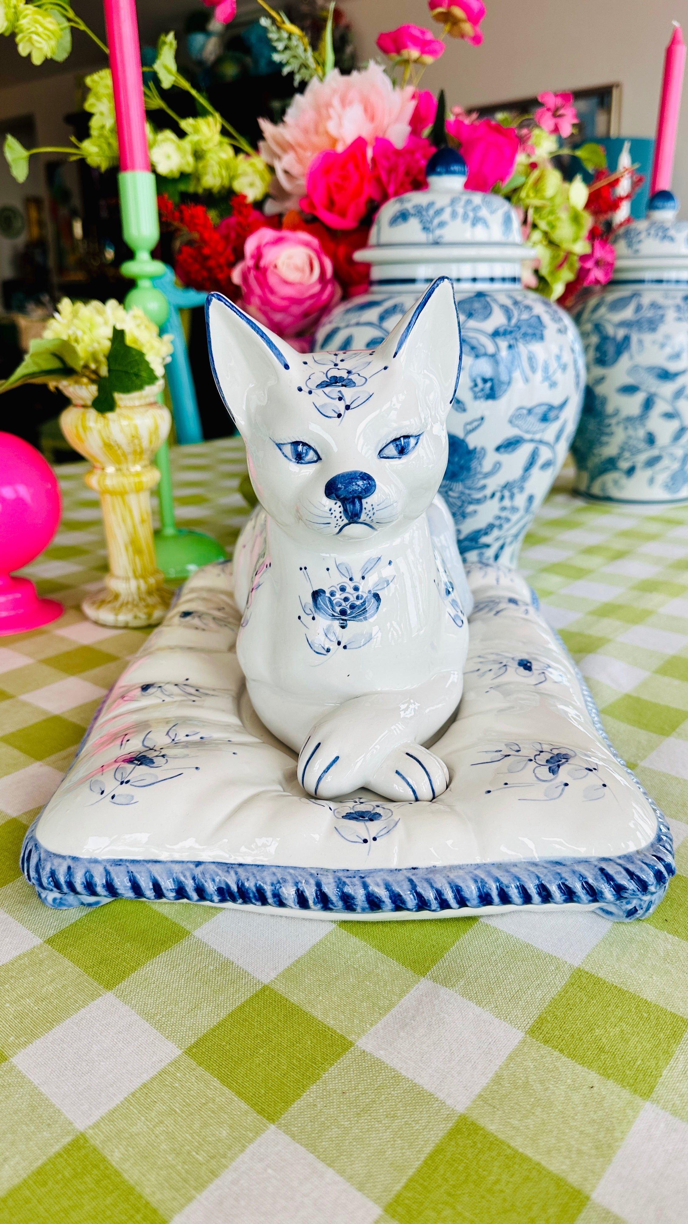 This Vintage Porcelain Cat on Pillow Figurine from Italy features a charming blue and white design. Crafted with attention to detail, this set of two pieces adds a touch of vintage elegance to any room. Made with fine porcelain, This figurine is a must-have for any cat lover or collector.
