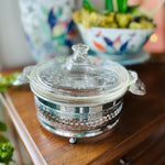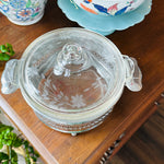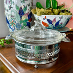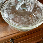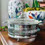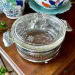 Vintage Pyrex Dish , Etched lid,in Silvertone Metal Holder