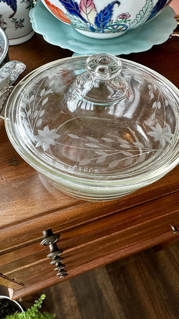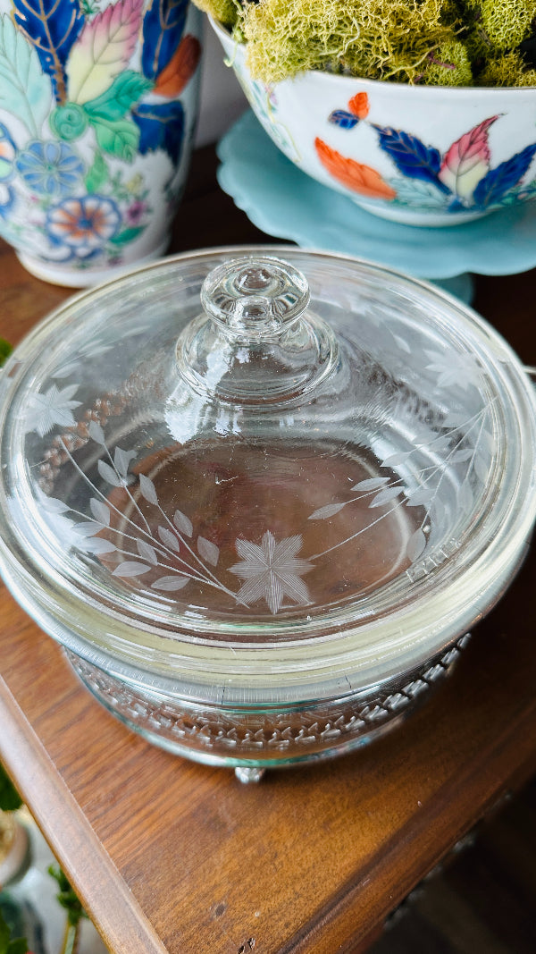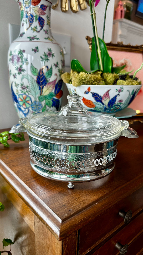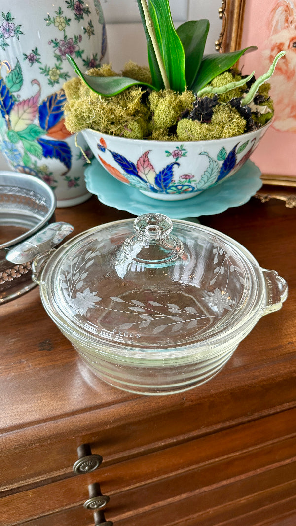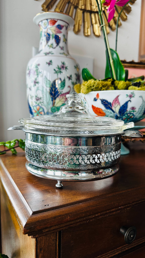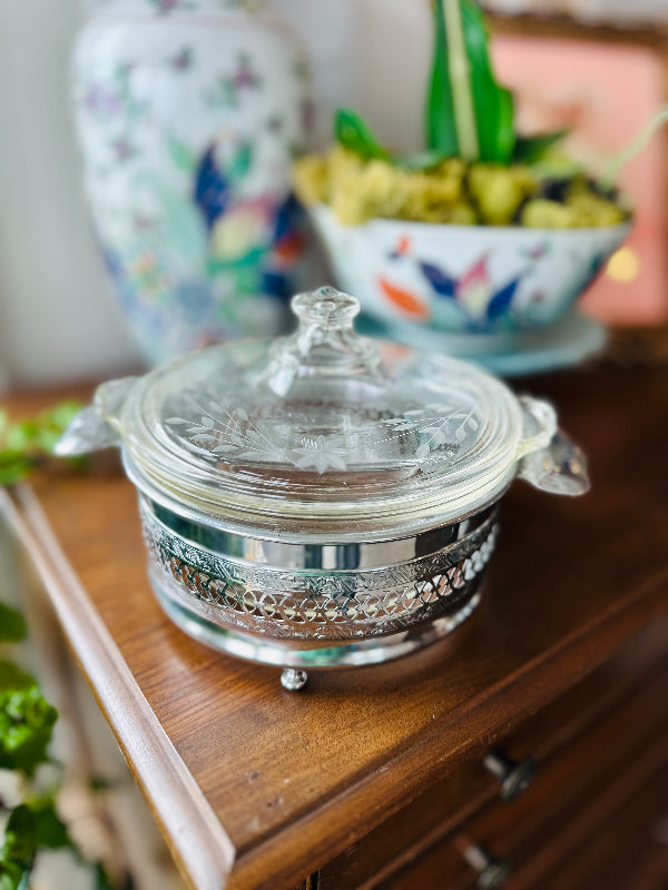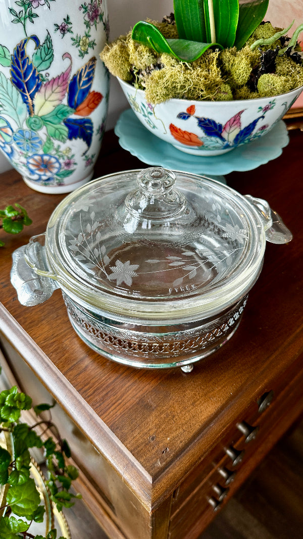 Vintage Pyrex Dish , Etched lid,in Silvertone Metal Holder