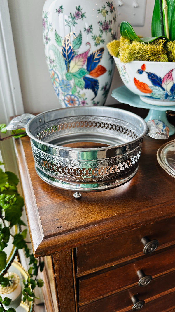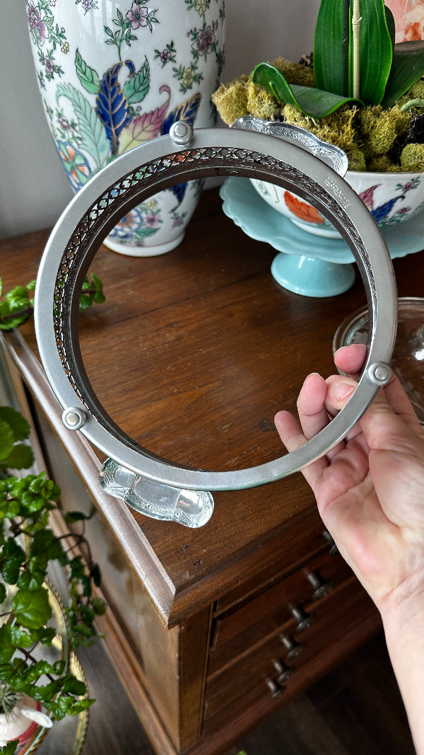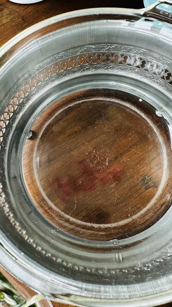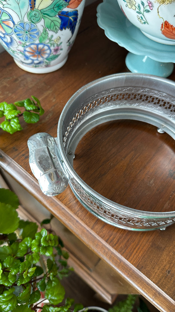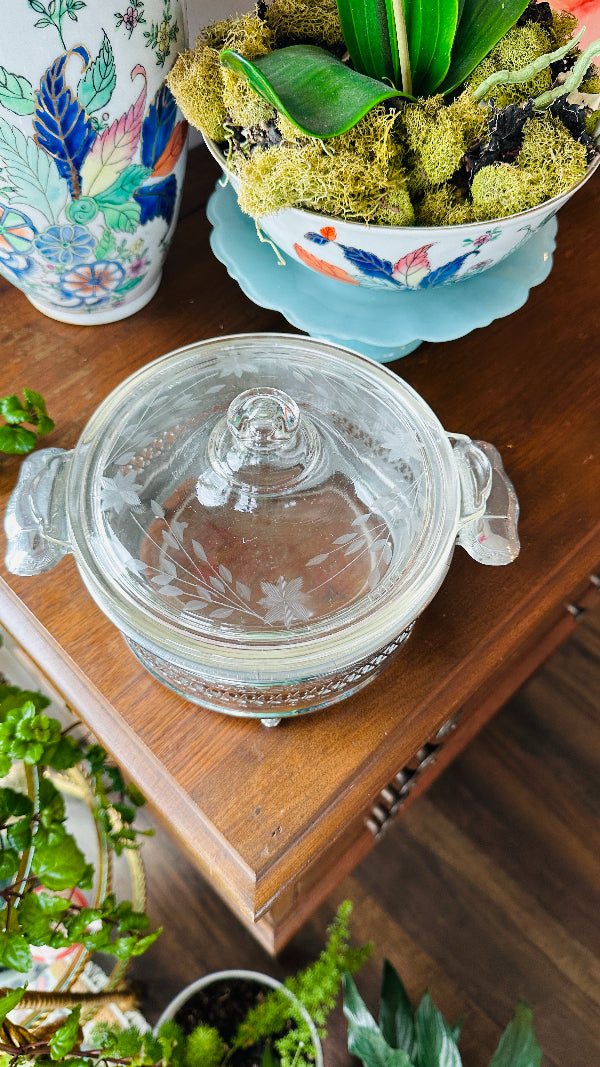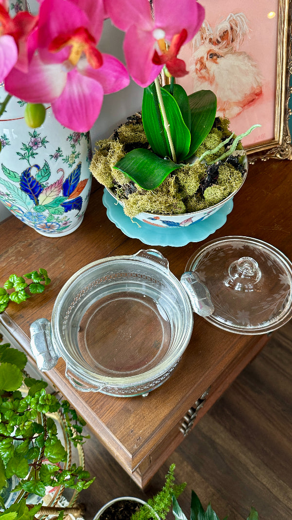 Vintage Pyrex Dish , Etched lid,in Silvertone Metal Holder