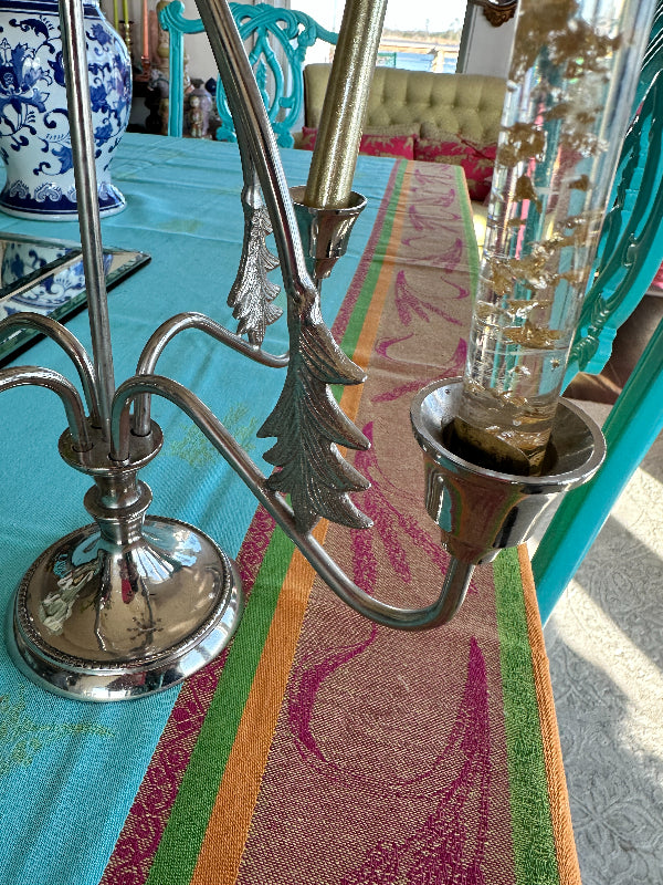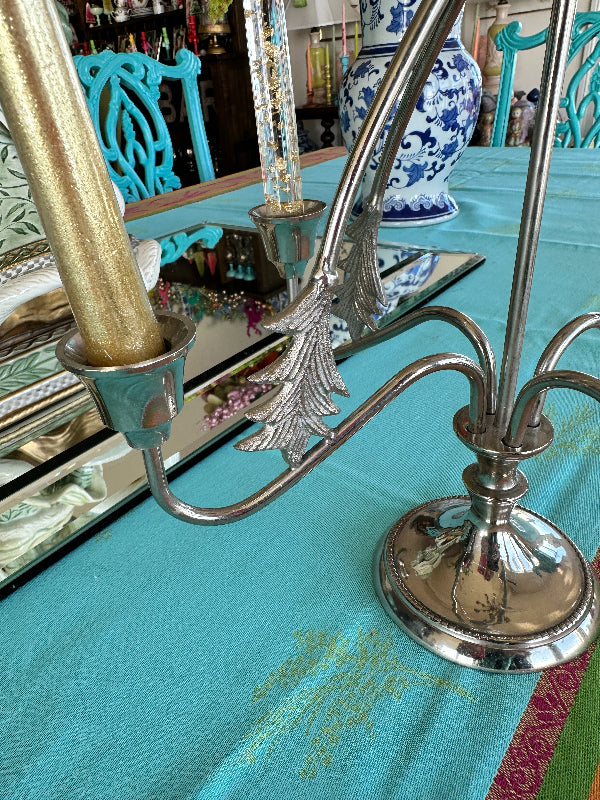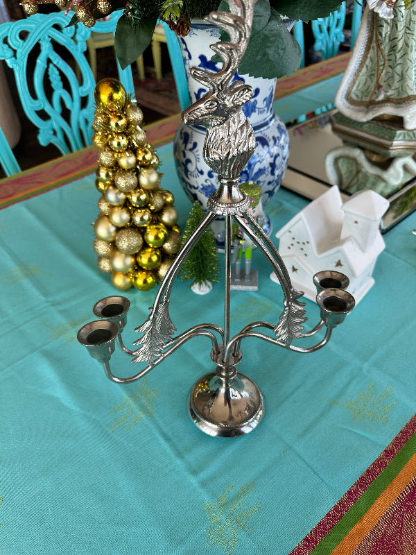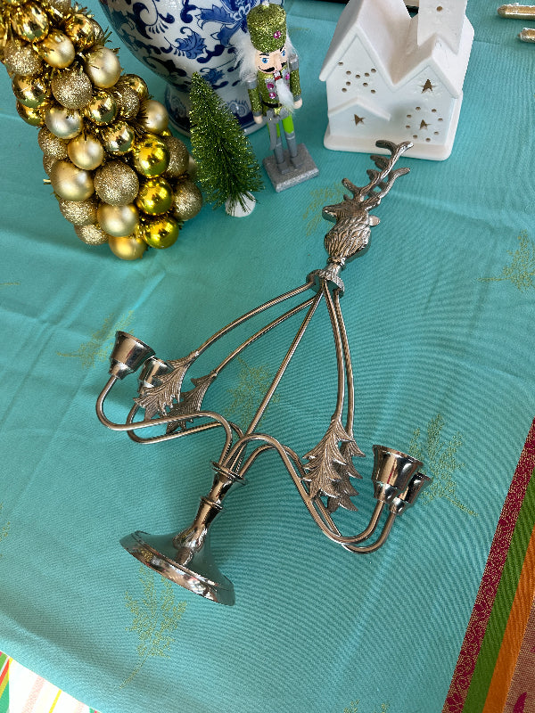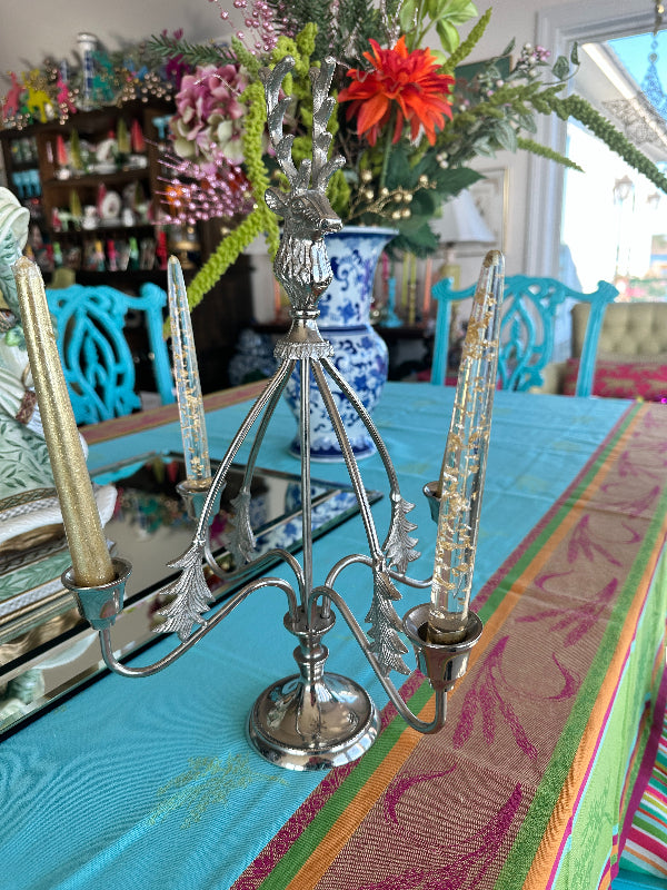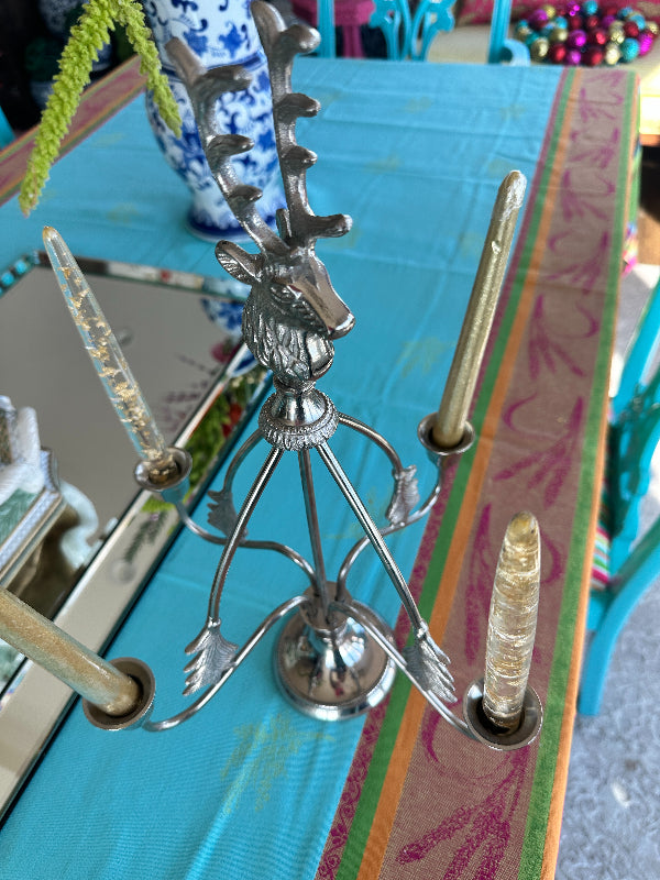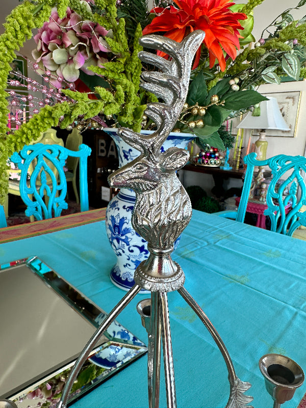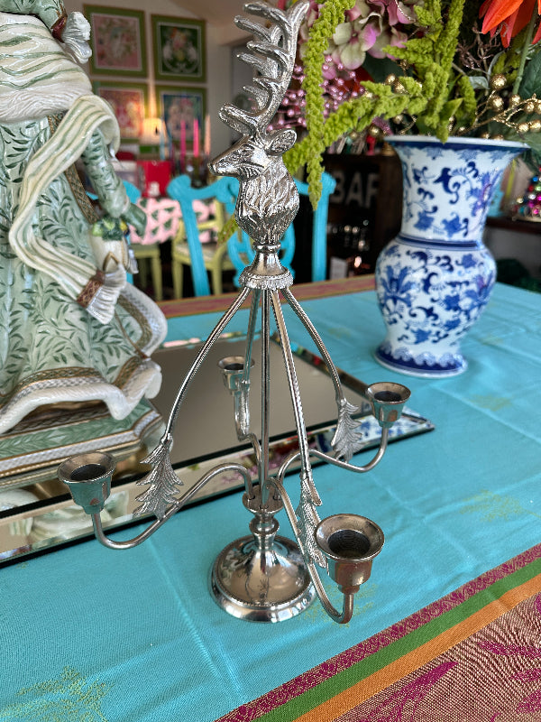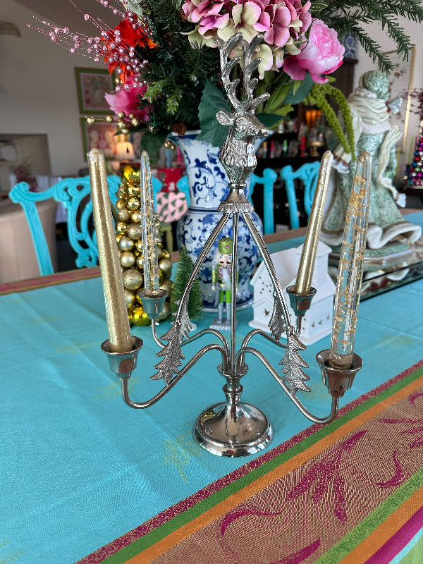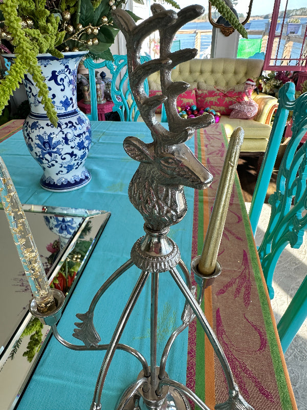 This gracefully crafted Vintage Reindeer Candle Holder in Silverplate will add an enchanting blend of festive charm and timeless elegance to any table. Illuminate your space with the warm glow of candles, casting a cozy ambiance that complements the holiday season and beyond. This candelabra holds 4 candles and folds flat for easy storage. Add it to your dining table this holiday season for a fun and festive look.