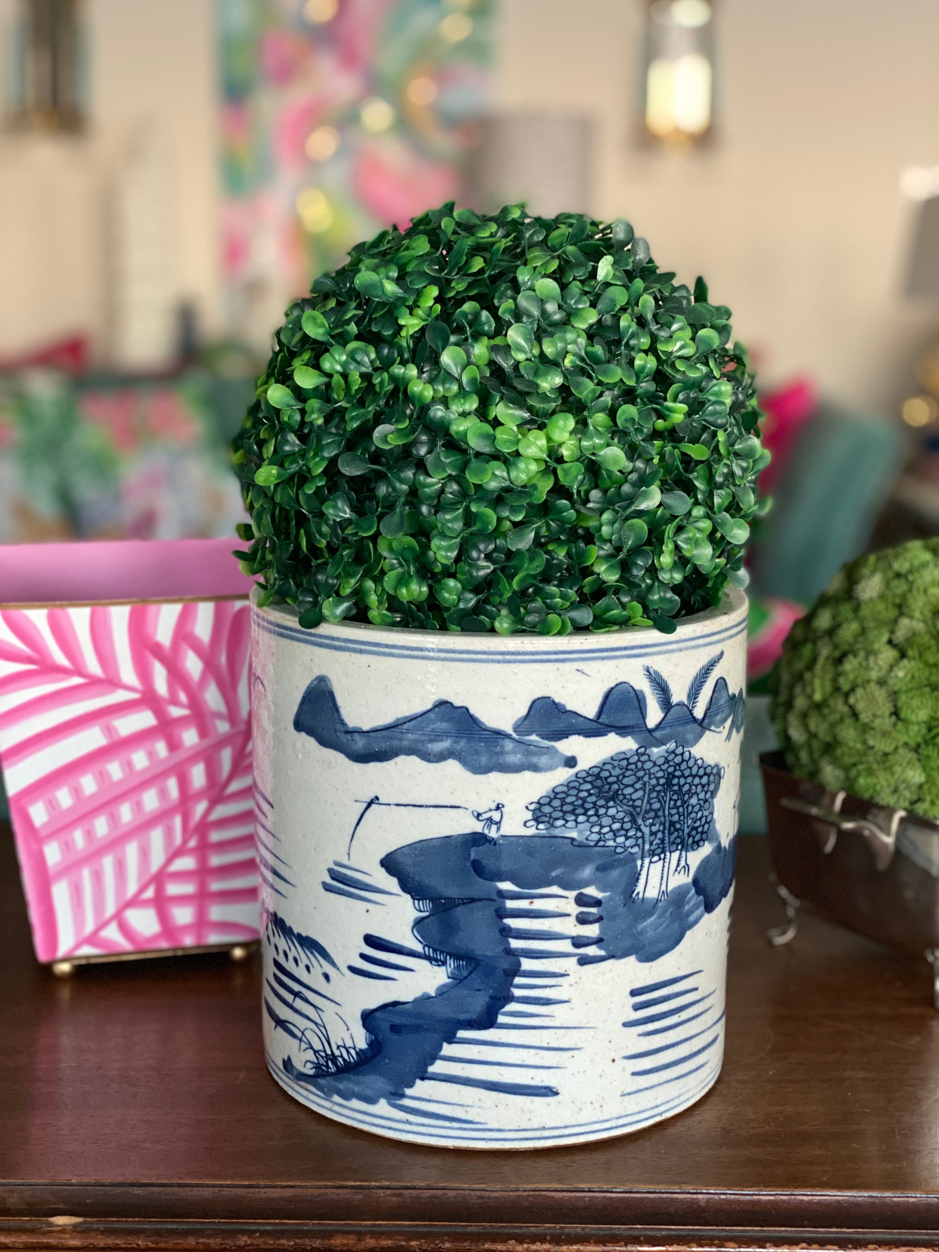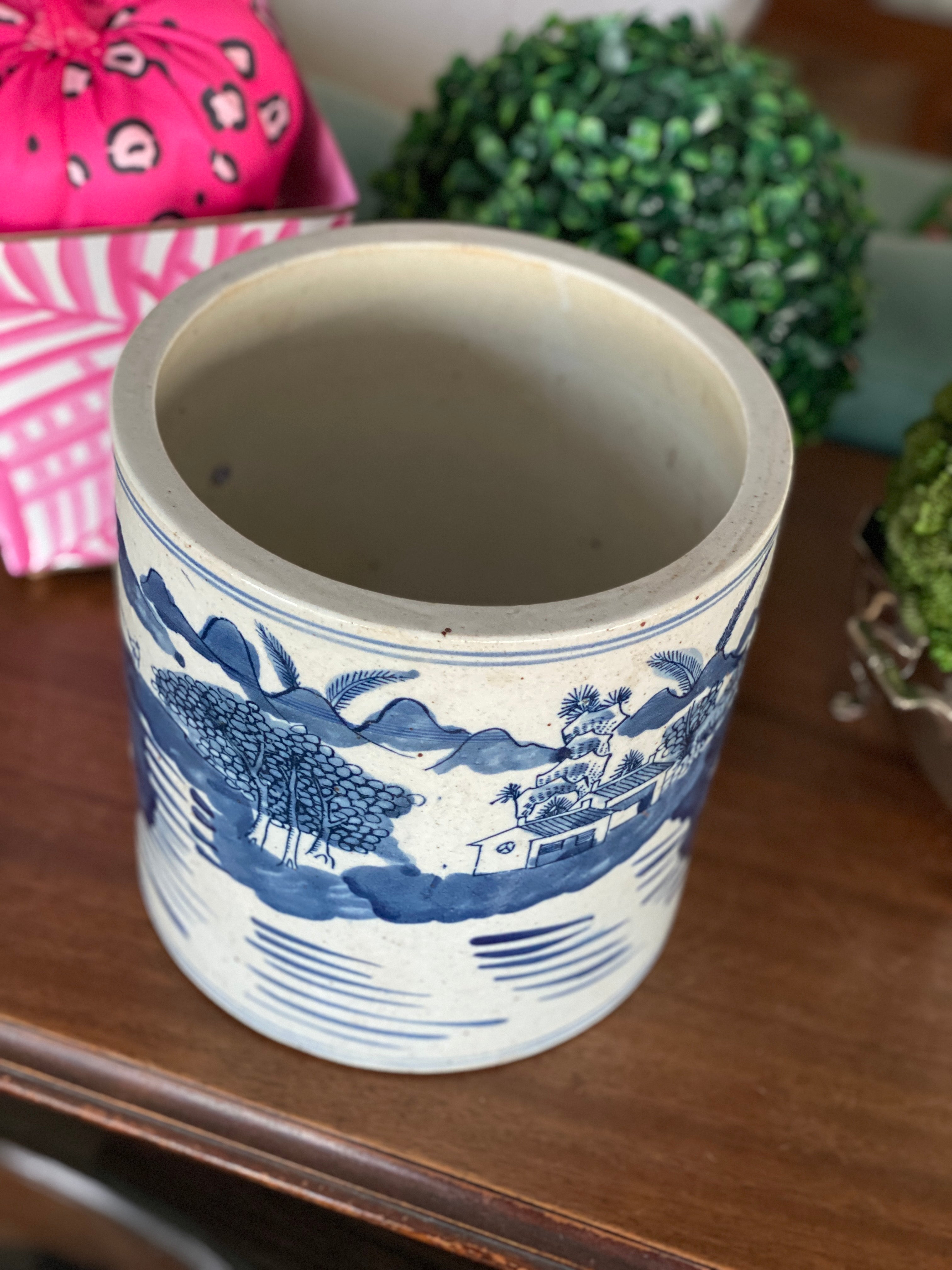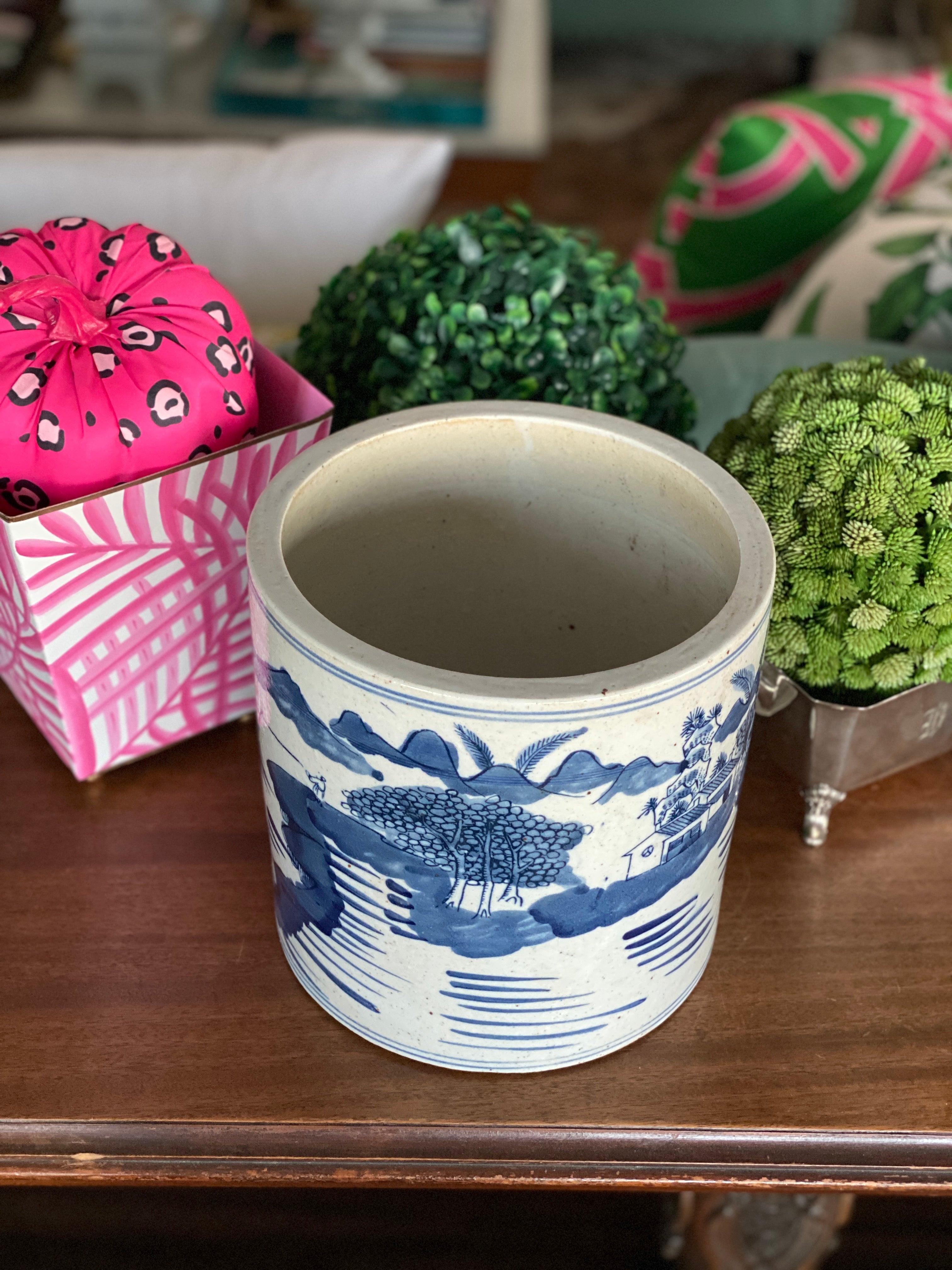 This cache pot is one of the most versatile pieces you can have. Great for a planter, perfect to store kitchen utensils, add ice and chill your favorite bottle of wine or champagne. Great for rolled hand towels in your guest bathroom, of storing extra body wash, shampoo and conditioner. Made of quality porcelain, nice and sturdy, made to appear aged but wears so well you'll want to get more than one. Classic blue and white design works with any decor style. See pictures as they are part of the description.