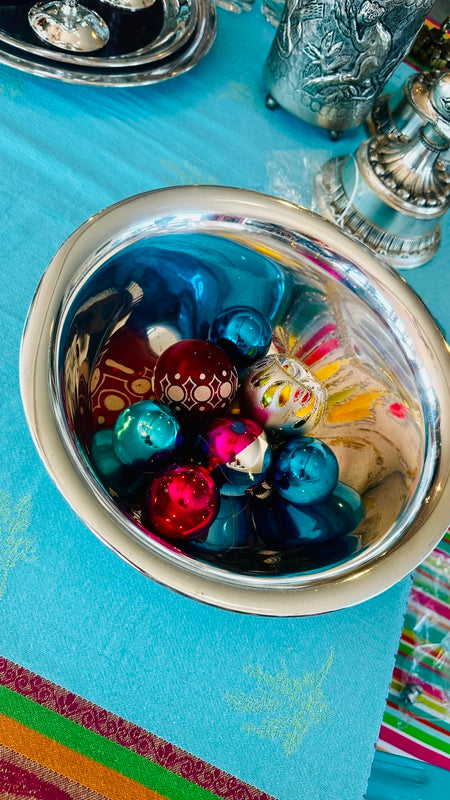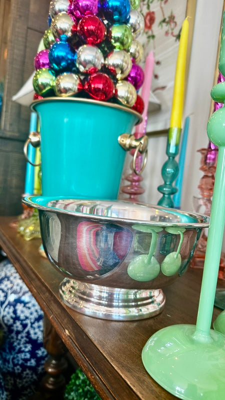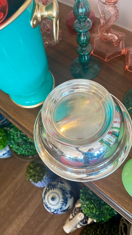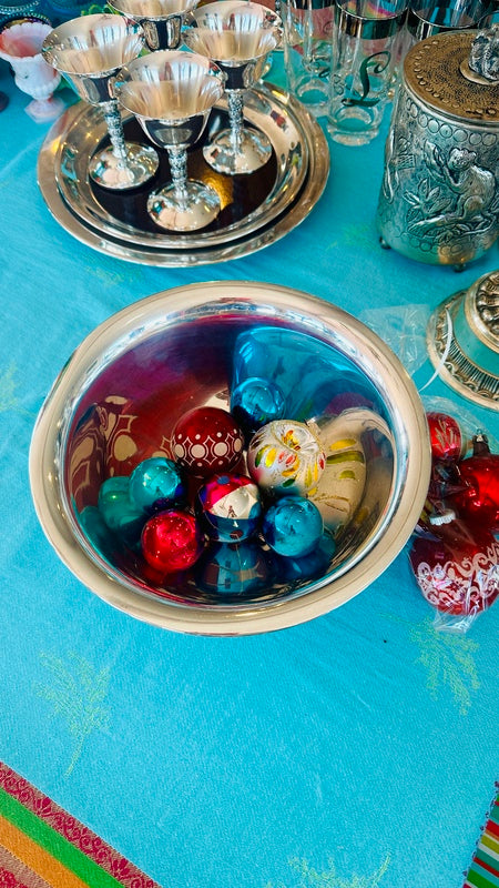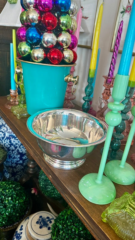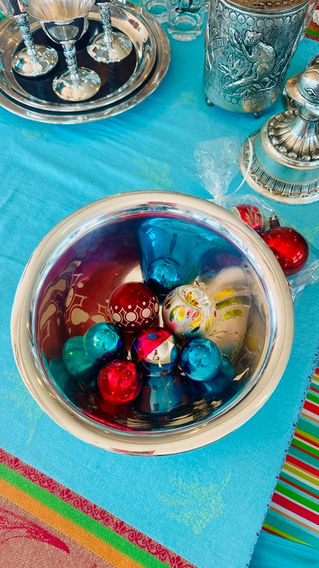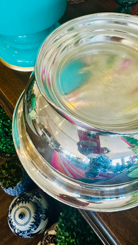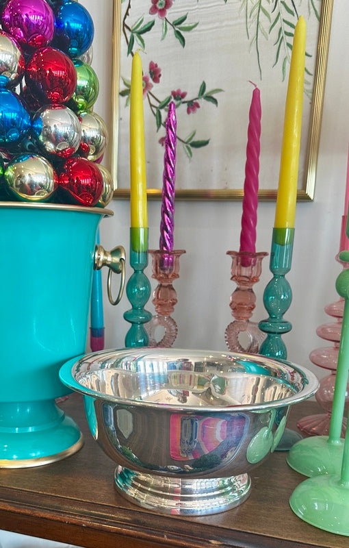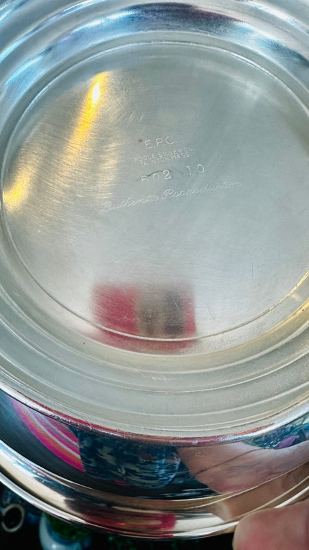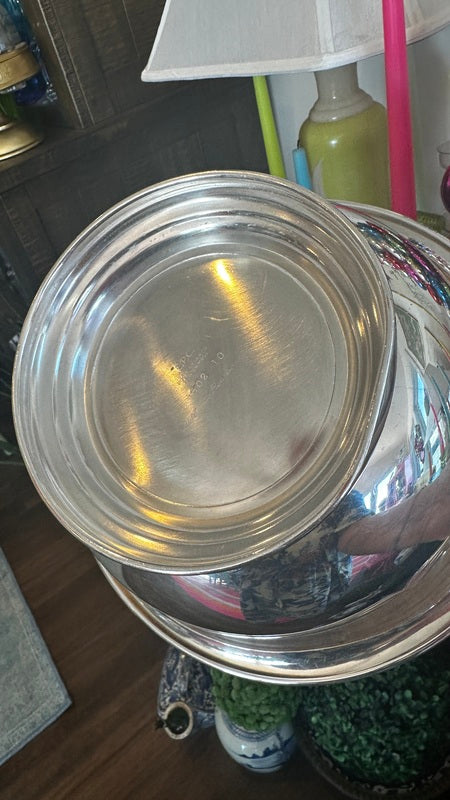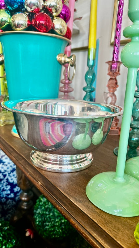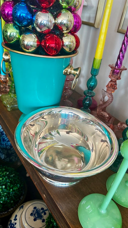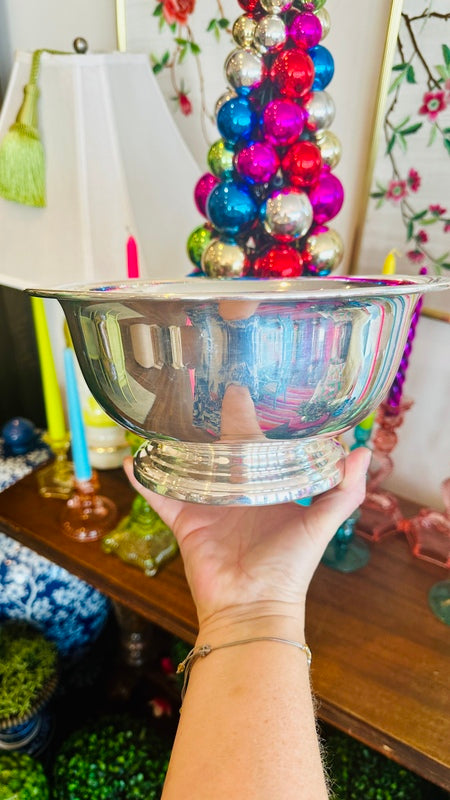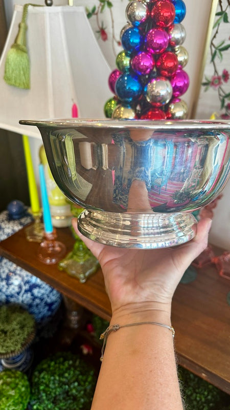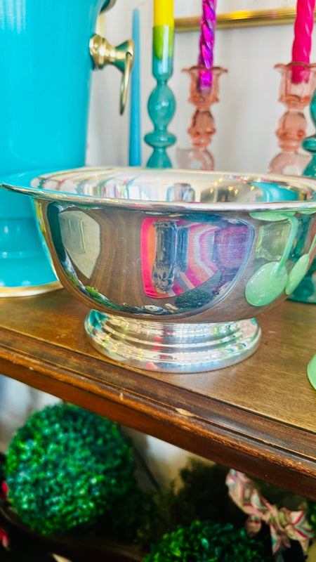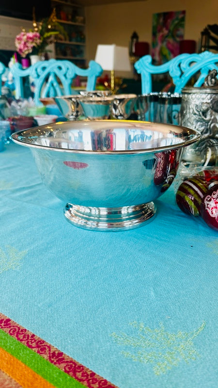 Vintage Revere Bowl by Poole Silver Co. Crafted with classic sophistication, this silver-plated bowl features a smooth, reflective finish and a gracefully flared rim, perfect for adding a touch of vintage charm to any decor or table setting. There is a slight bend on the rim and base. Ideal for collectors and lovers of fine craftsmanship.