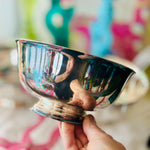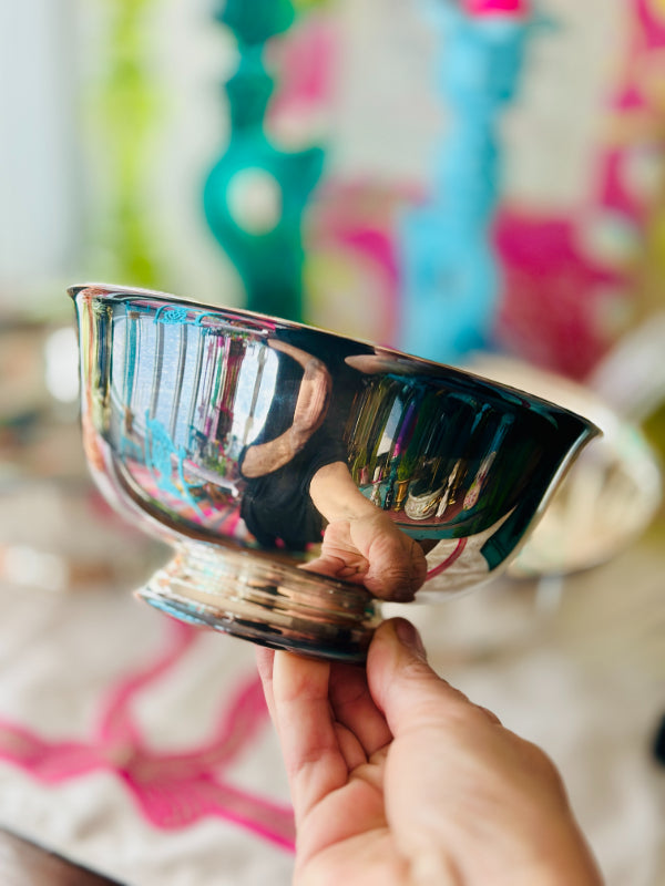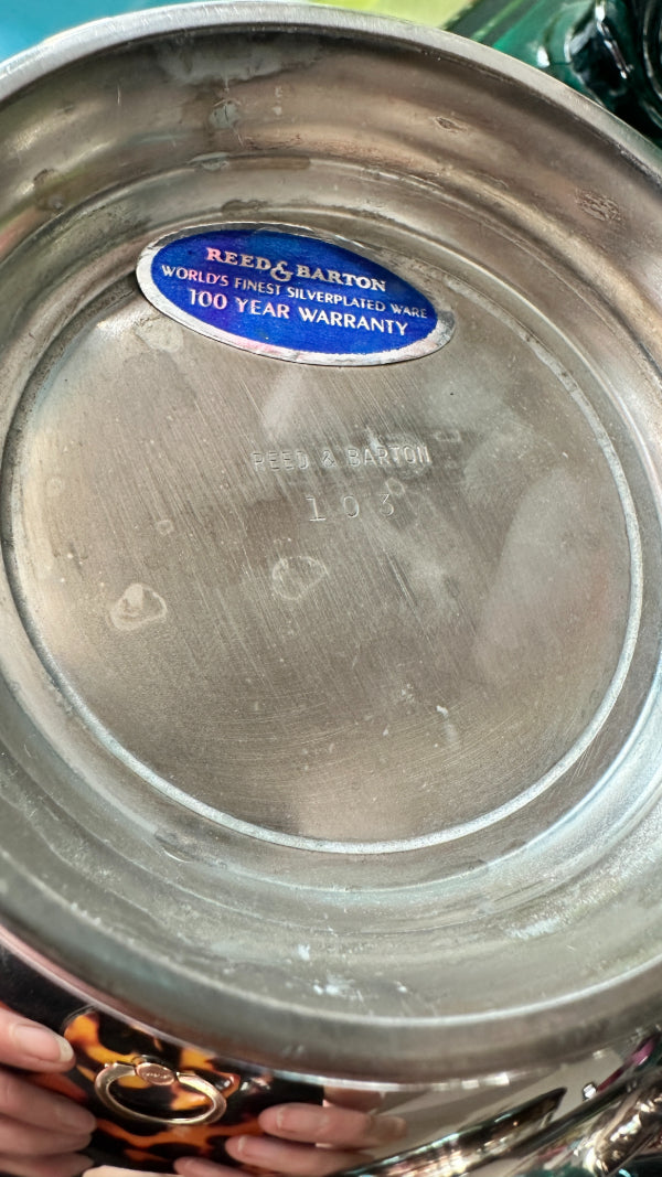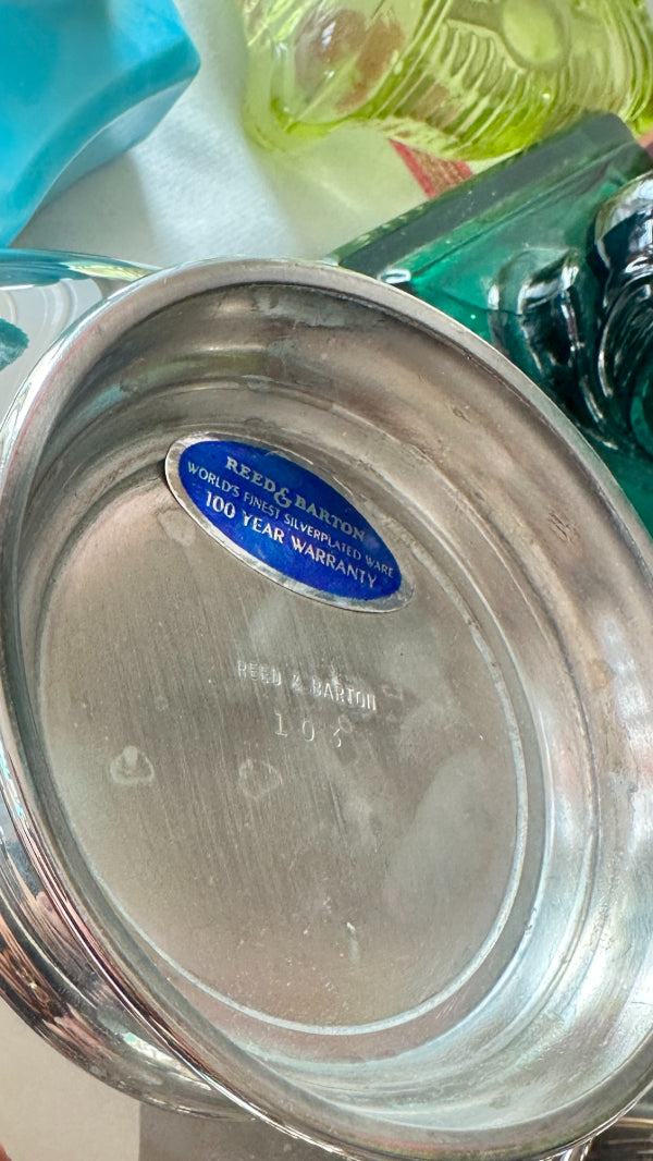This Vintage Revere Bowl with liner by Reed & Barton is crafted in classic silverplate, pattern number 103, and reflects the clean, timeless design inspired by early American forms. The bowl’s elegant silhouette is paired with a fitted liner, making it suitable for serving, display, or use as a decorative accent.