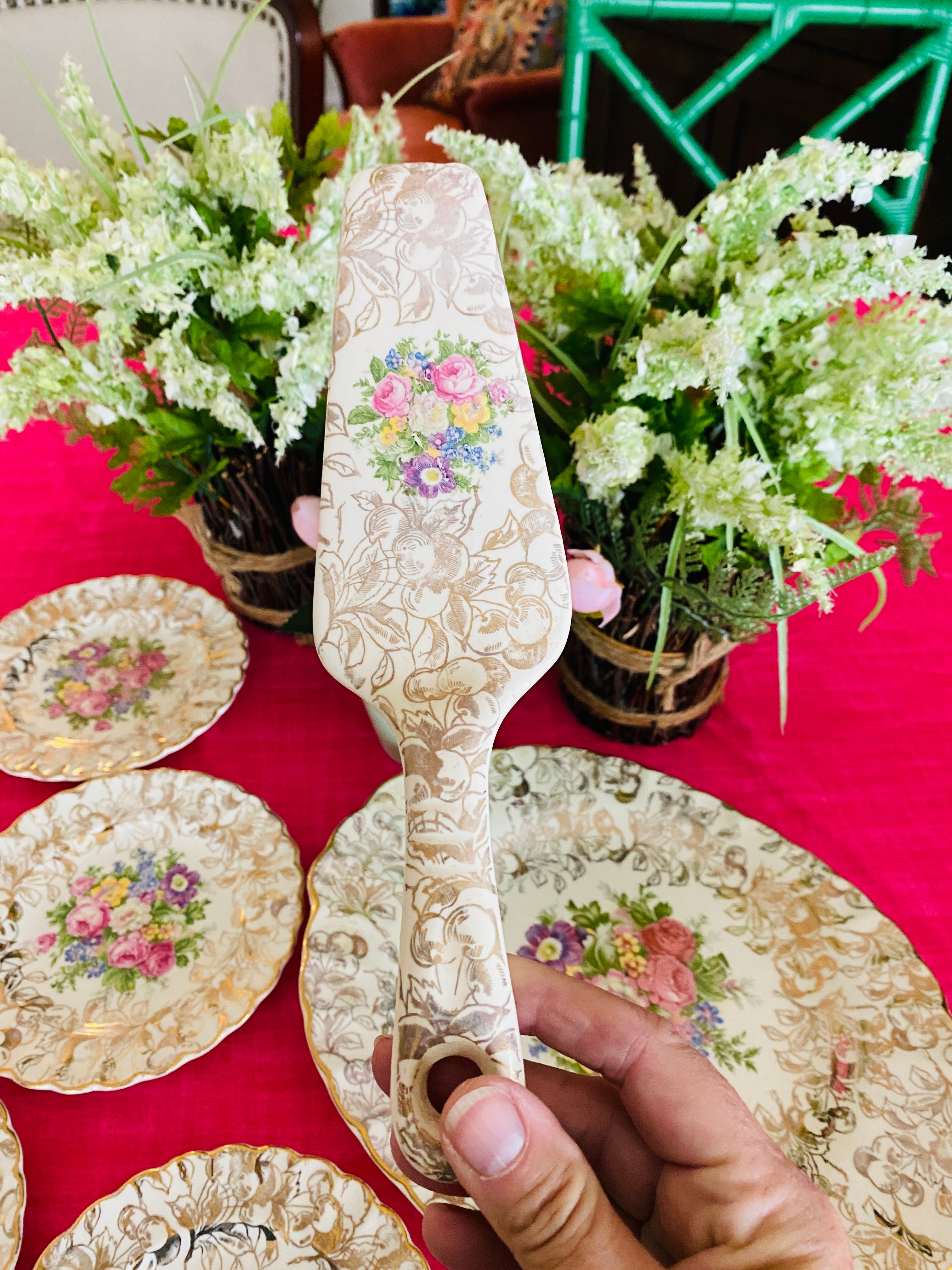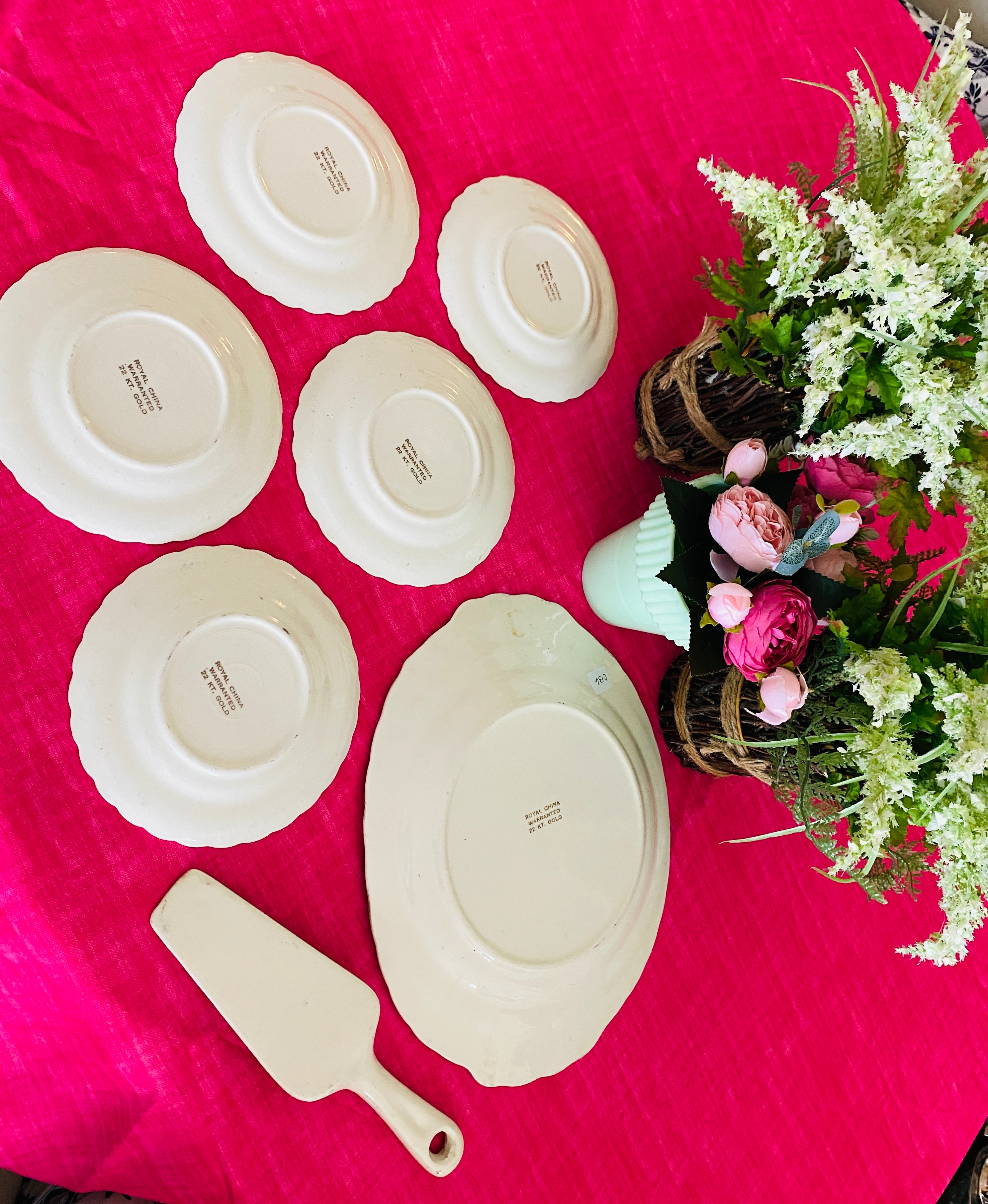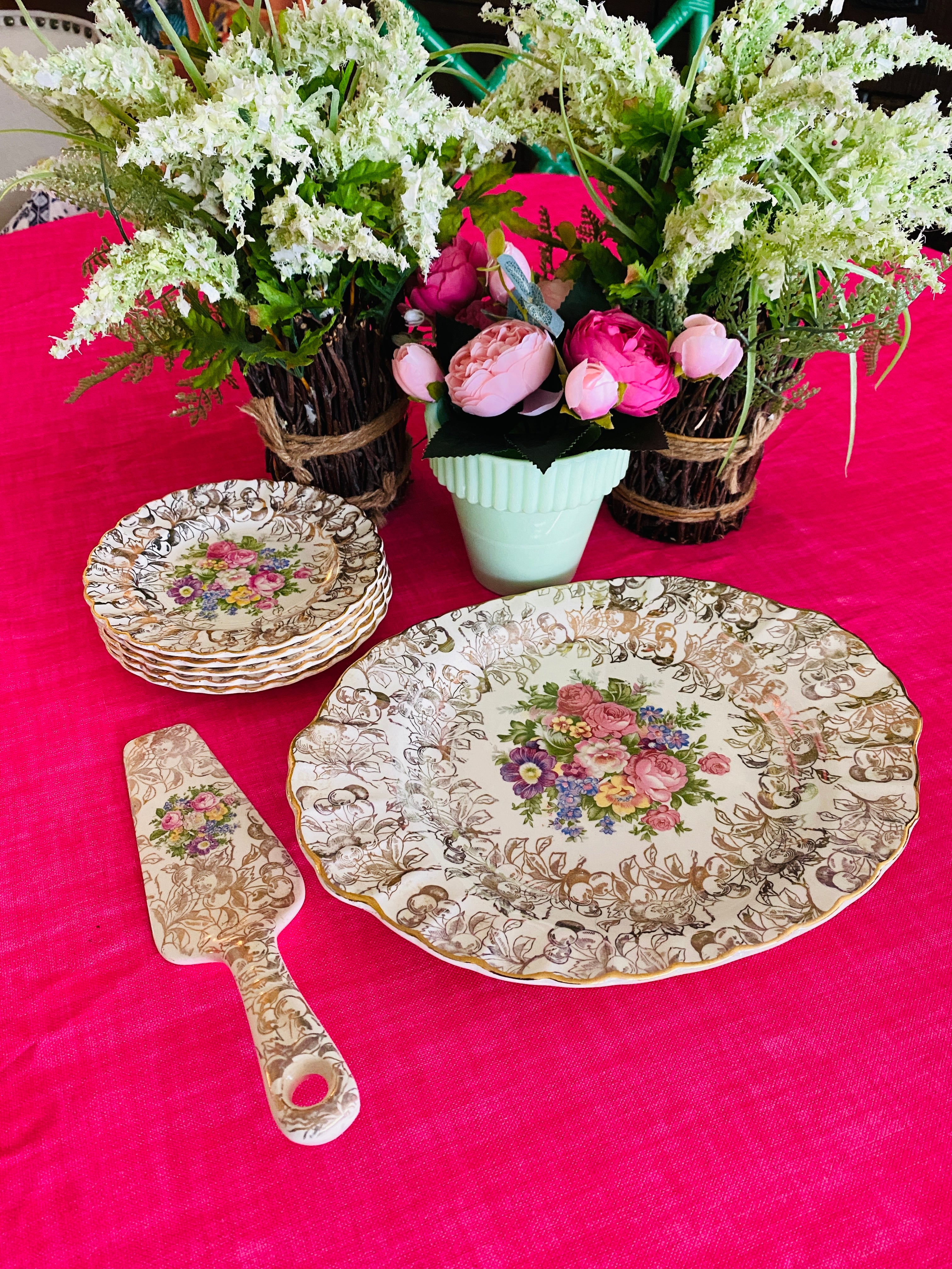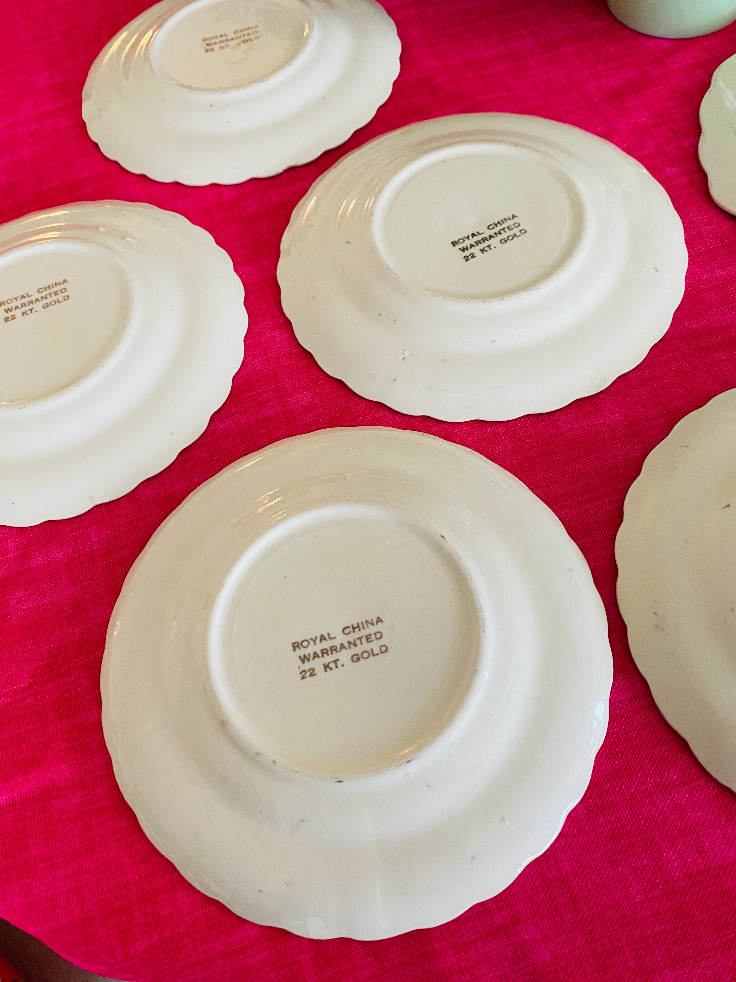 Vintage Royal China Dessert Set Platter, Pie server, 5 Dessert Plates Warranted 22KT. Gold
