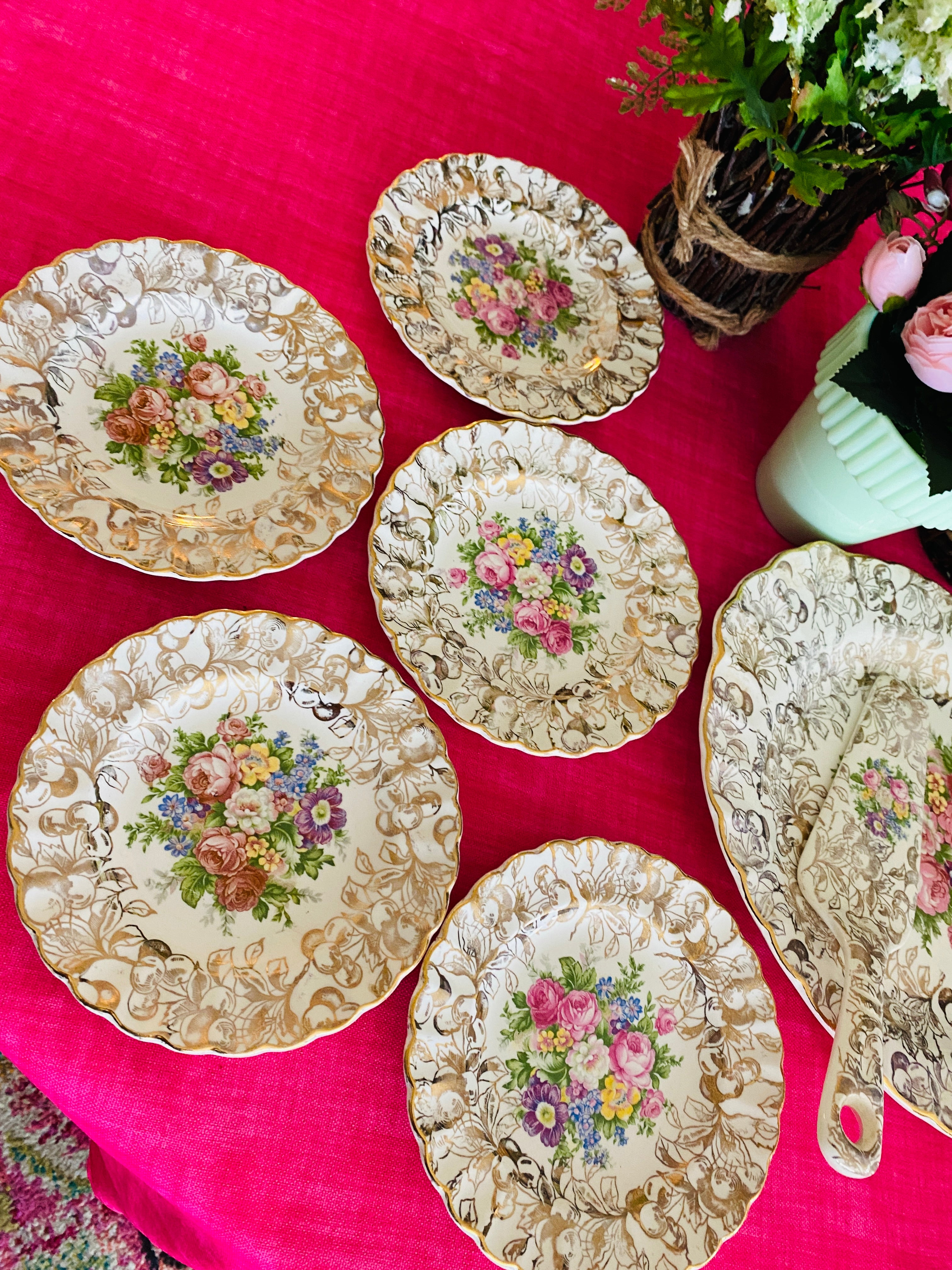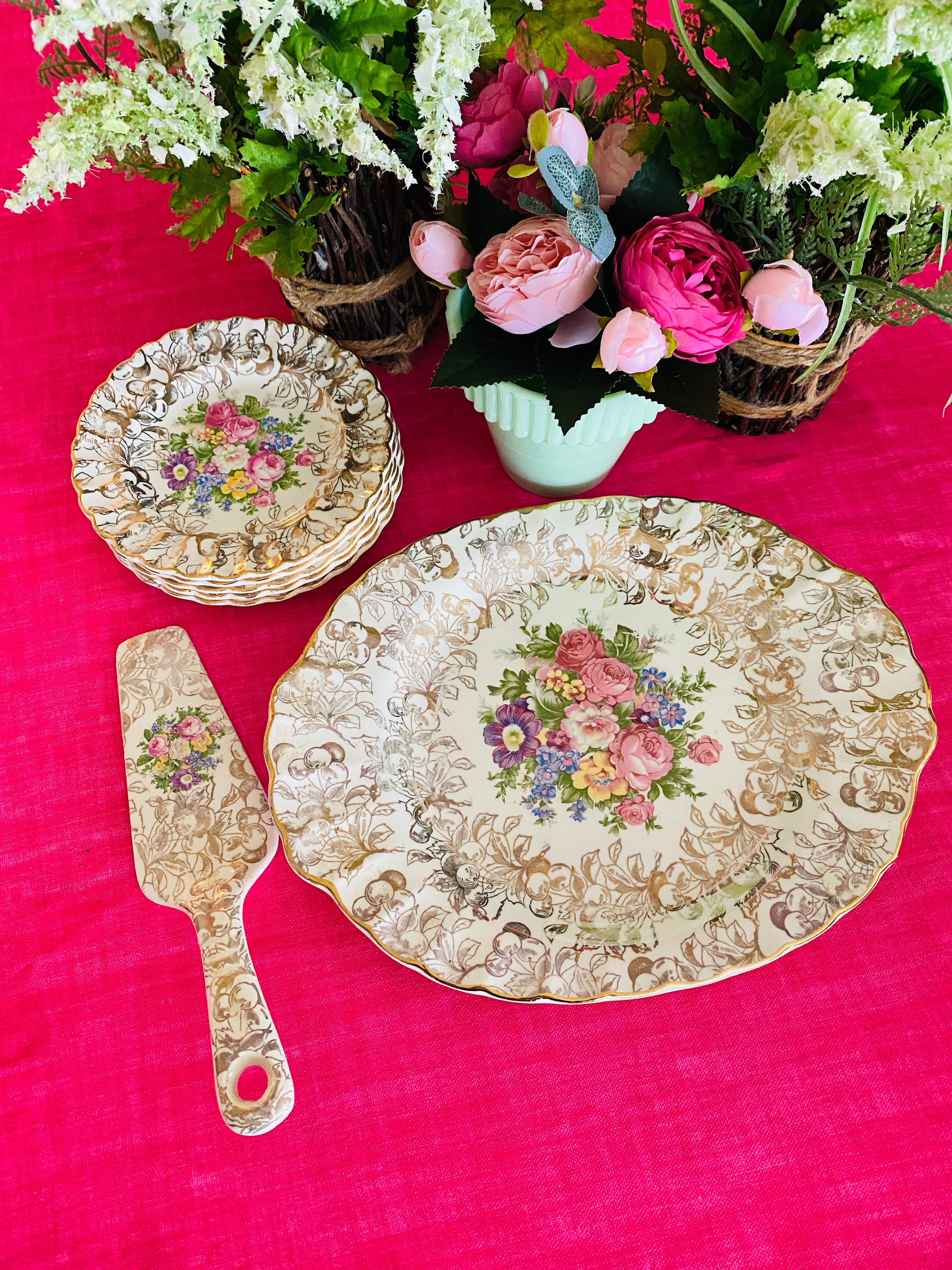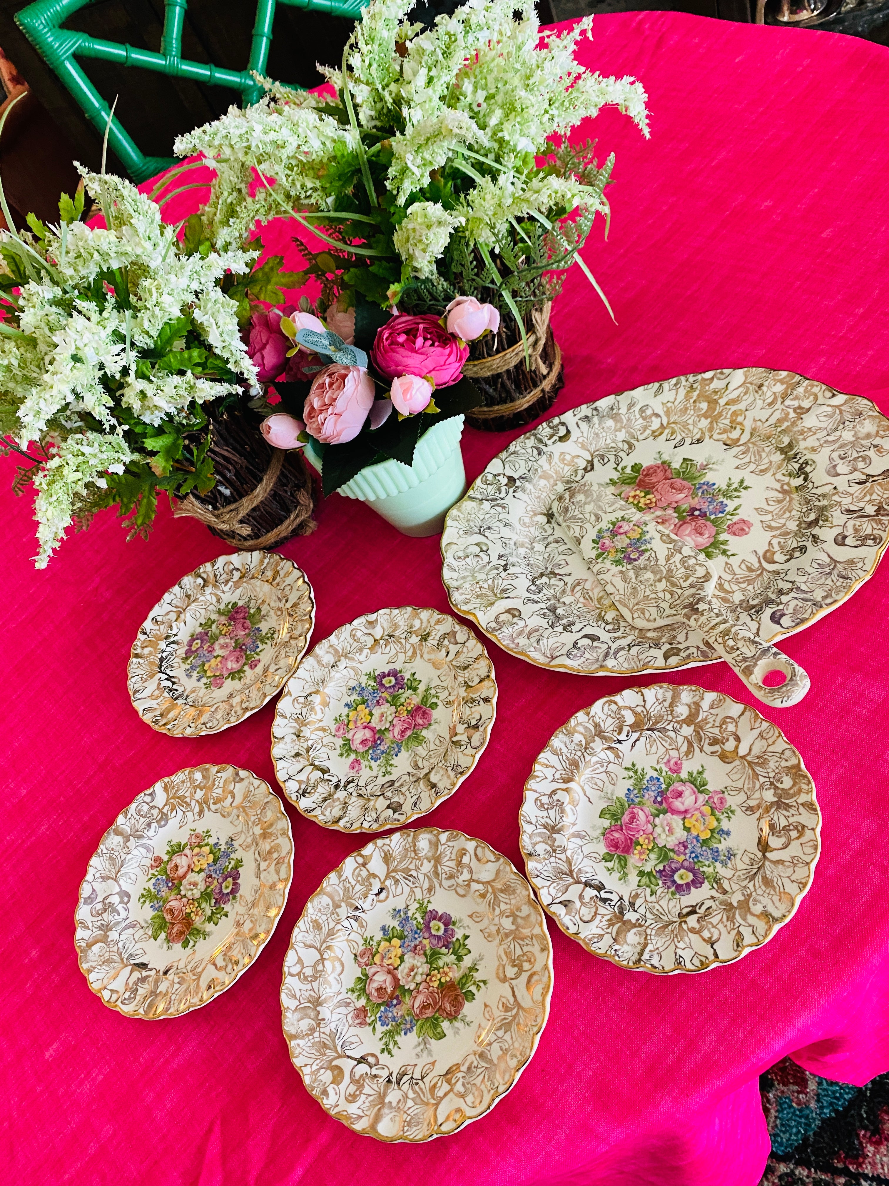 A beautiful gold cherries pattern on a cream background. Gold trim scalloped edge with colorful flowered center. This feminine set is perfect for a ladies' lunch or brunch. Hand painted, some slight paint wear typical for its' age. Otherwise great vintage condition.