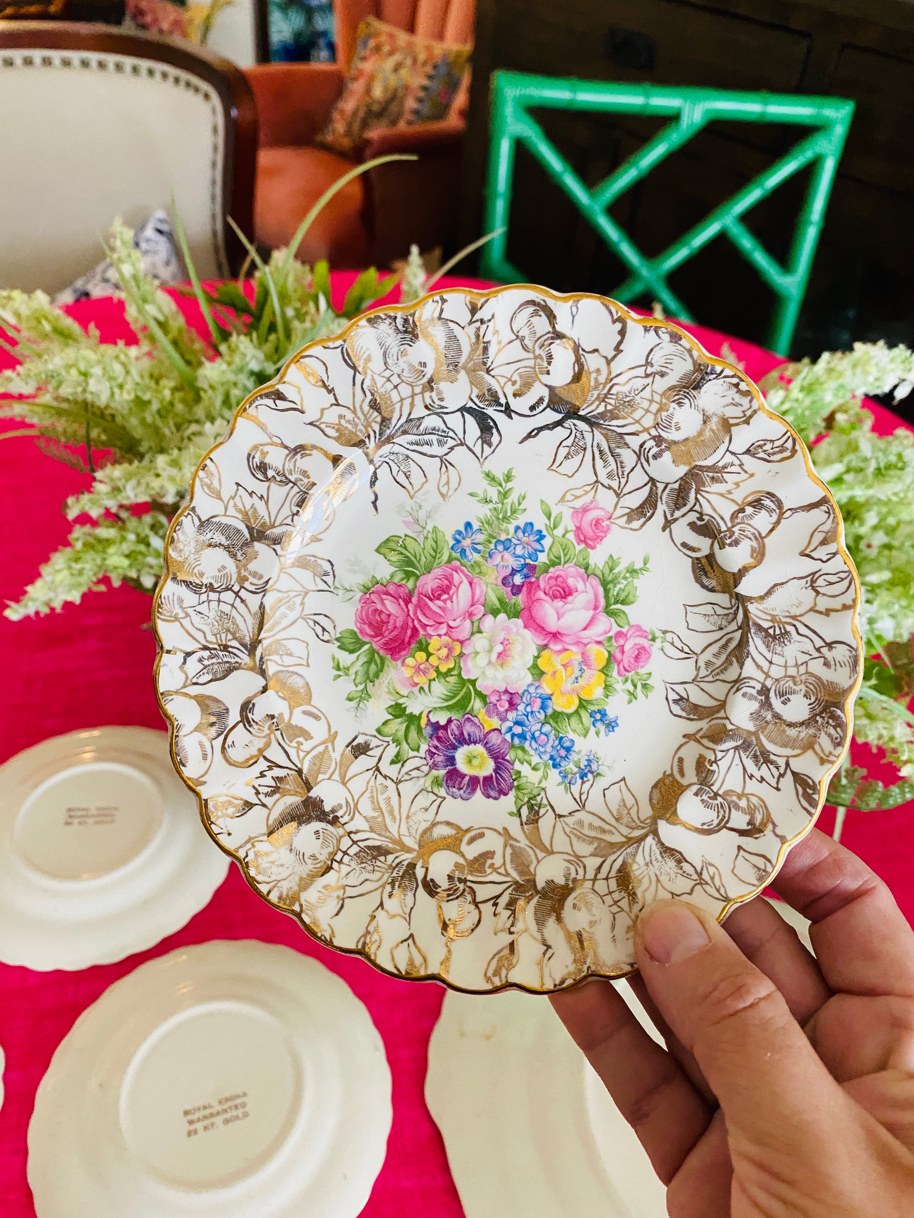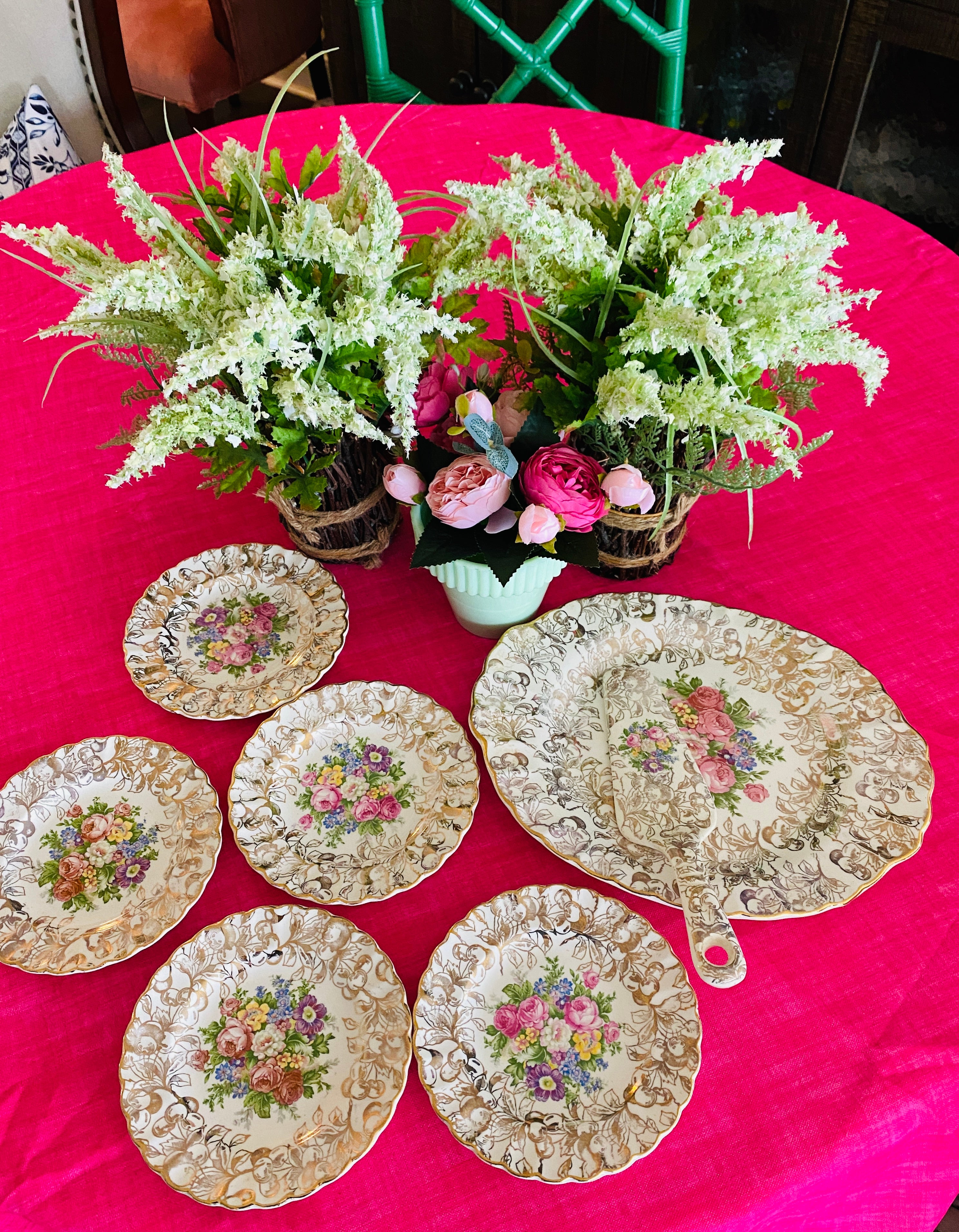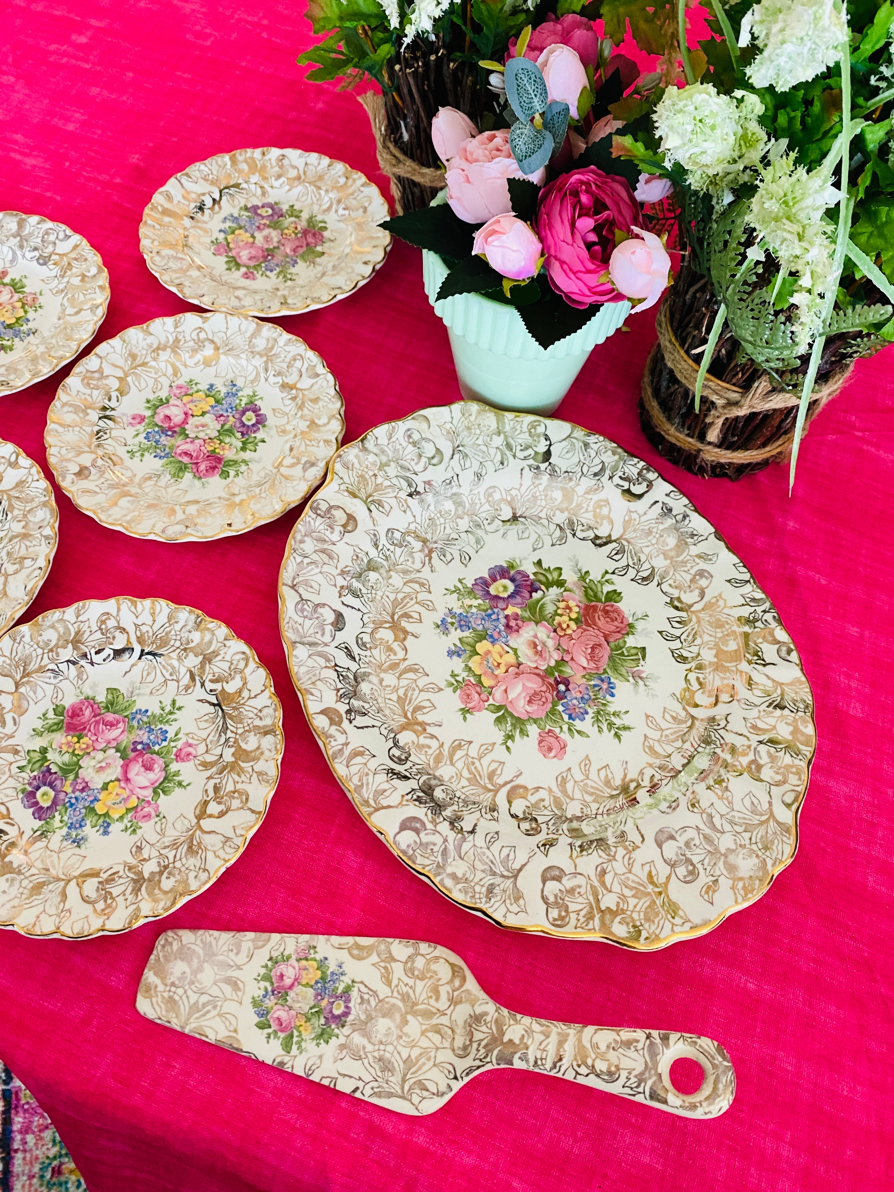 A beautiful gold cherries pattern on a cream background. Gold trim scalloped edge with colorful flowered center. This feminine set is perfect for a ladies' lunch or brunch. Hand painted, some slight paint wear typical for its' age. Otherwise great vintage condition.