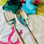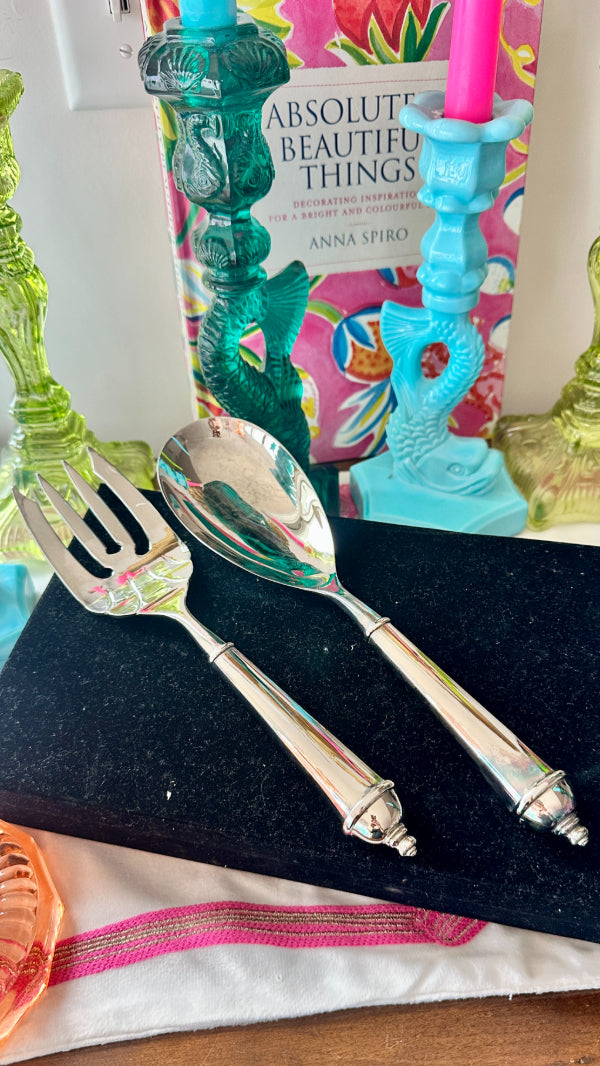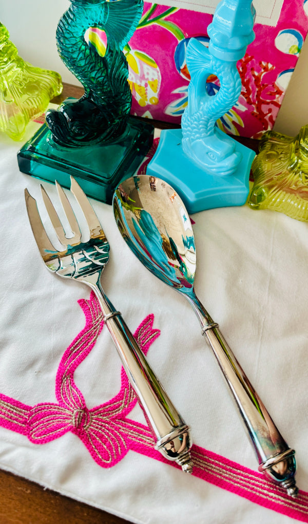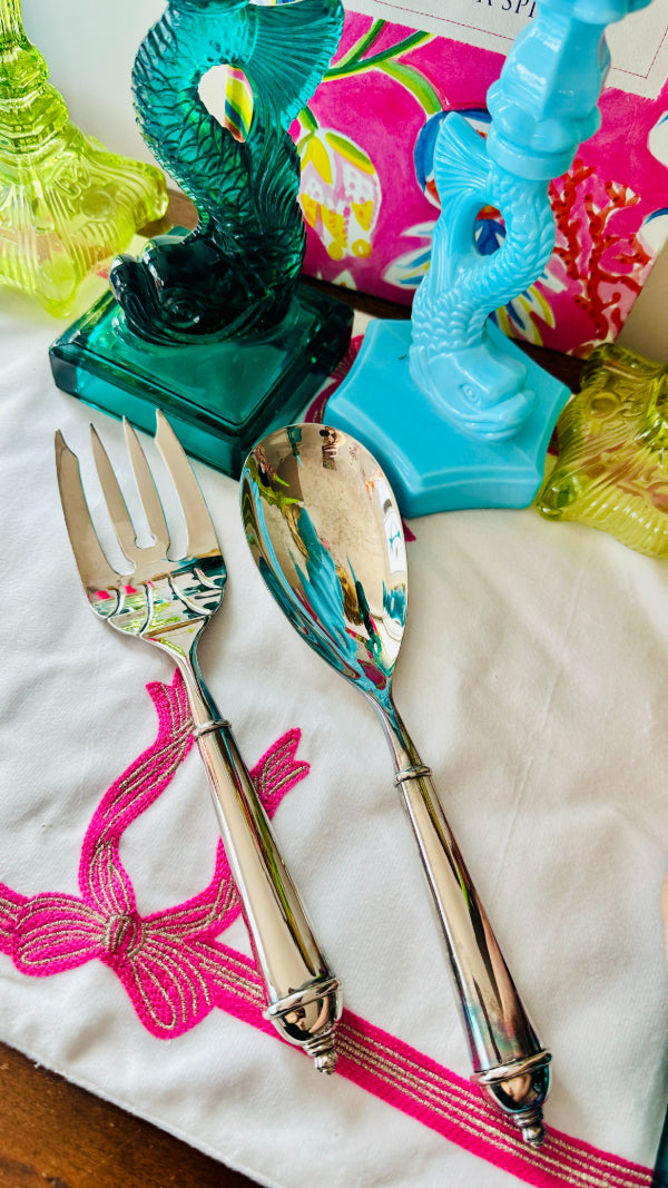 This Vintage Salad Serving Set by Towle features the elegant Copenhagen pattern, a timeless design known for its clean lines and classic appeal. Crafted in silverplate, the set includes a matching fork and spoon with beautifully balanced proportions and refined detailing typical of Towle craftsmanship.