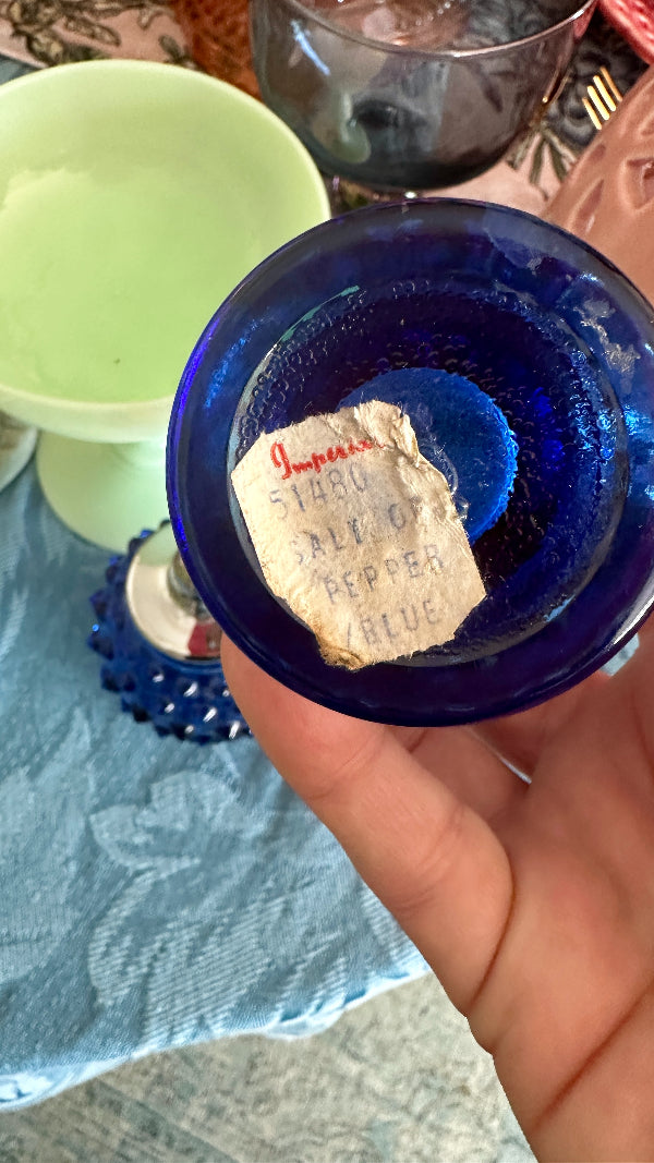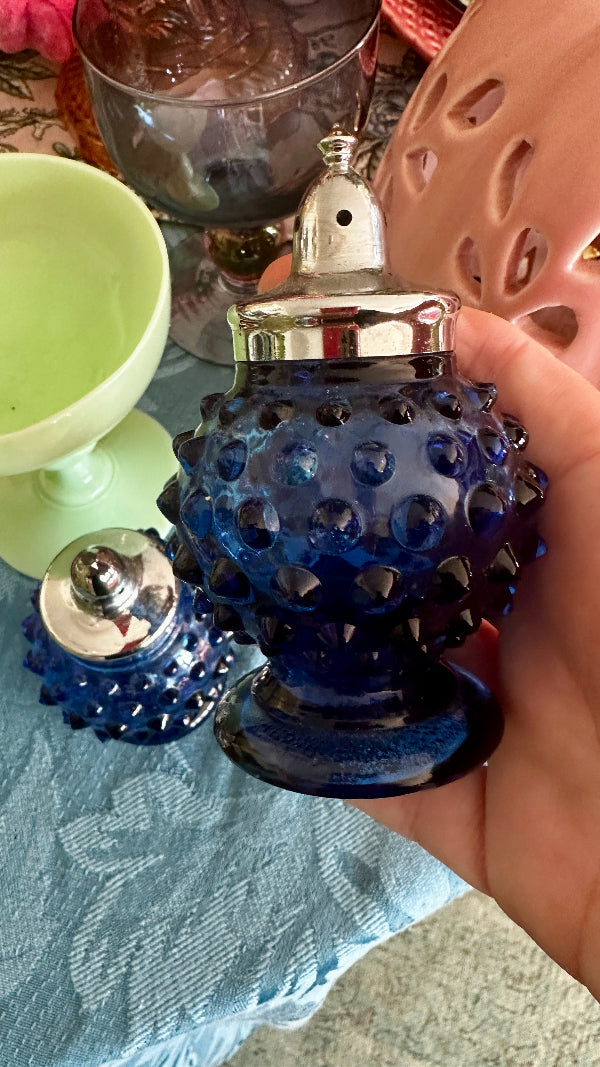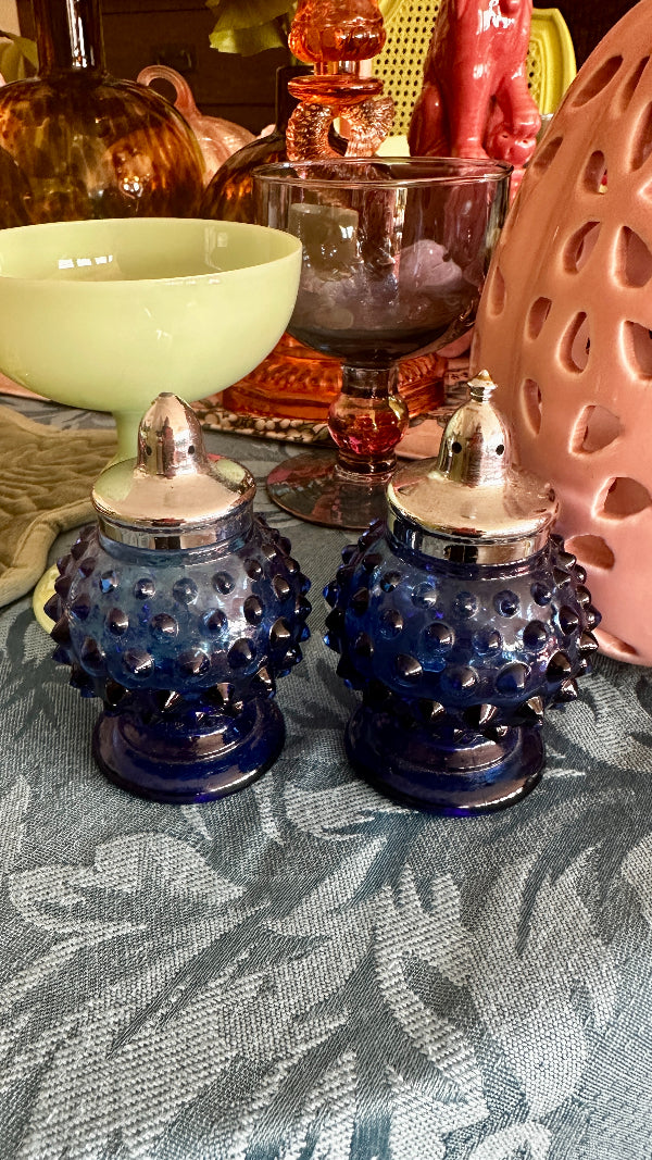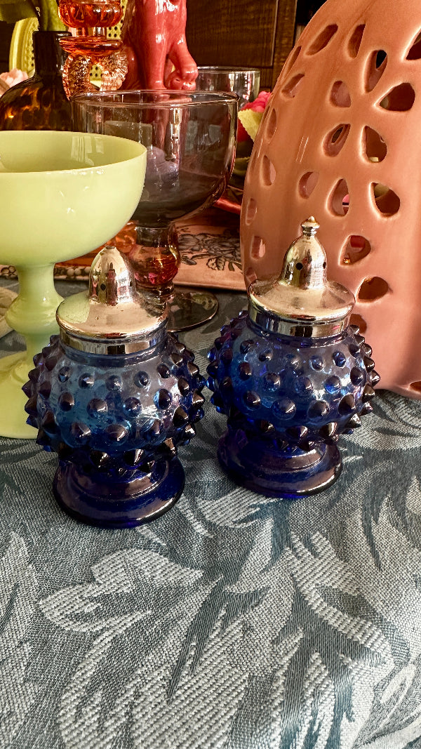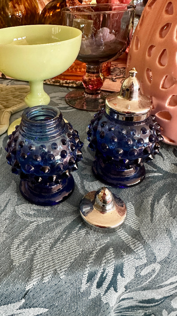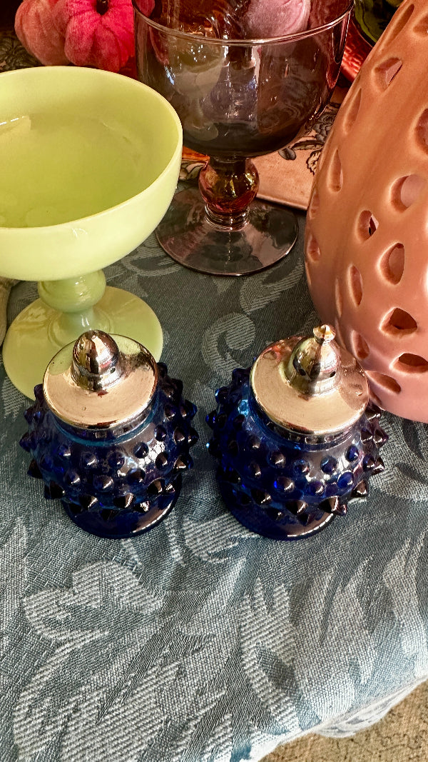 Add a touch of vintage charm to your table with these Vintage Hobnail Salt and Pepper Shakers. Featuring a classic hobnail design, these shakers bring elegance and nostalgia to any meal. Each has a shiny silver tone top that screw on and off. The deep blue glass color adds a richness to your table. These Vintage Hobnail Salt and Pepper Shakers are both functional and decorative, perfect for enhancing your dining experience.