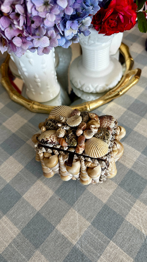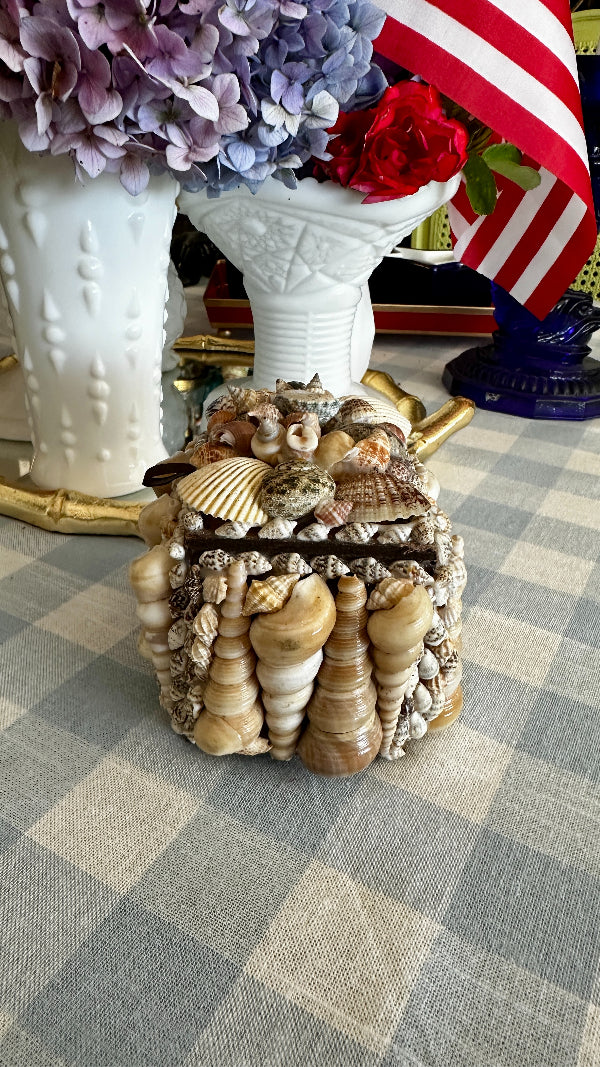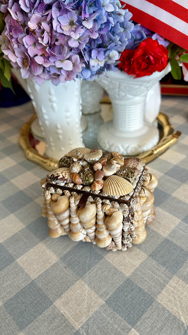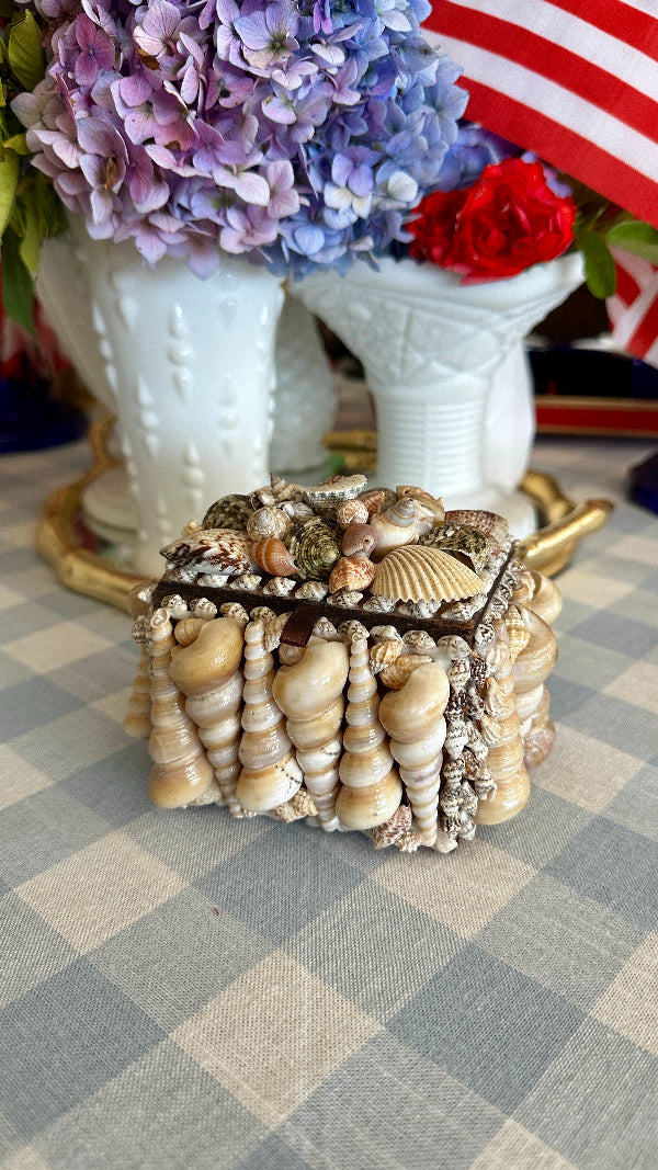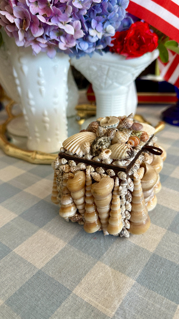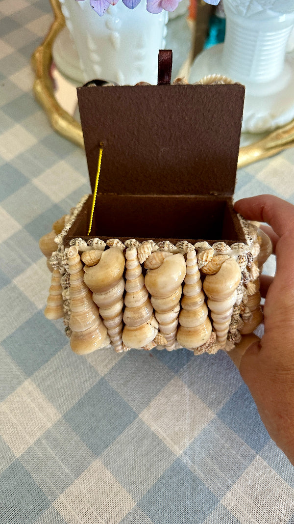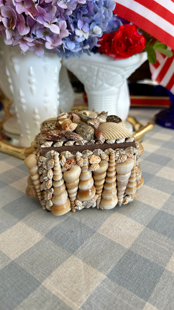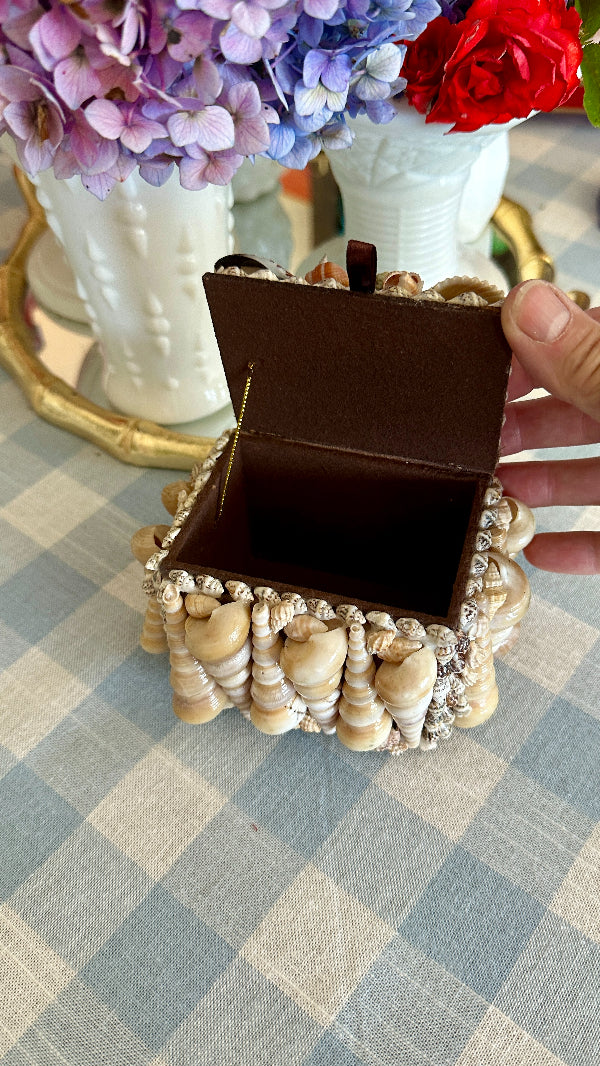 Store your treasures in style with this vintage seashell box featuring a brown felt liner and hinged lid. Crafted with meticulous detail, this charming box not only offers practical storage but also adds a coastal touch to your decor. Perfect for collectors and beach enthusiasts, it makes a delightful addition to any shelf, dresser, or tabletop. Keep your small valuables safe while showcasing seaside charm with this unique vintage piece.
