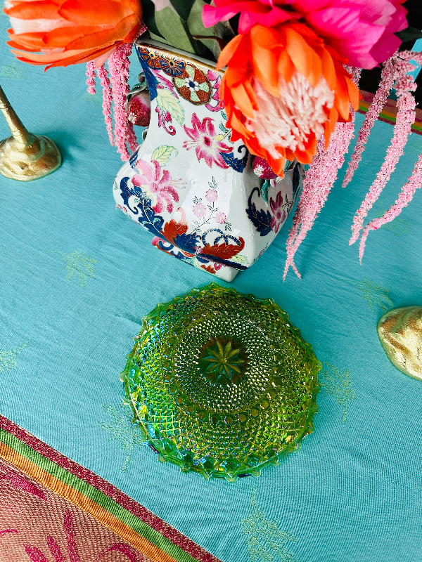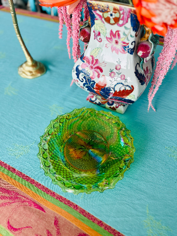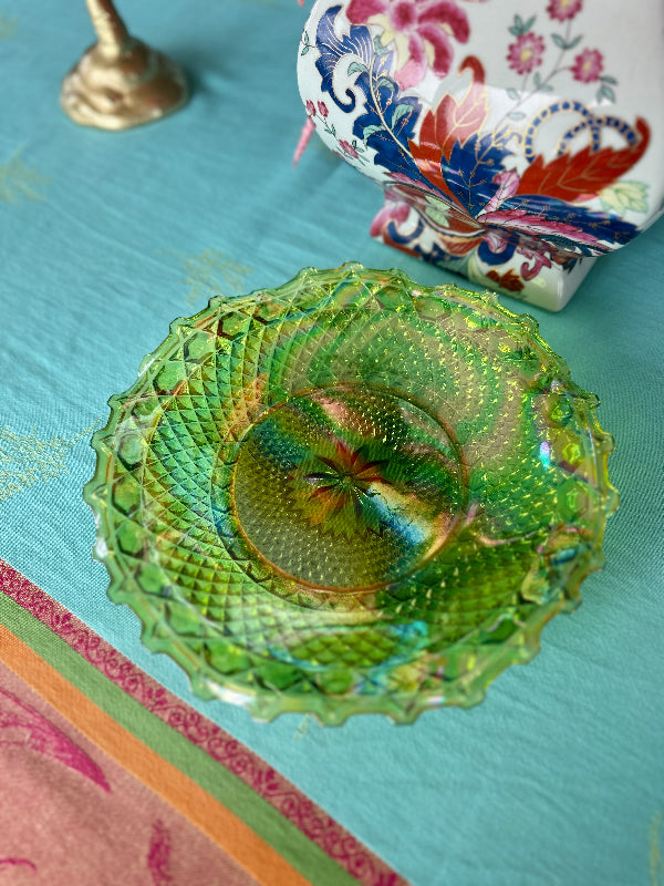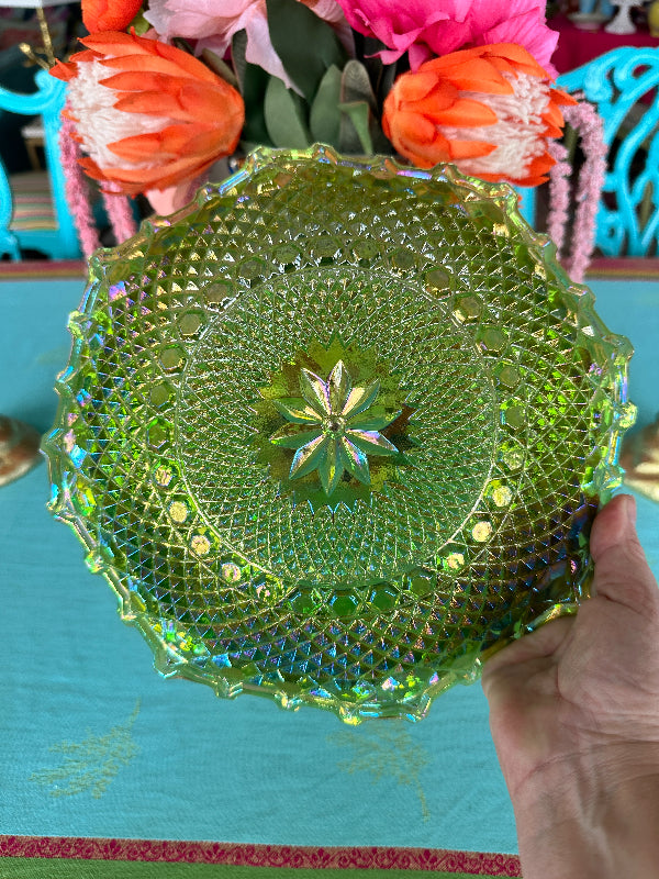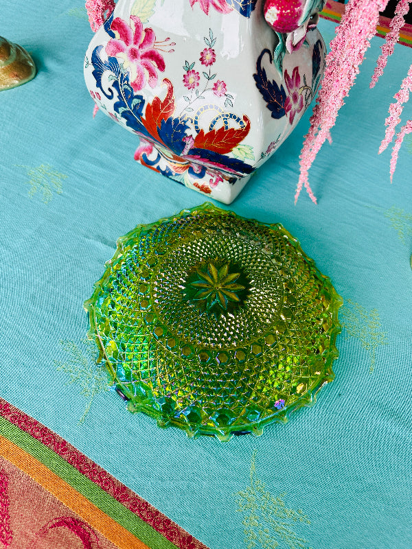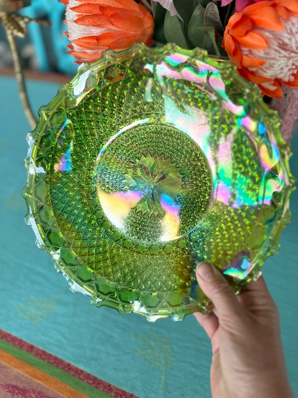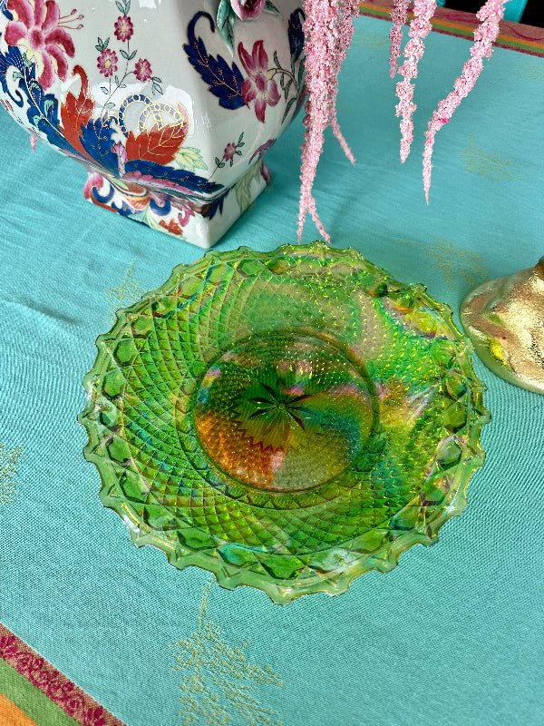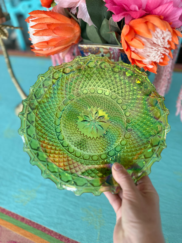 Vintage Shallow Bowl/ Plate, Green Carnival Glass, Detailed Cutwork