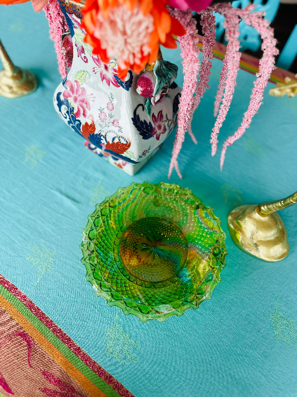 This iridescent green cut glass plate is in pristine condition. You can see the glow and it's even more beautiful in person. Great to add to a collection or to display. Makes a great serving piece. Add fillers like ornaments or Easter eggs for a holiday table centerpiece.