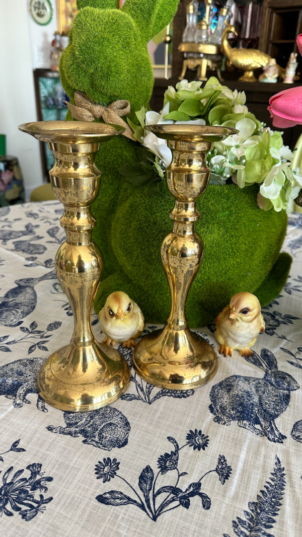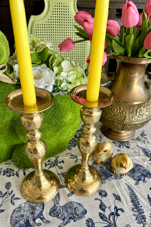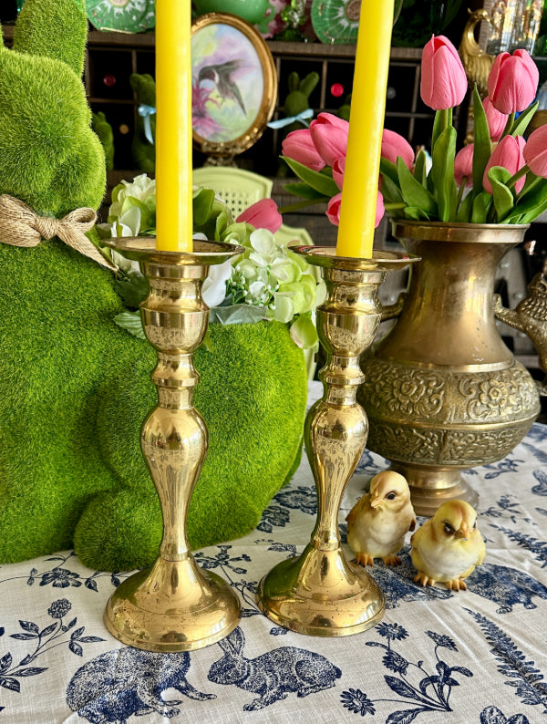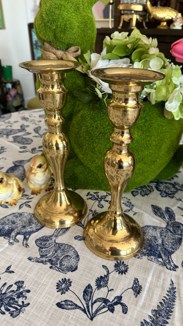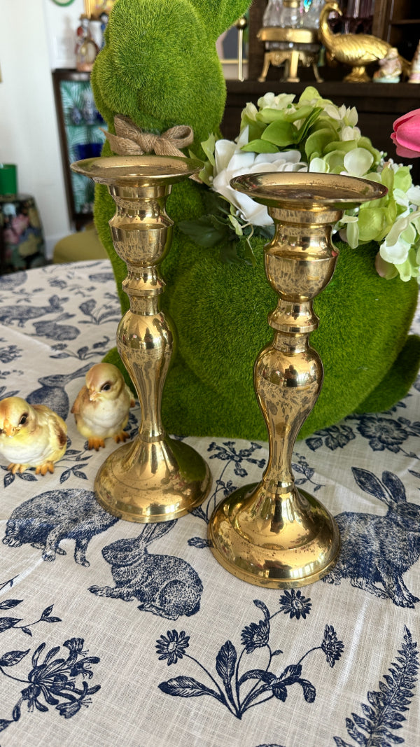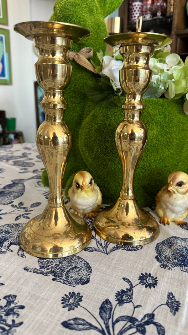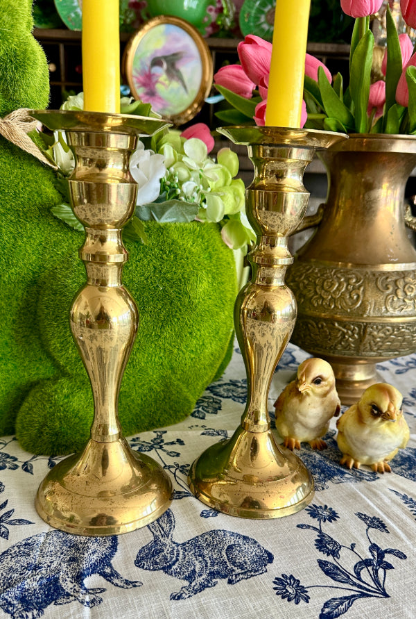 This pair of vintage shiny brass candlesticks from India brings a touch of elegance and timeless beauty to any space. Crafted with exquisite detail, these large candlesticks feature a gleaming brass finish that adds sophistication to your table, mantel, or hallway. Perfect for creating a warm, inviting atmosphere, they are ideal for both formal and casual settings. Whether you're a collector of fine décor or simply looking to enhance your home with a classic touch, these vintage candlesticks offer both style and functionality in one stunning pair.