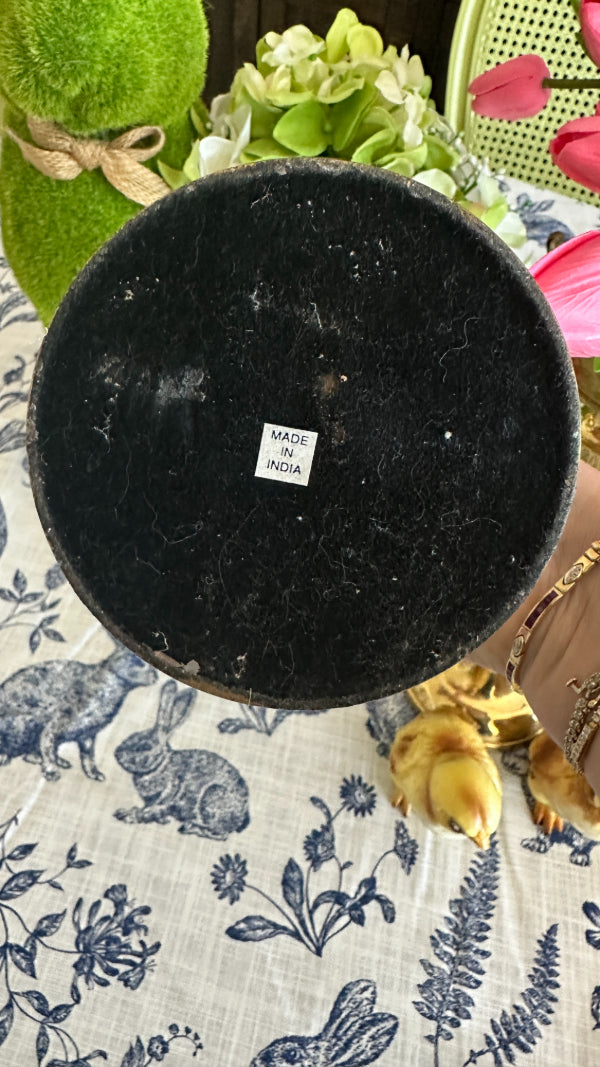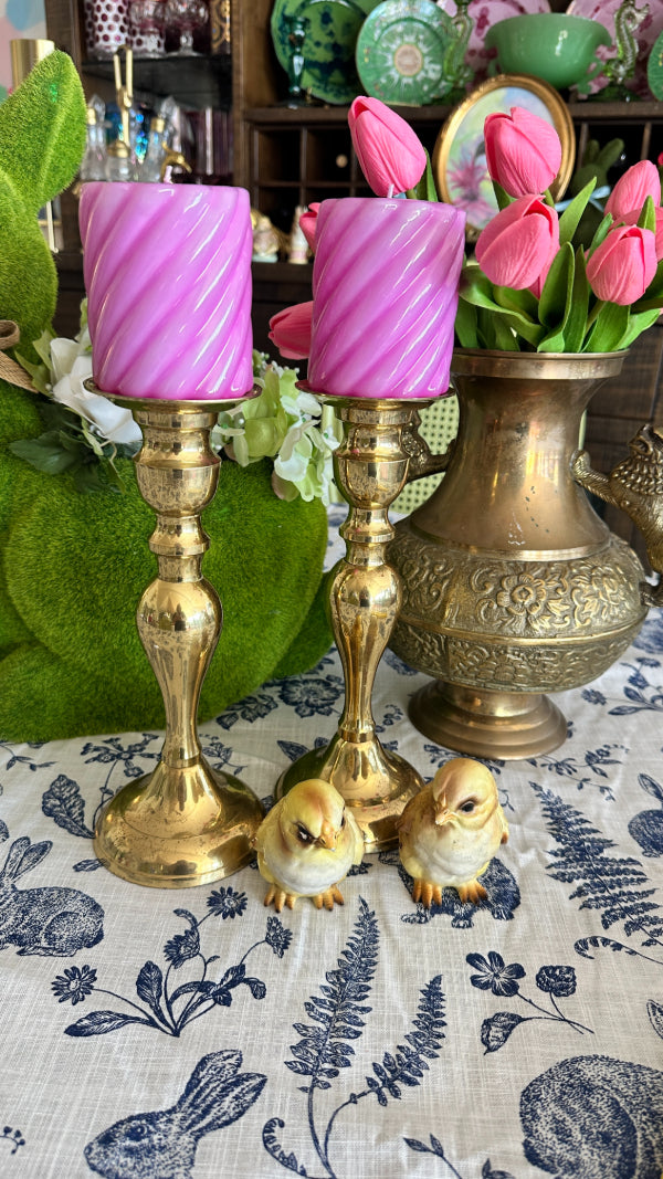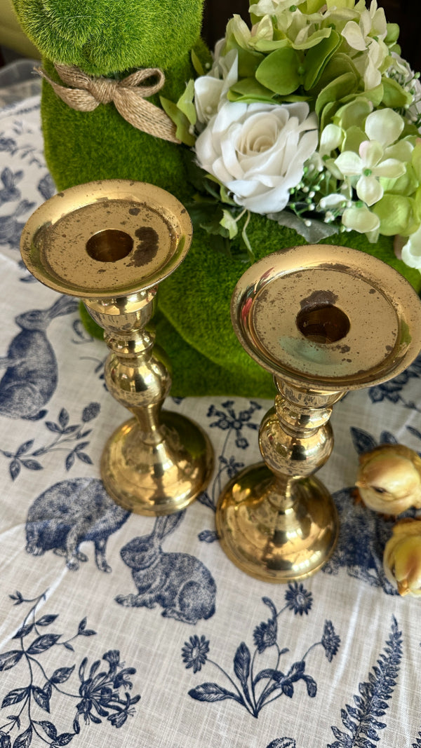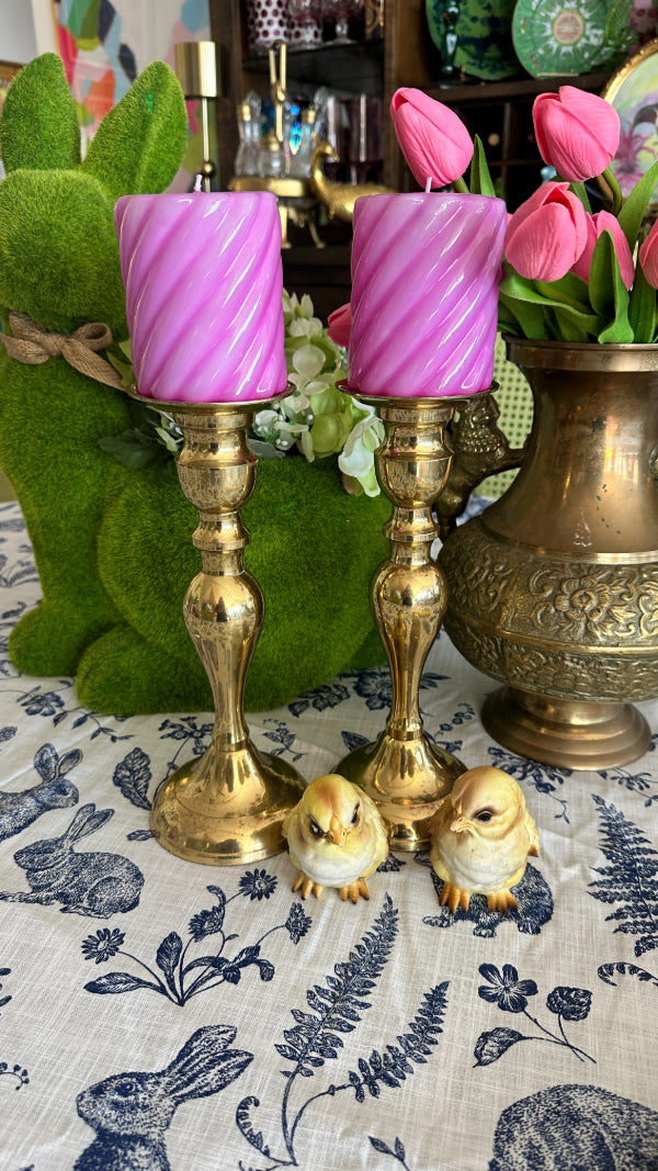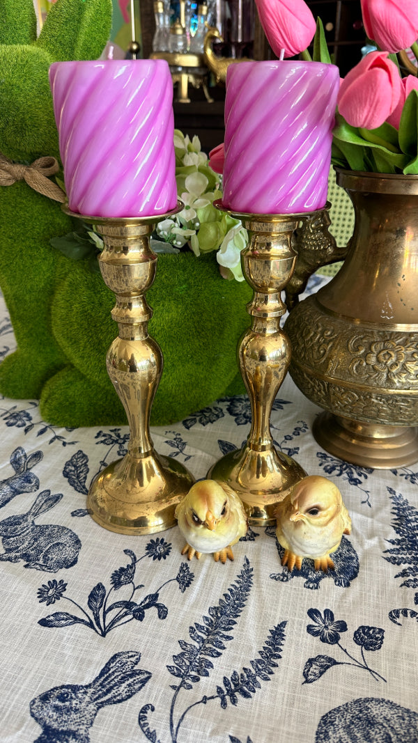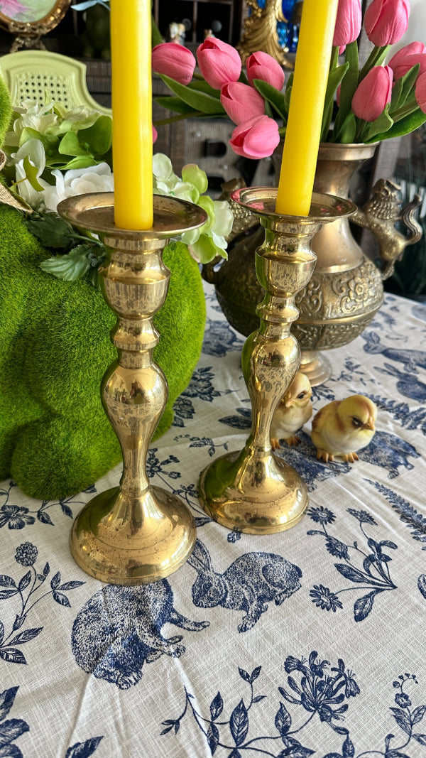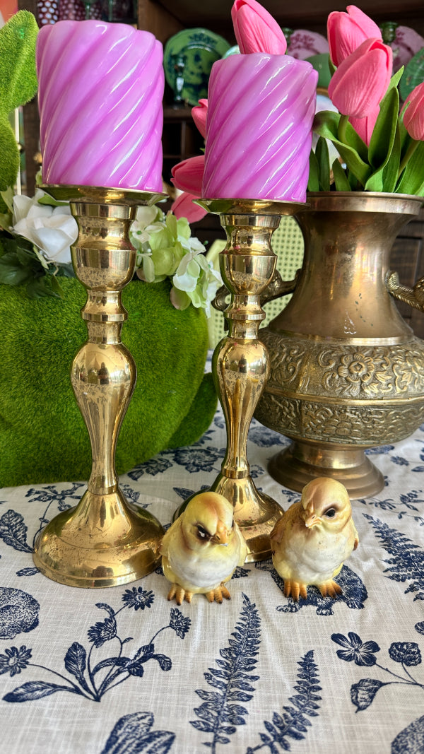 This pair of vintage shiny brass candlesticks from India brings a touch of elegance and timeless beauty to any space. Crafted with exquisite detail, these large candlesticks feature a gleaming brass finish that adds sophistication to your table, mantel, or hallway. Perfect for creating a warm, inviting atmosphere, they are ideal for both formal and casual settings. Whether you're a collector of fine décor or simply looking to enhance your home with a classic touch, these vintage candlesticks offer both style and functionality in one stunning pair.