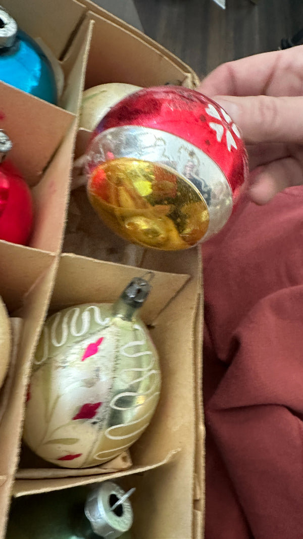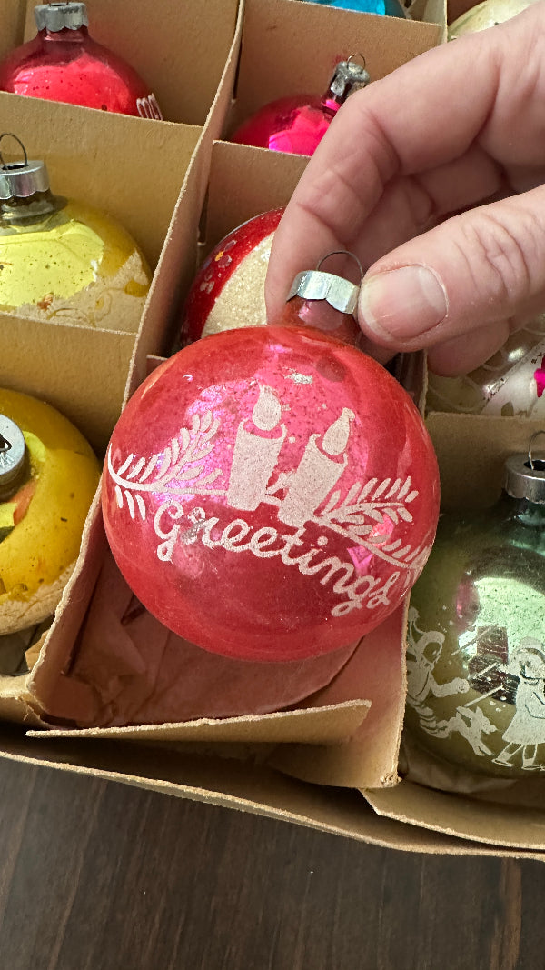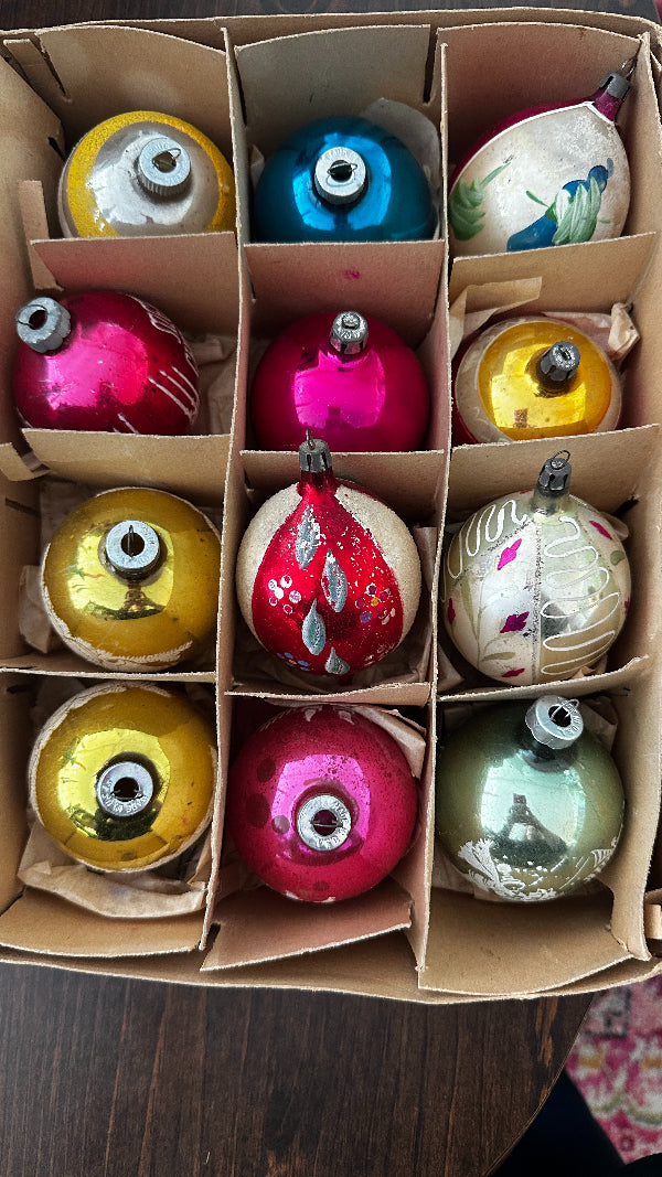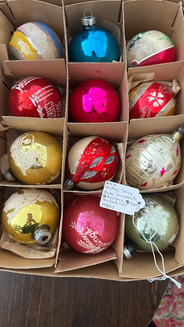 Vintage Shiny Brite Ornaments, Set of 12, Floral, Seasons Greetings, Bells, Striped, 3 Teardrop, 9 Round, Mixed Lot