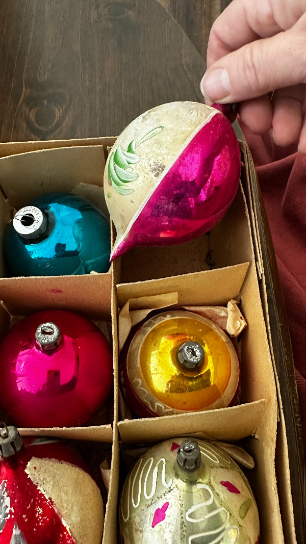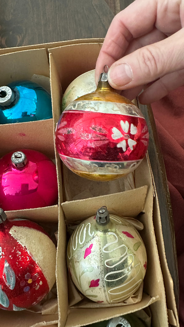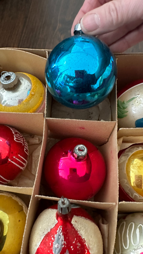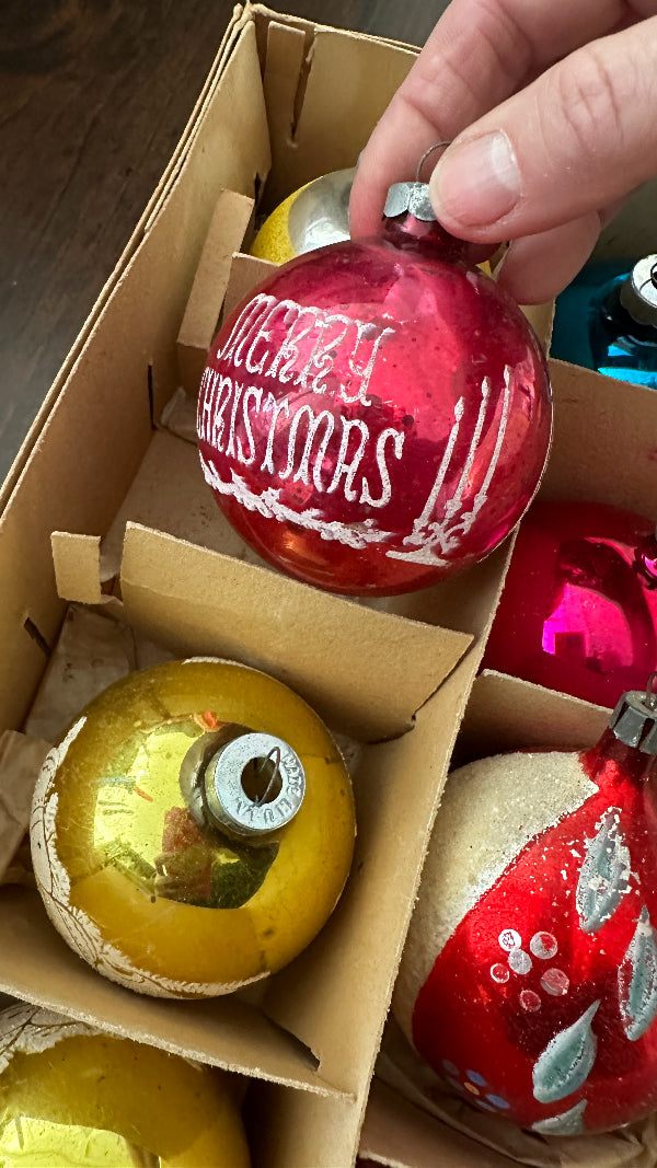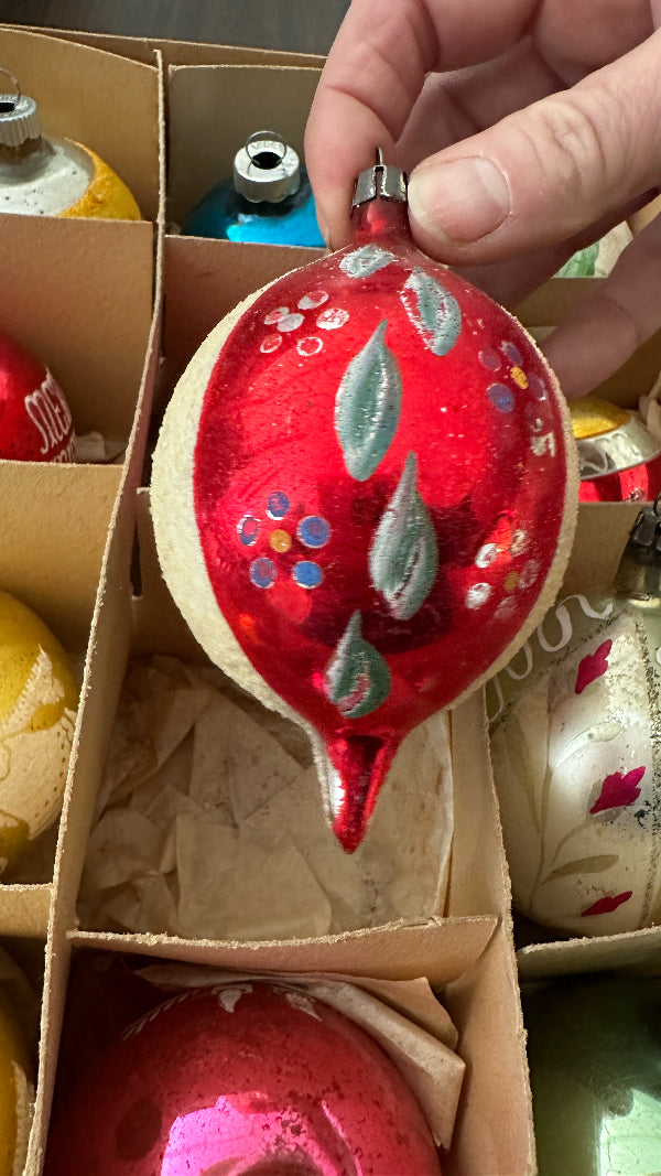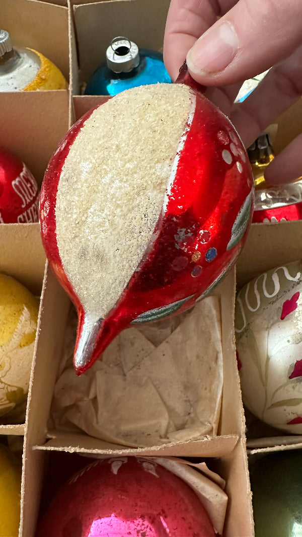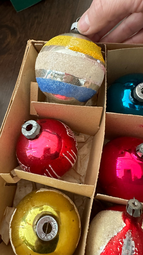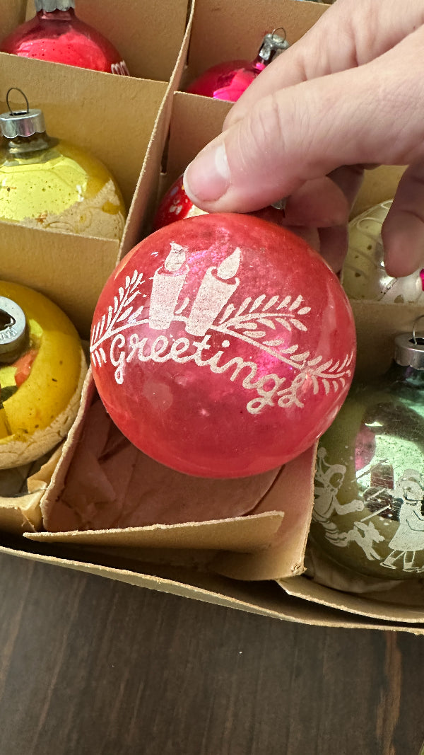 Celebrate the holidays in classic style with our Vintage Shiny Brite Ornaments Set of 12. This charming collection features a delightful mix of Floral, Seasons Greetings, Bells, Striped, and 3 Teardrop designs, alongside 9 Round ornaments, creating a versatile and festive ensemble. Some Shiny Brite and Some Vintage from Poland.