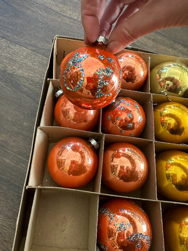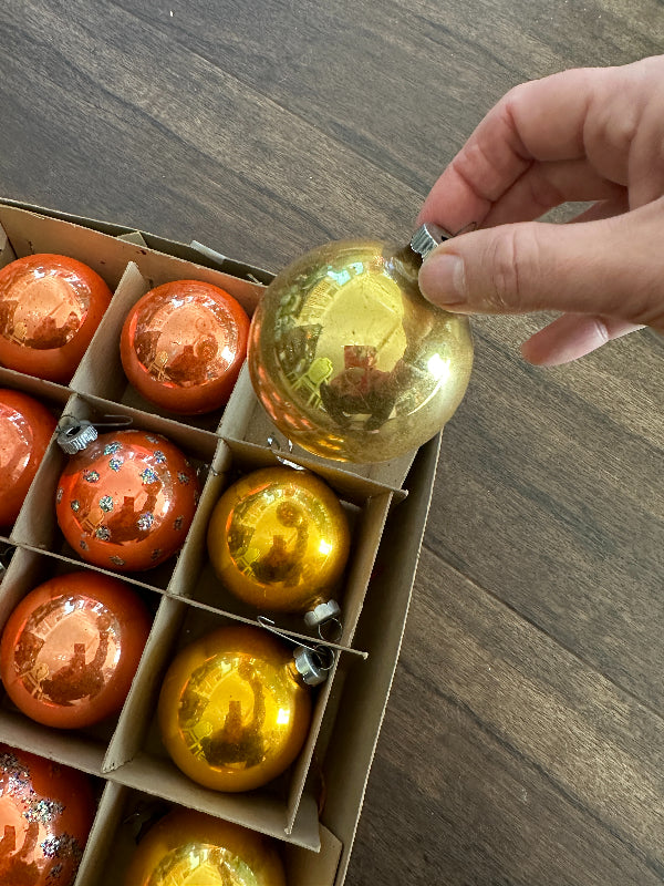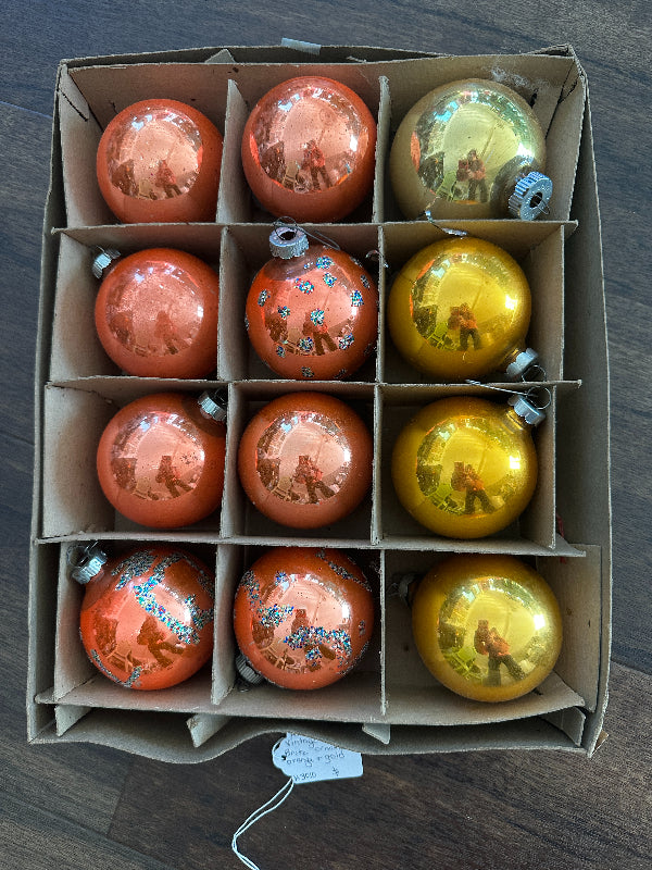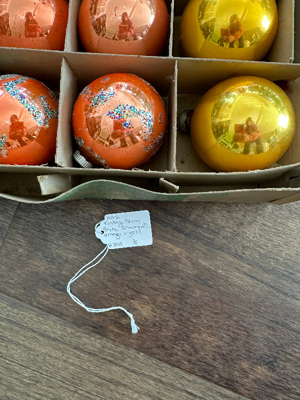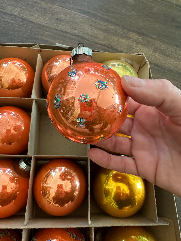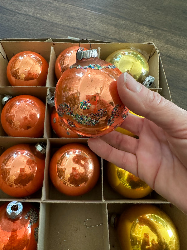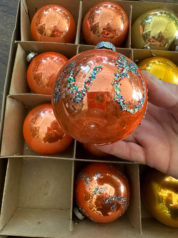 Vintage Shiny Brite Ornaments Set of 12 - a captivating Mixed Lot featuring 4 Gold and 8 Orange ornaments, with a sparkling twist as 3 are adorned with glitter that seem to be added by a child. Unbox the magic and let the golden glow and shimmering accents create a festive ambiance that captures the essence of the season. Orange Shiny Brites are a very RARE FIND.