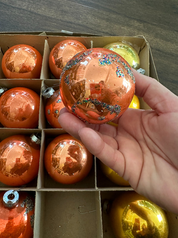 Vintage Shiny Brite Ornaments, Set of 12, Mixed Lot, 4 Gold, 8 Orange - 3 with Glitter