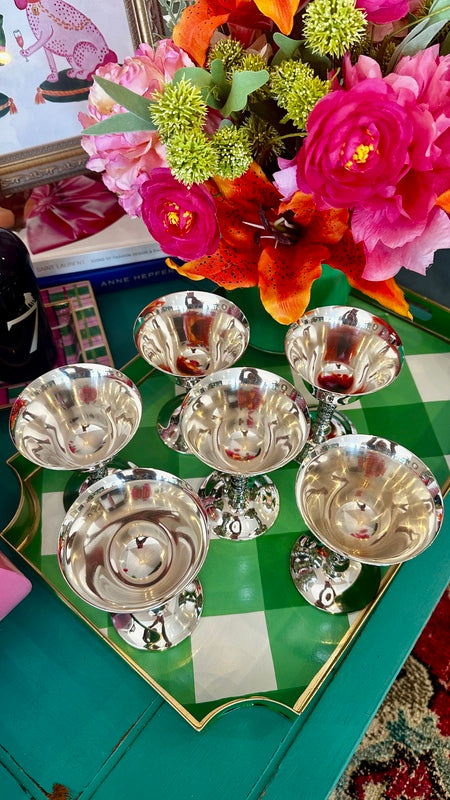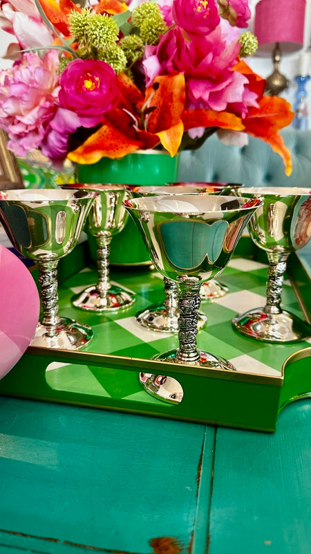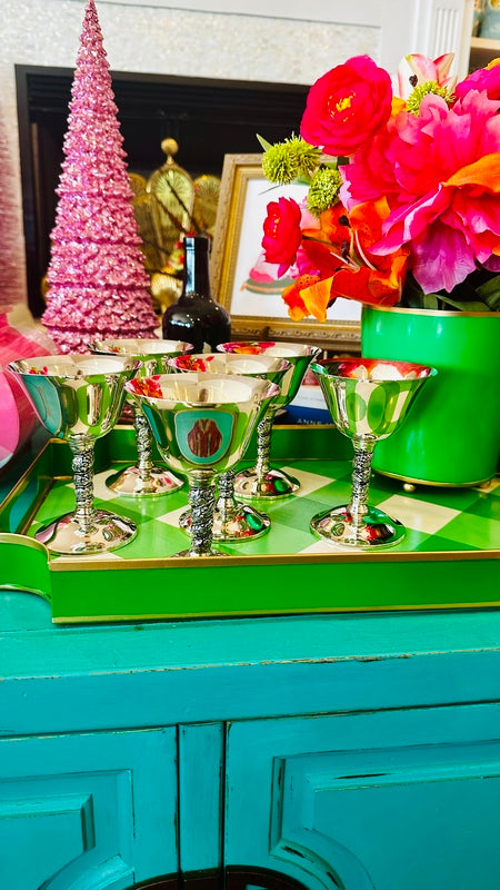 Enhance your wine collection with this set of 6 Vintage Silver Plate Wine Glasses from Spain. Featuring a beautifully detailed grapevine stem, these elegant glasses bring a touch of rustic charm and timeless sophistication to any occasion.