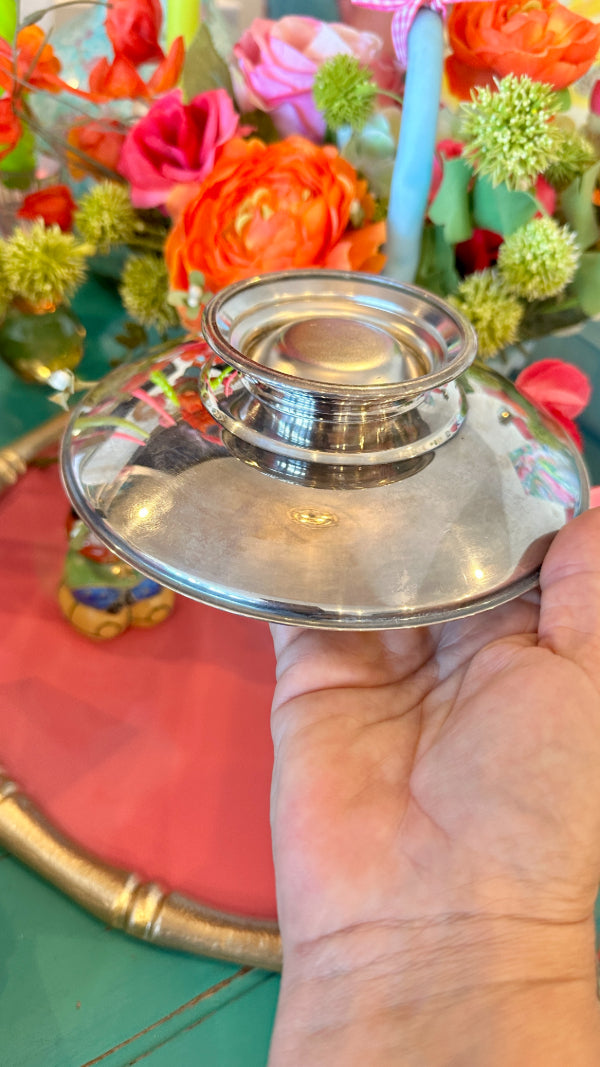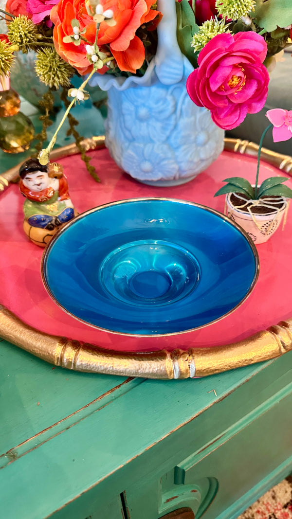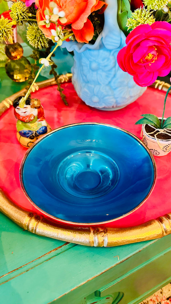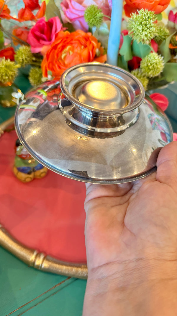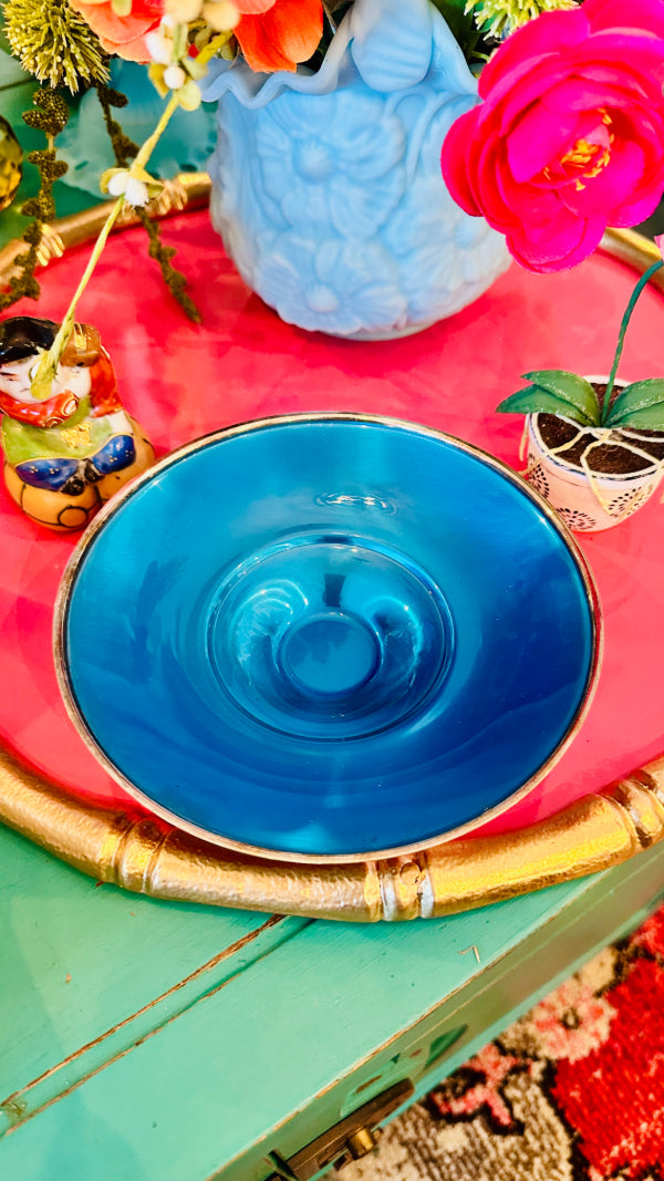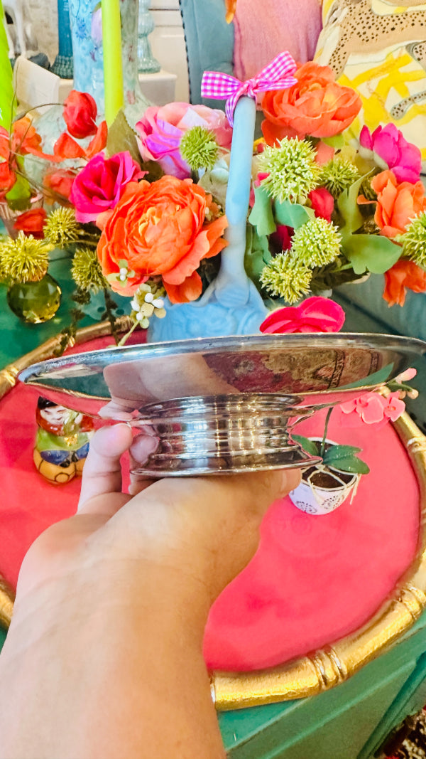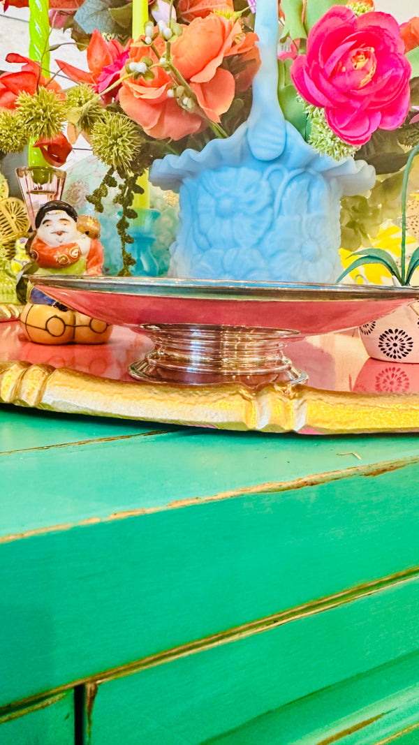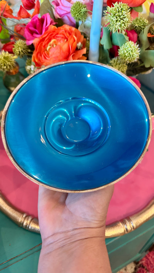 Add a touch of timeless elegance to your home with this vintage silverplate and blue enamel bowl from Oneida. Featuring a gleaming silver exterior and a striking cobalt blue enamel interior, this bowl offers a beautiful contrast that catches the eye. Its classic shape and refined craftsmanship make it perfect for serving, displaying, or simply admiring. Whether used as a centerpiece or a stylish accent, this piece brings both charm and sophistication to any space. One small scratched imperfection on the inside.
