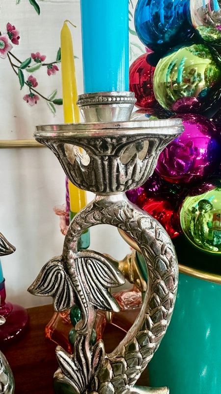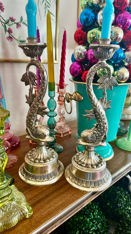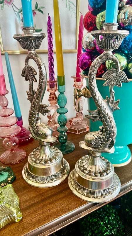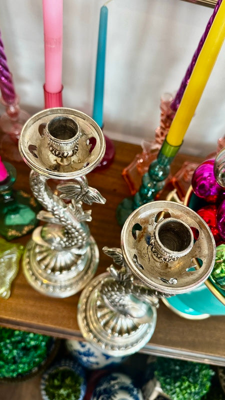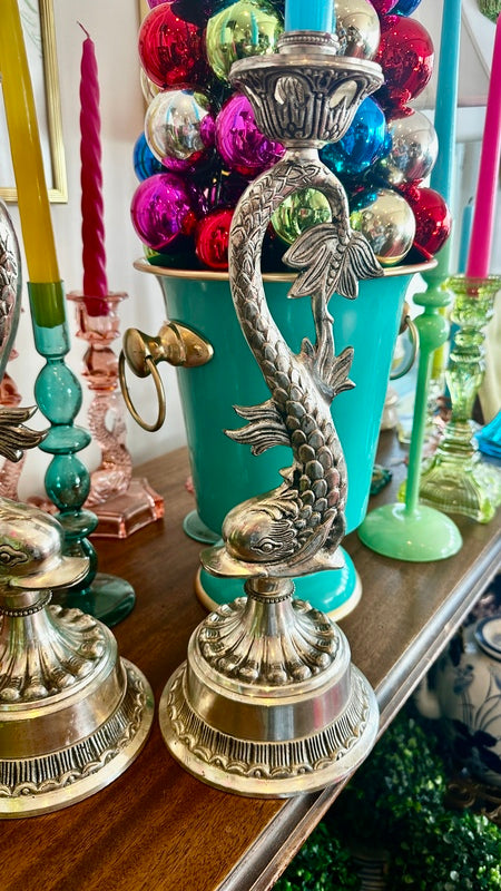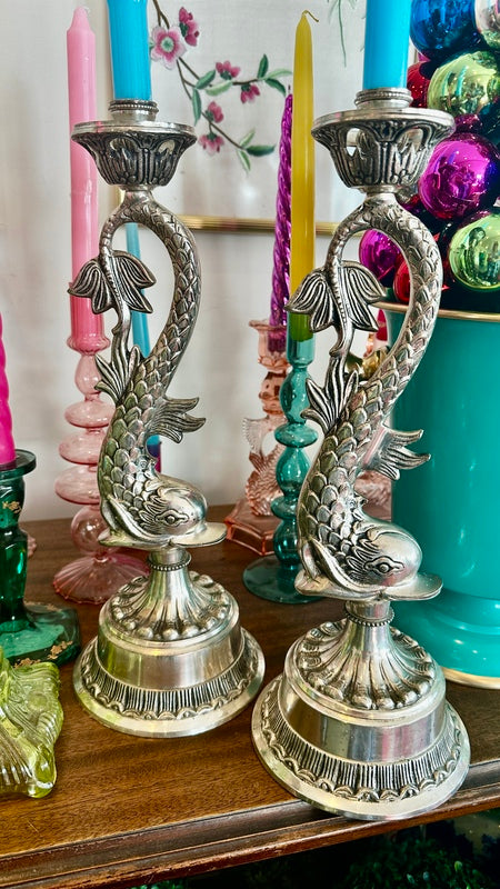 Bring a unique touch to your home decor with this pair of Vintage Silverplate Candle Holders, designed with intricate koi fish details. These elegant and whimsical candle holders add a touch of sophistication and charm to any room. They are oversized and make a huge impact to any table or buffet. They are nice and heavy with a felt bottom.