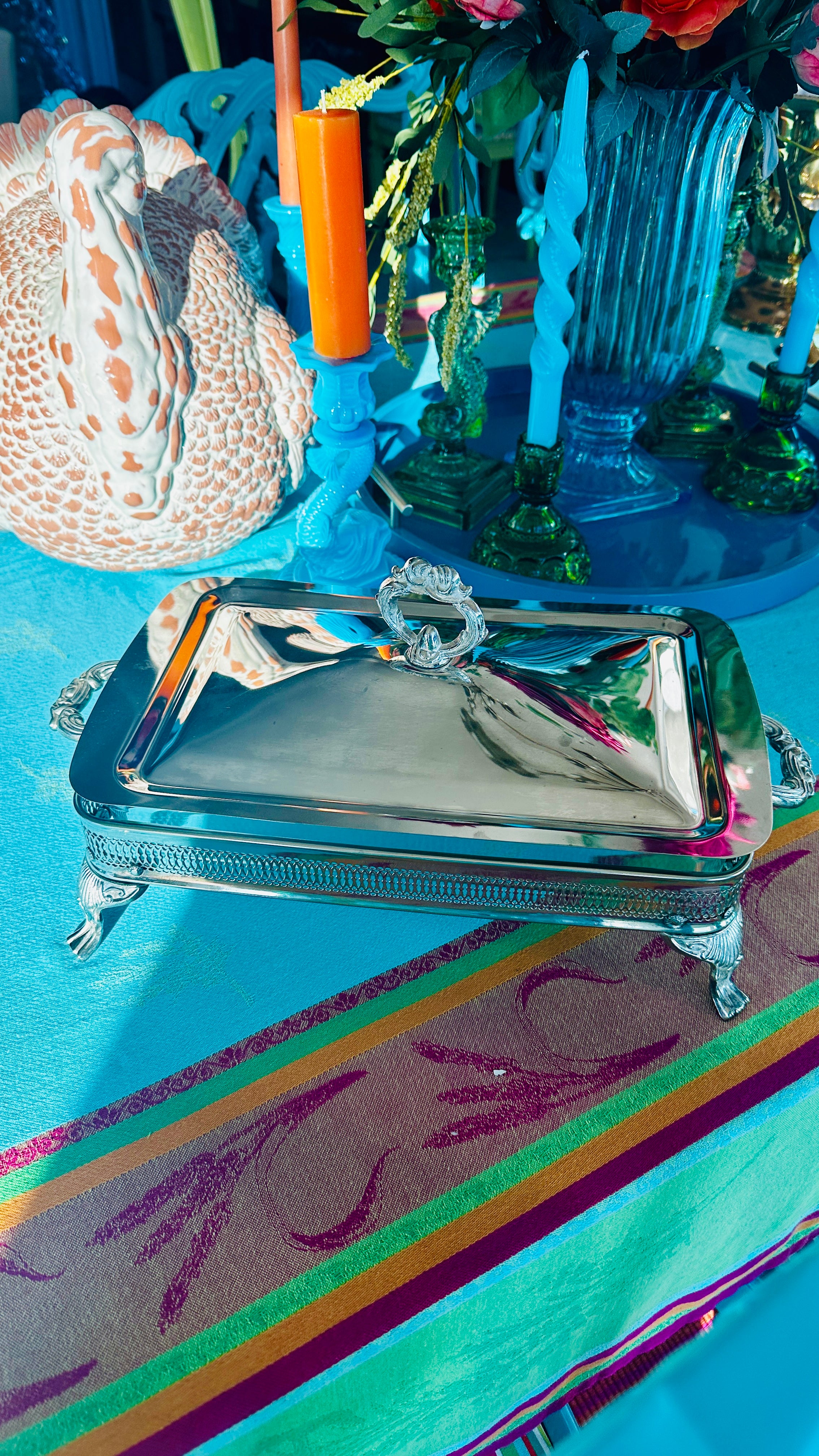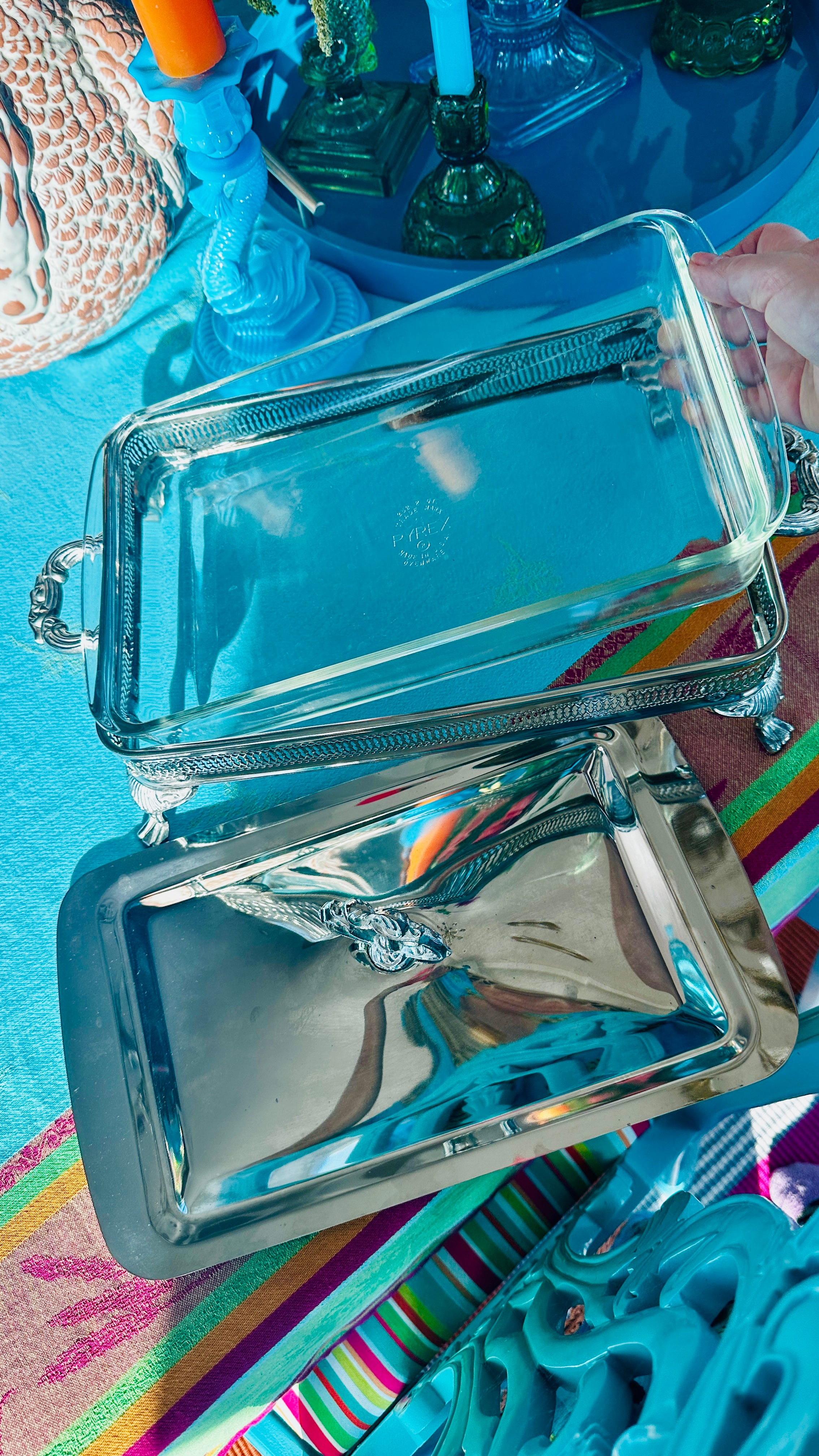 Vintage Silverplate Casserole Serving Piece with Lid, Rectangle, Pyrex Glass Insert Made in Hong Kong